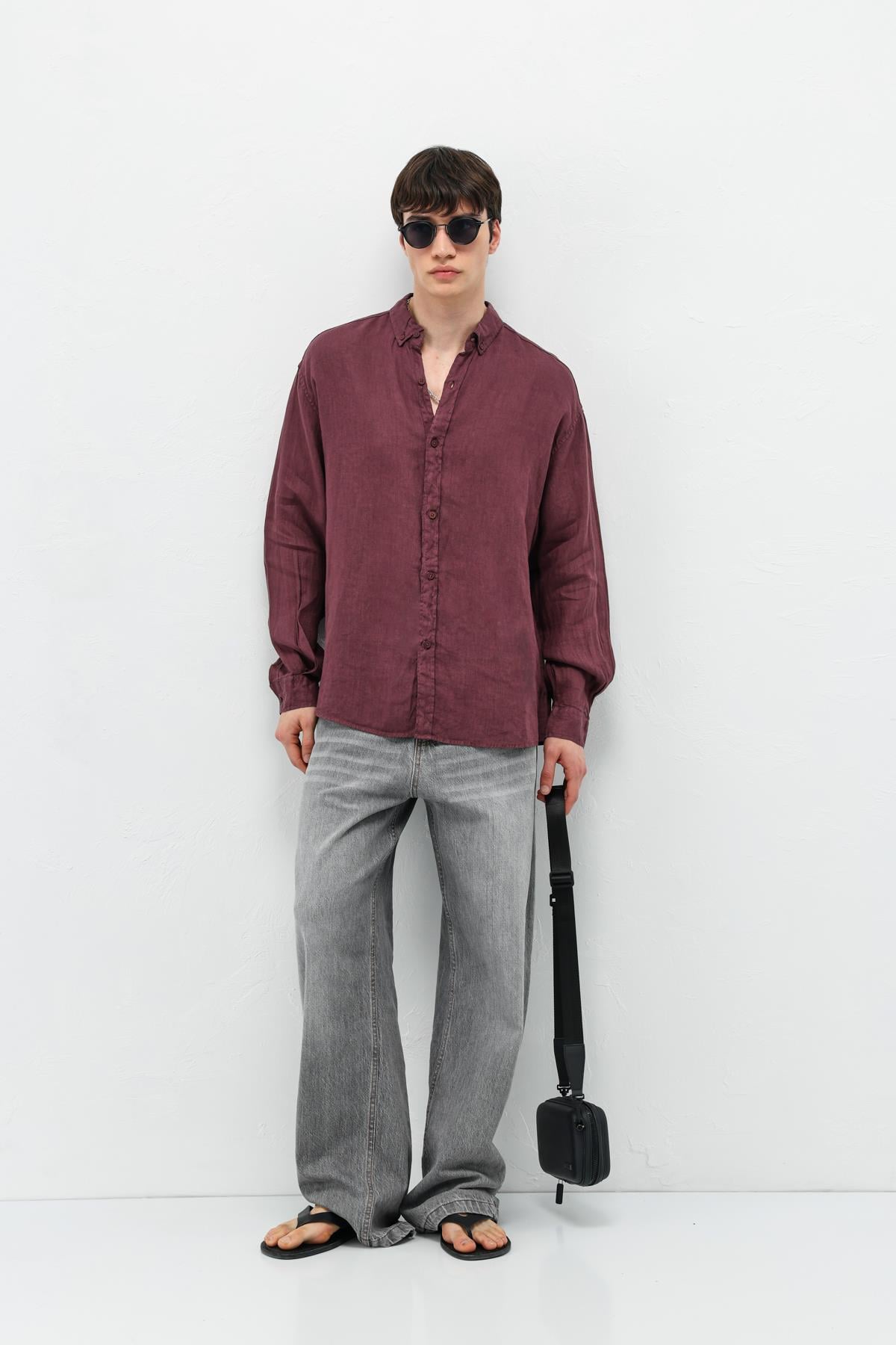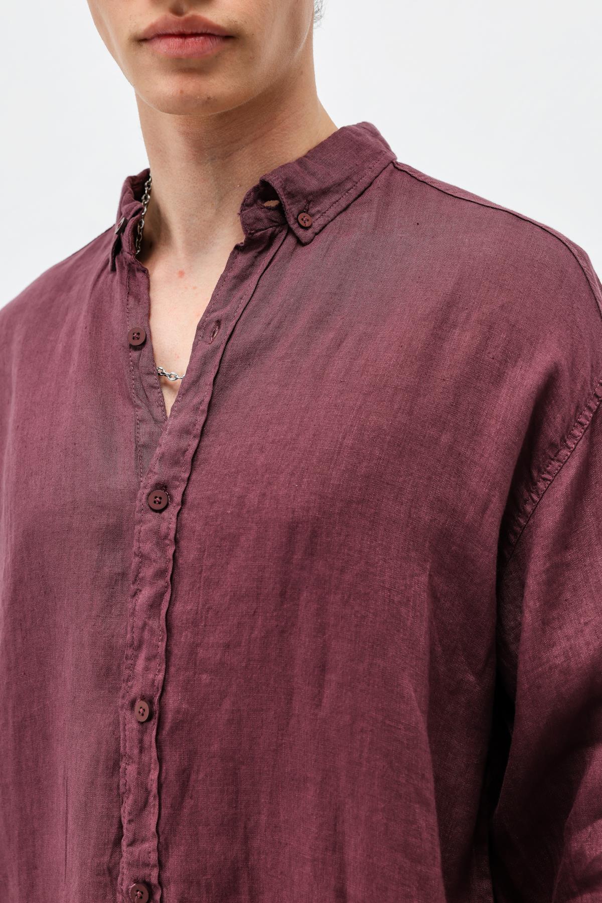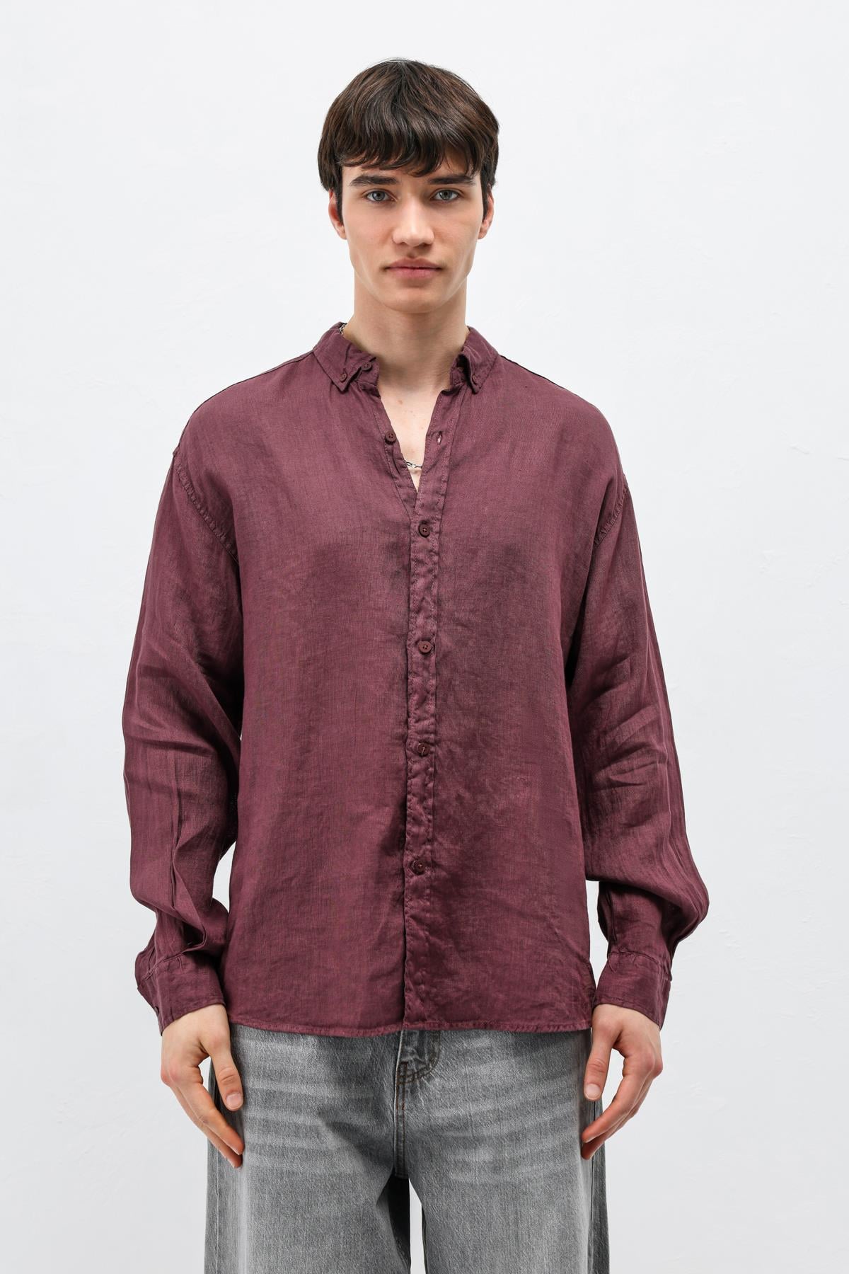 %100 Keten Oversize Uzun Kollu Gömlek Bordo (V40-64)
