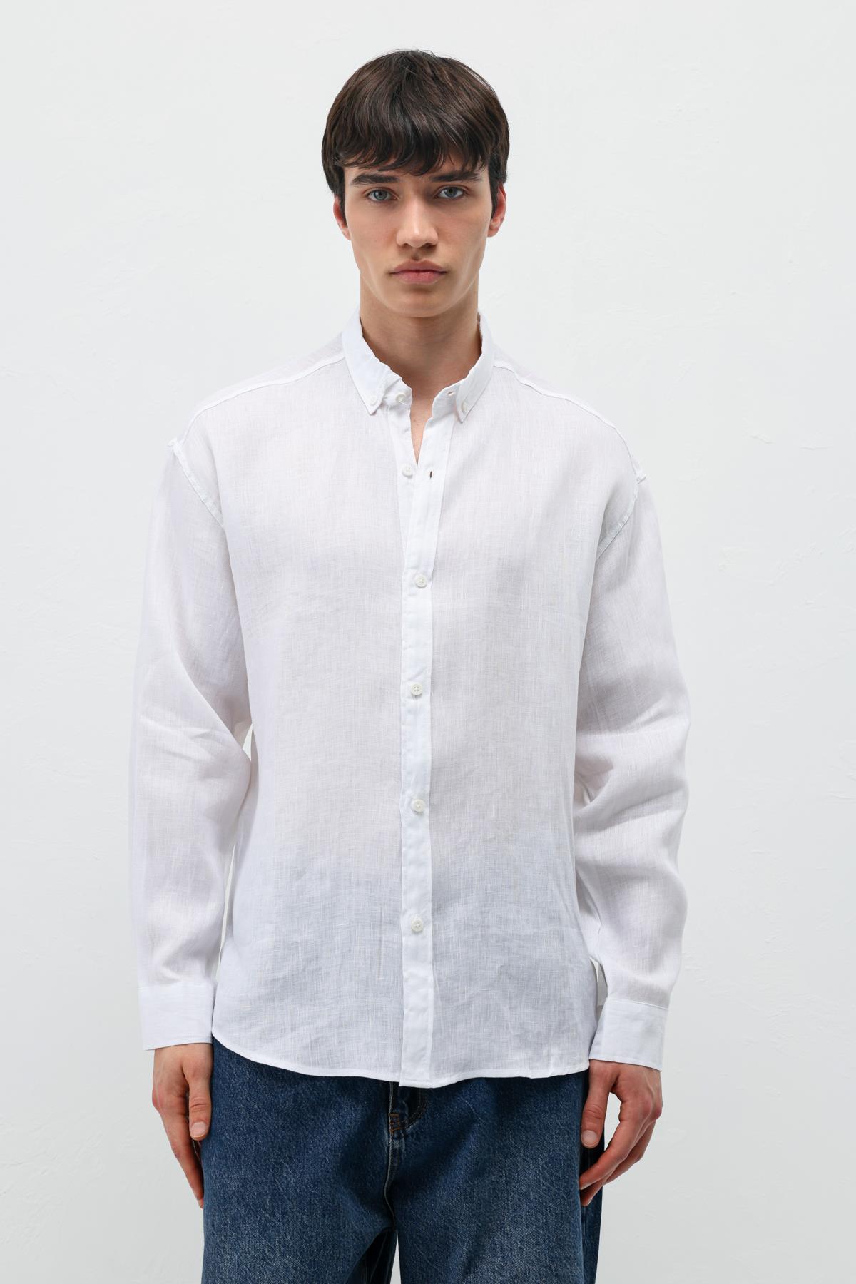 %100 Keten Oversize Uzun Kollu Gömlek Ekru (V40-64)