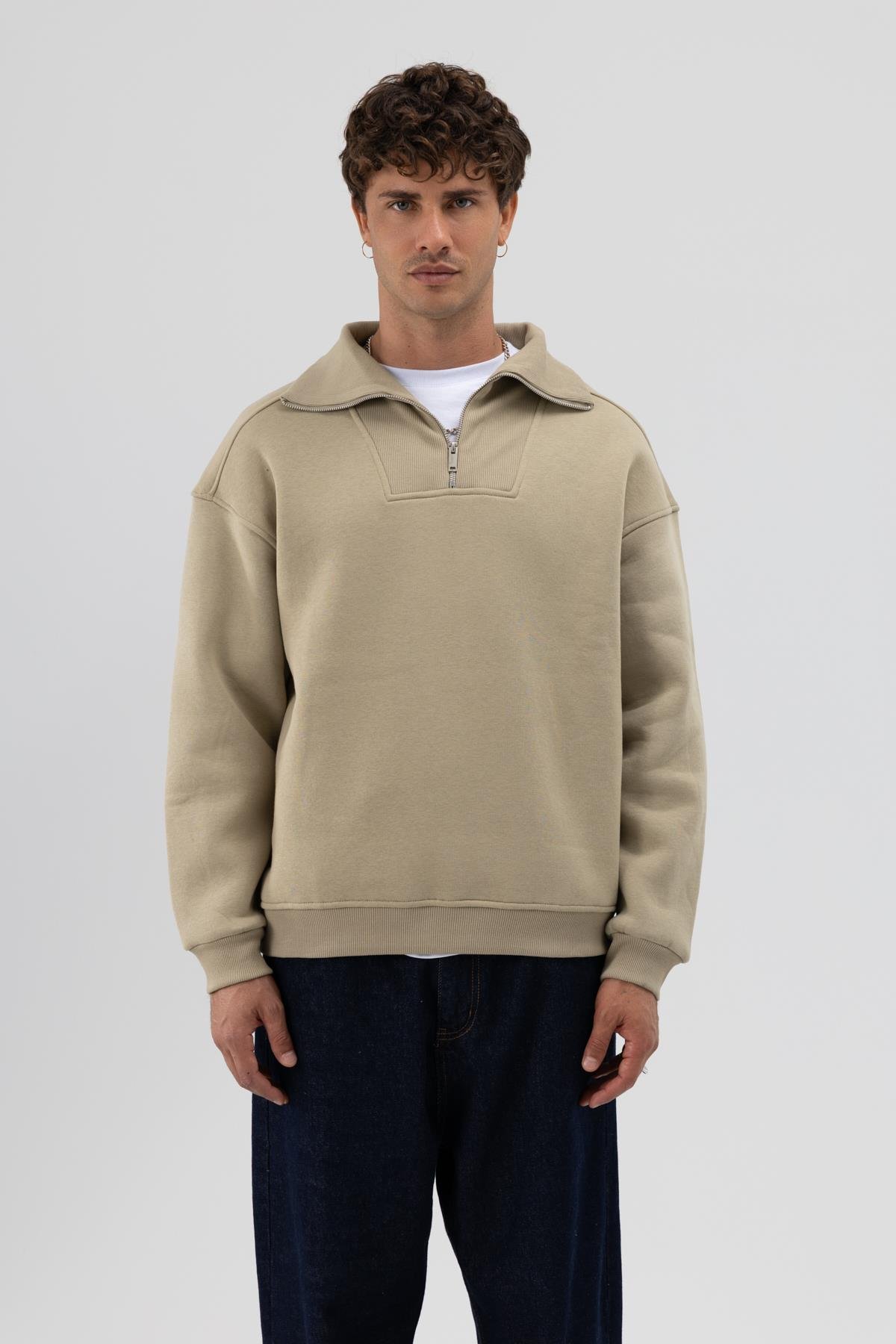 Basic Fermuarlı Dik Yaka Sweatshirt Haki (V70-81)
