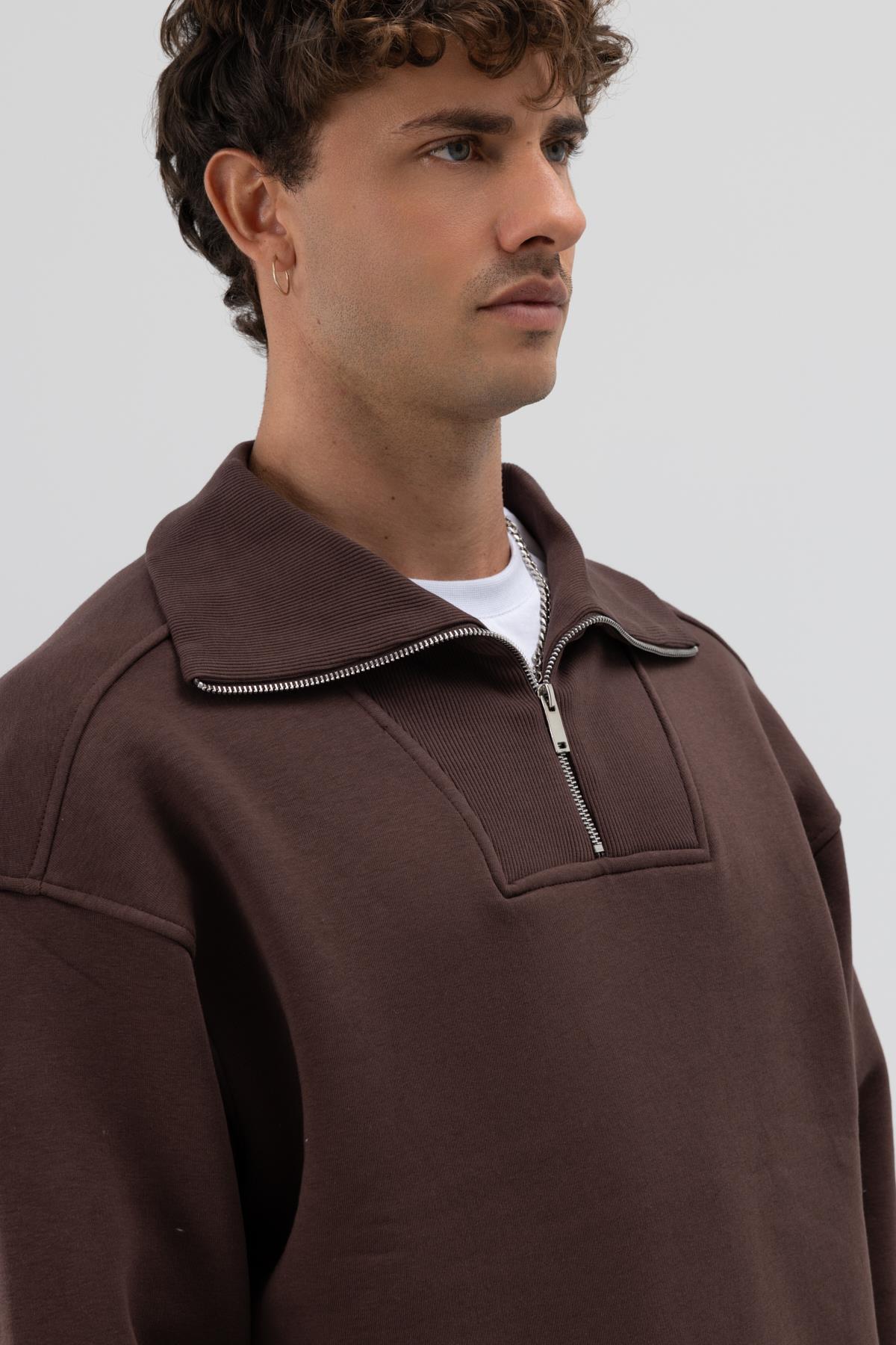 Basic Fermuarlı Dik Yaka Sweatshirt Kahve (V70-81)