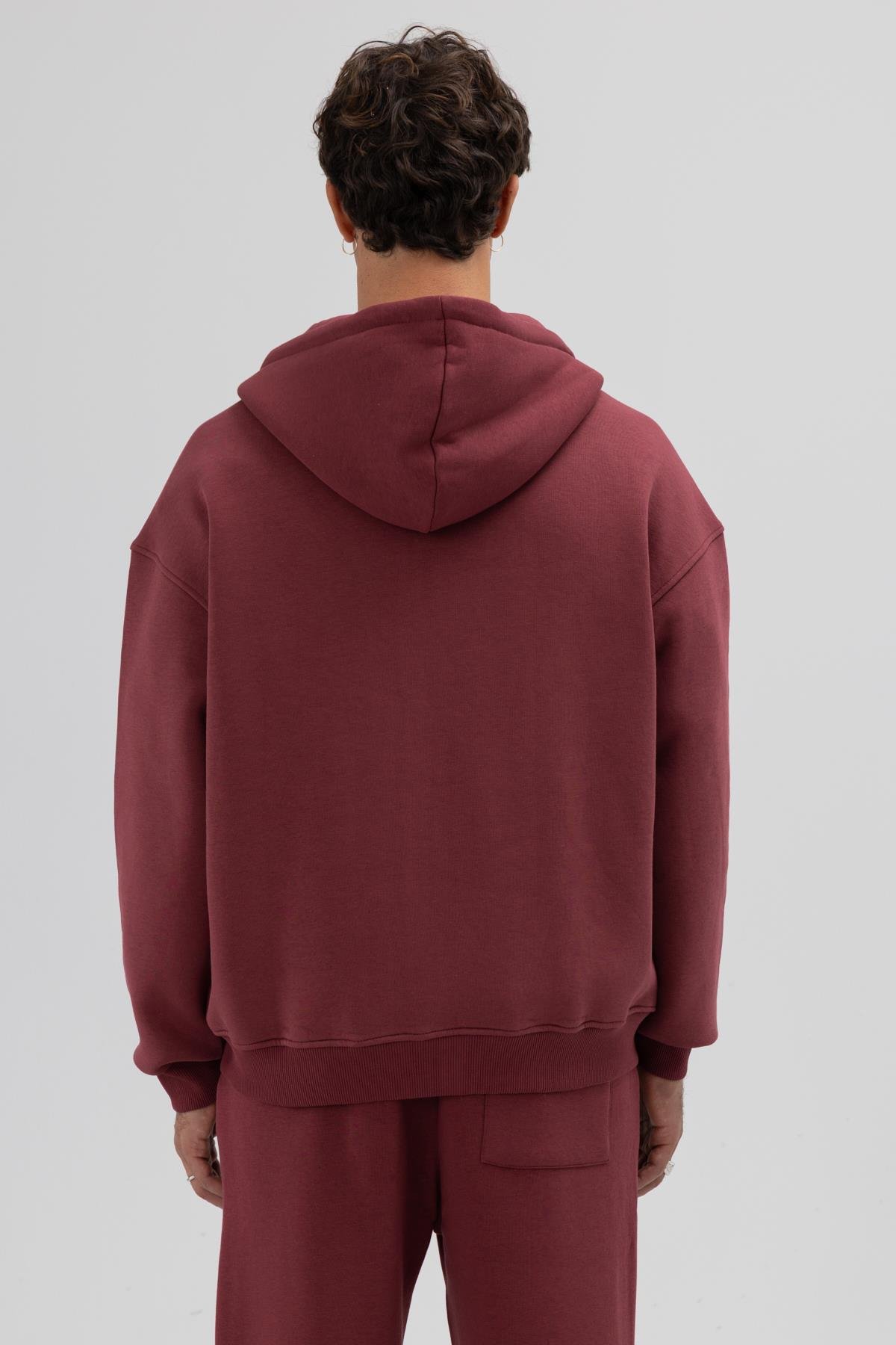 Basic Fermuarlı Oversize Kapüşonlu Sweatshirt Bordo (V70-78)
