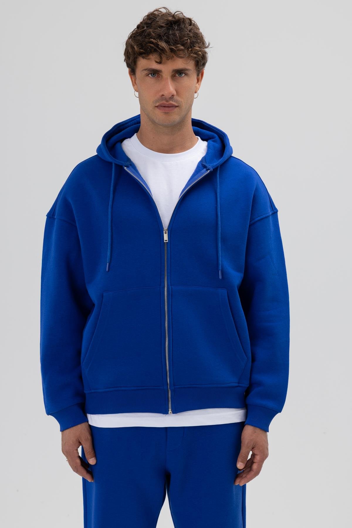 Basic Fermuarlı Oversize Kapüşonlu Sweatshirt Saks (V70-78)