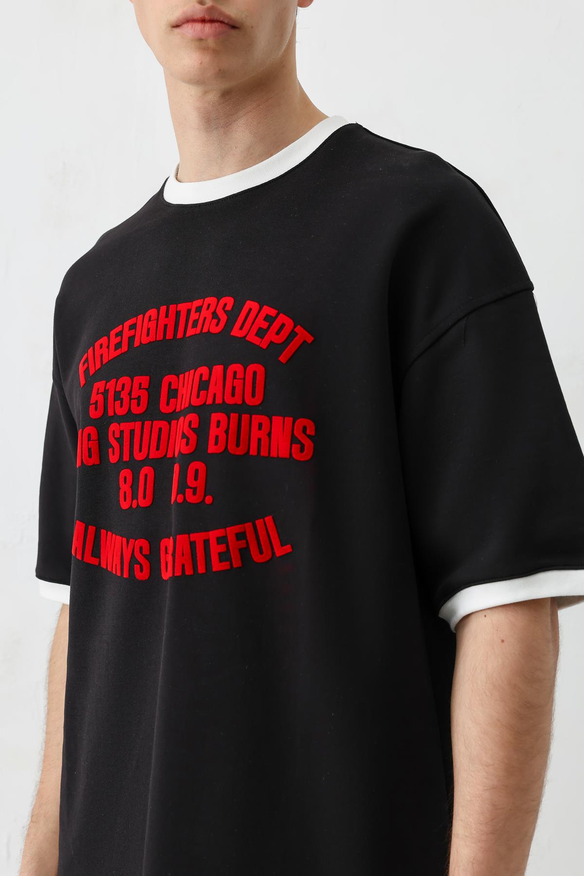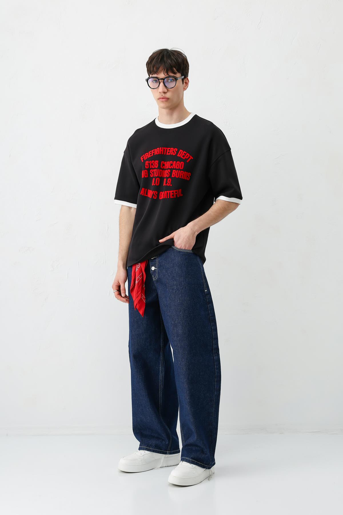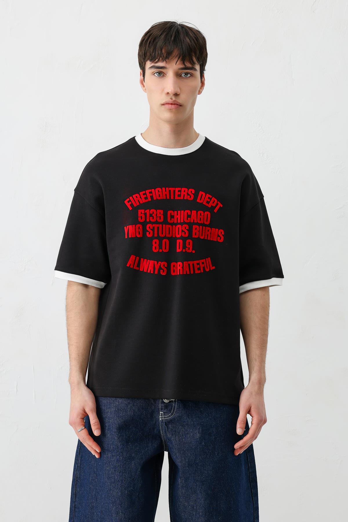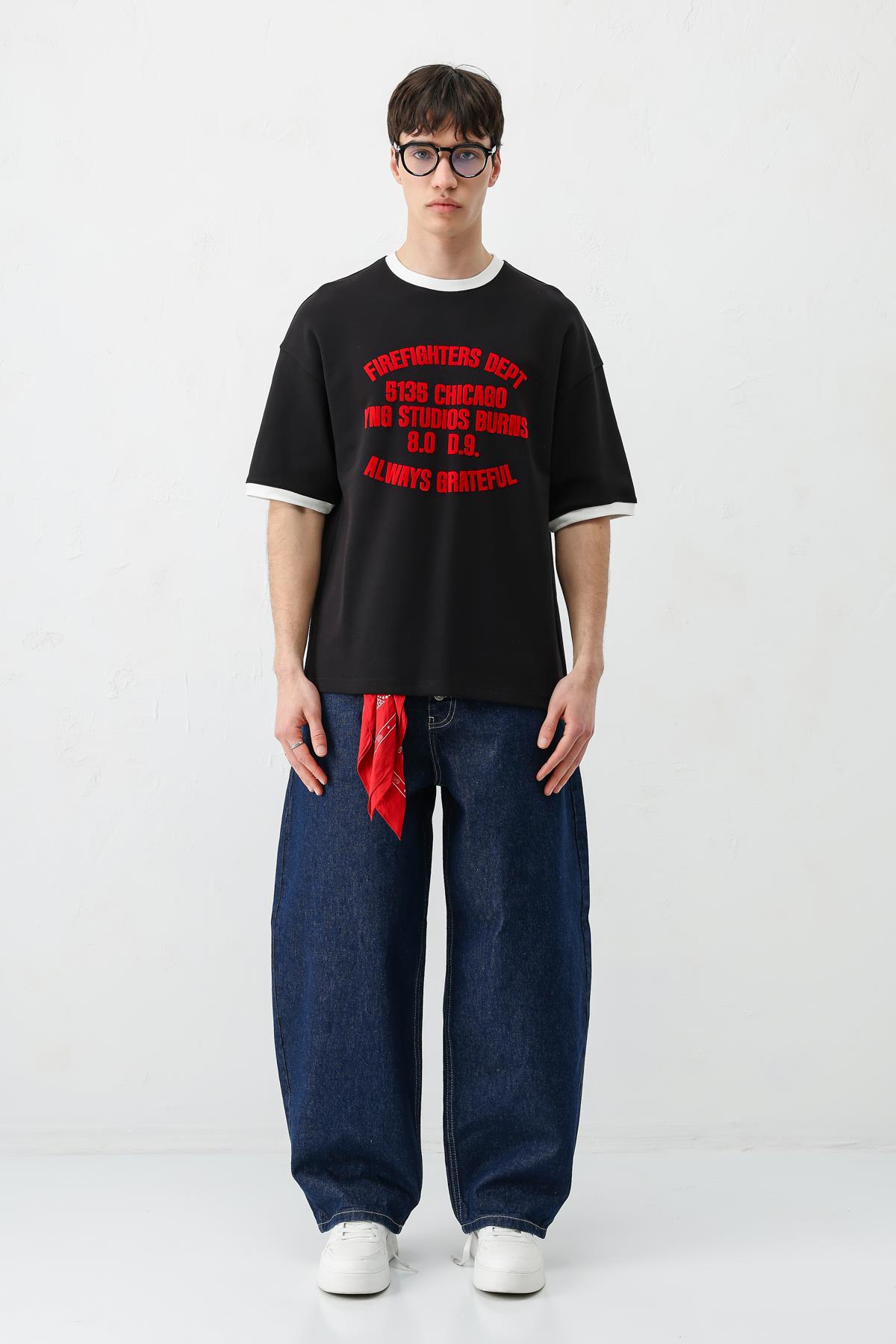 Baskılı Bisiklet Yaka Oversize Tişört Siyah (V70-157)