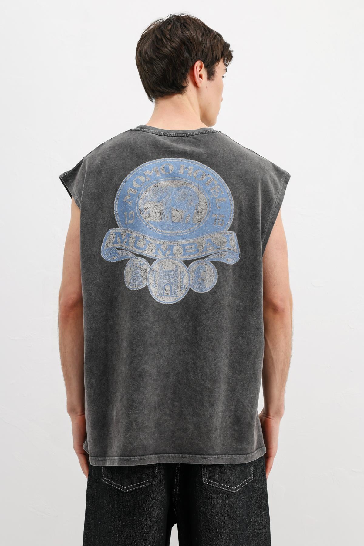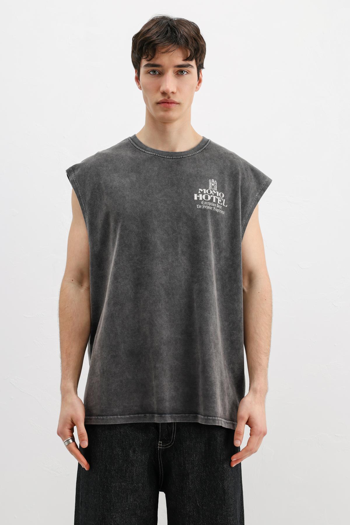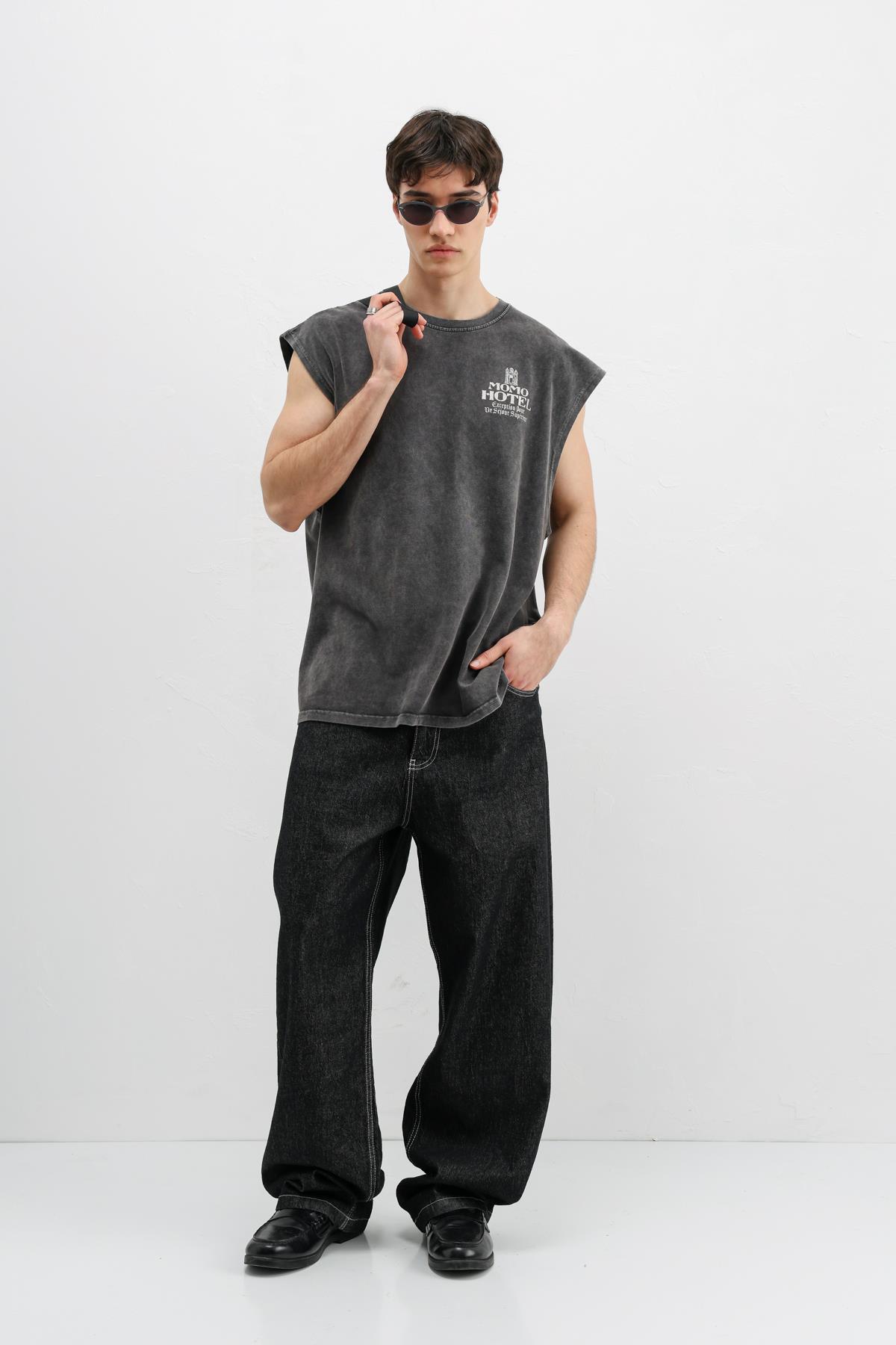 Baskılı Kolsuz Oversize Tişört Siyah (V70-164)