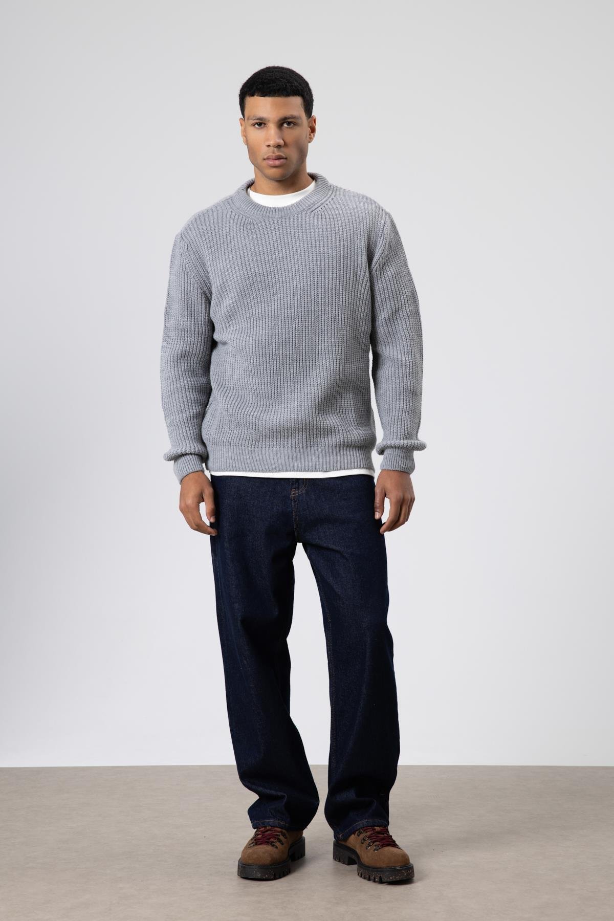 Bisiklet Yaka Oversize Triko Kazak Gri Melanj (V60-10)