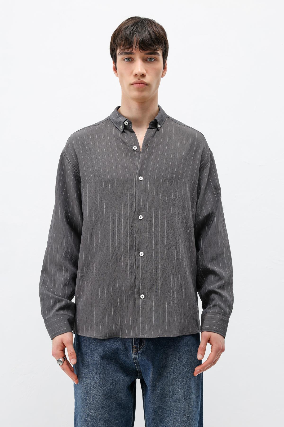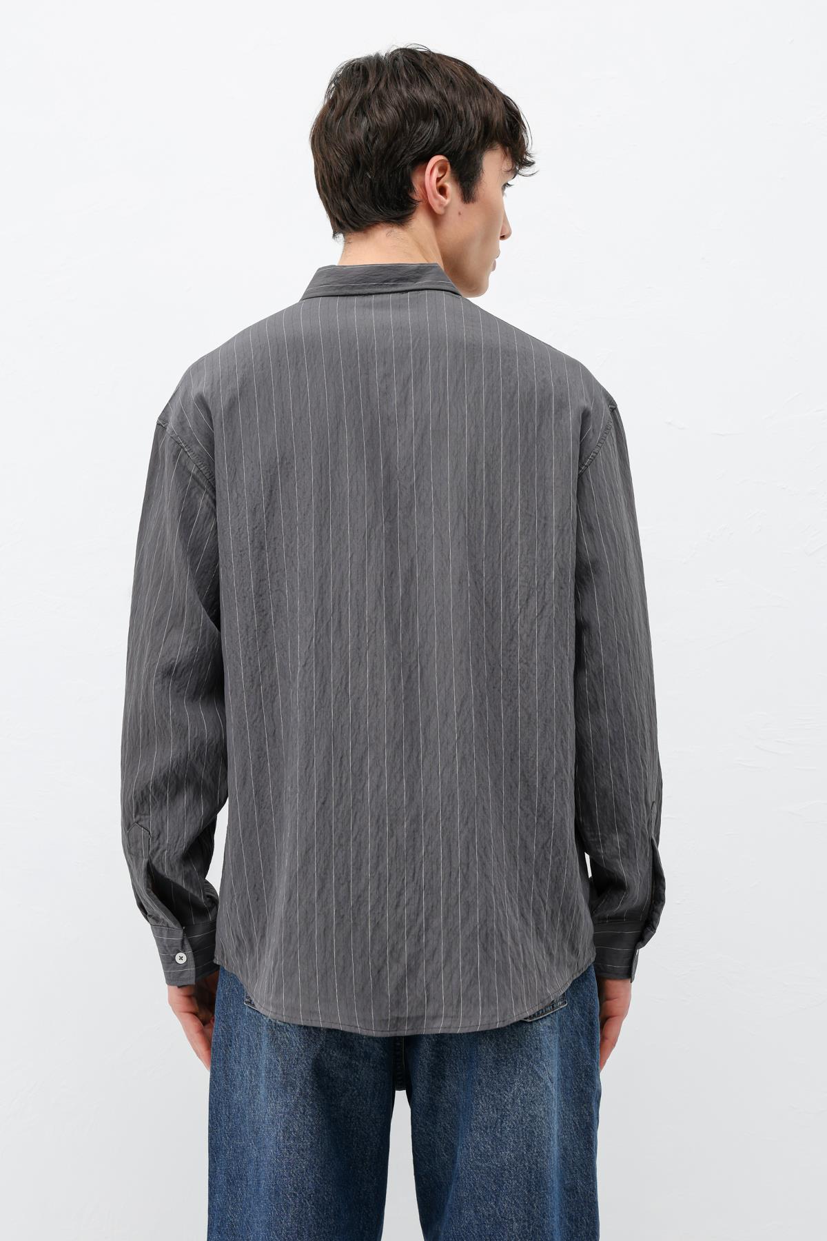Çizgili Müslin Kumaş Oversize Gömlek Antrasit (V40-105)