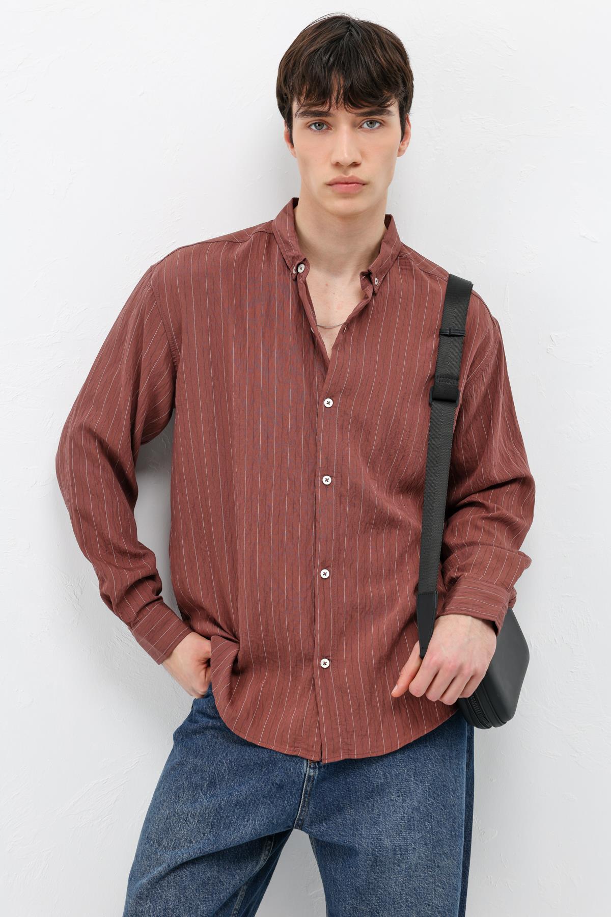 Çizgili Müslin Kumaş Oversize Gömlek Bordo (V40-105)
