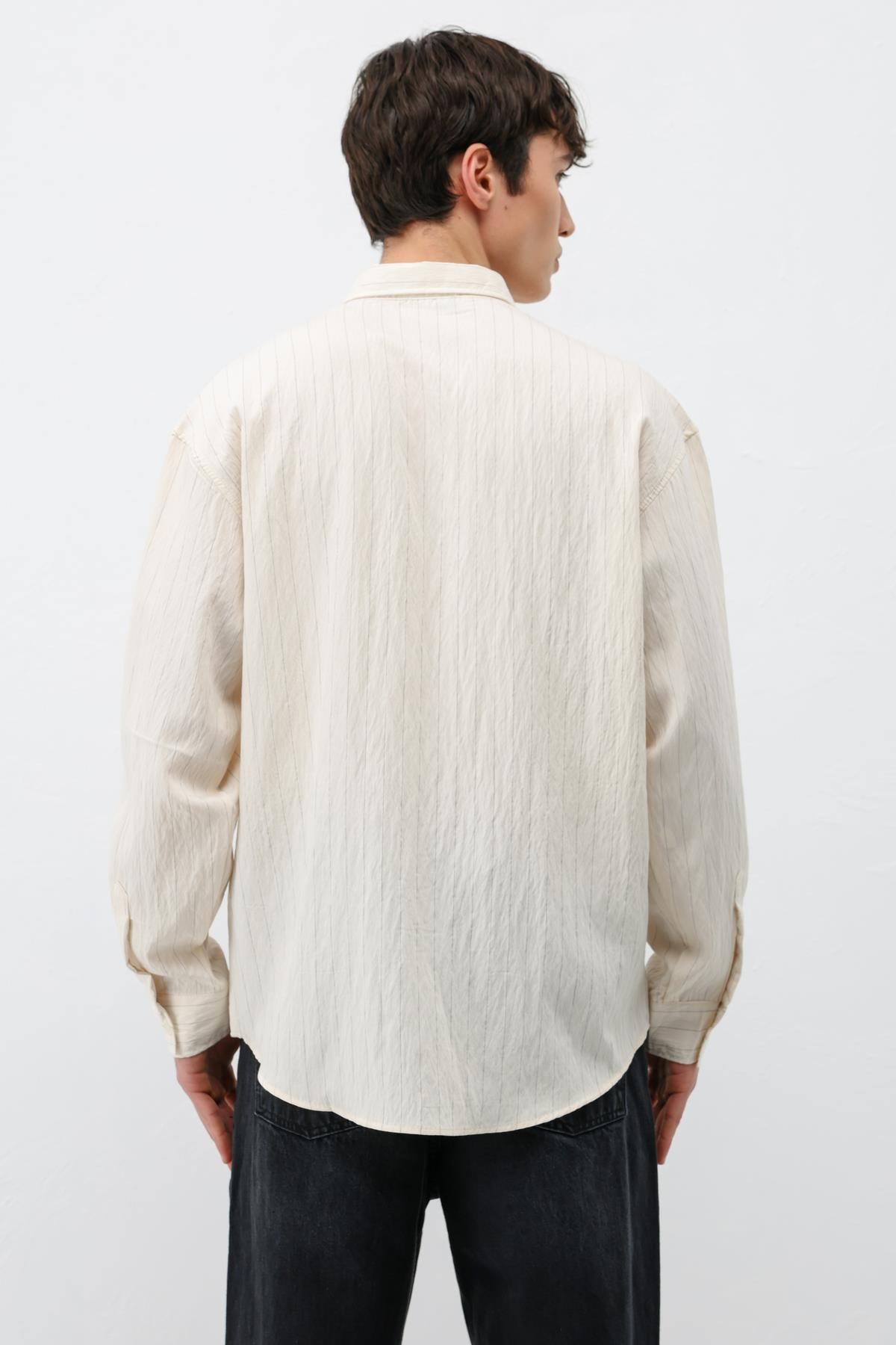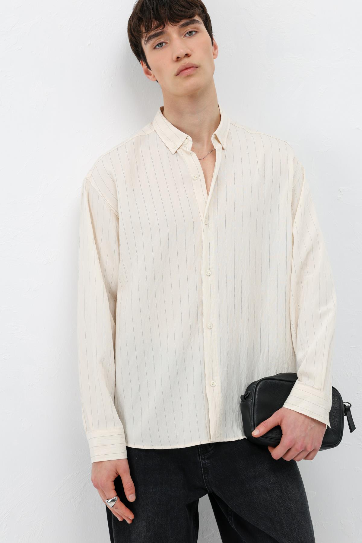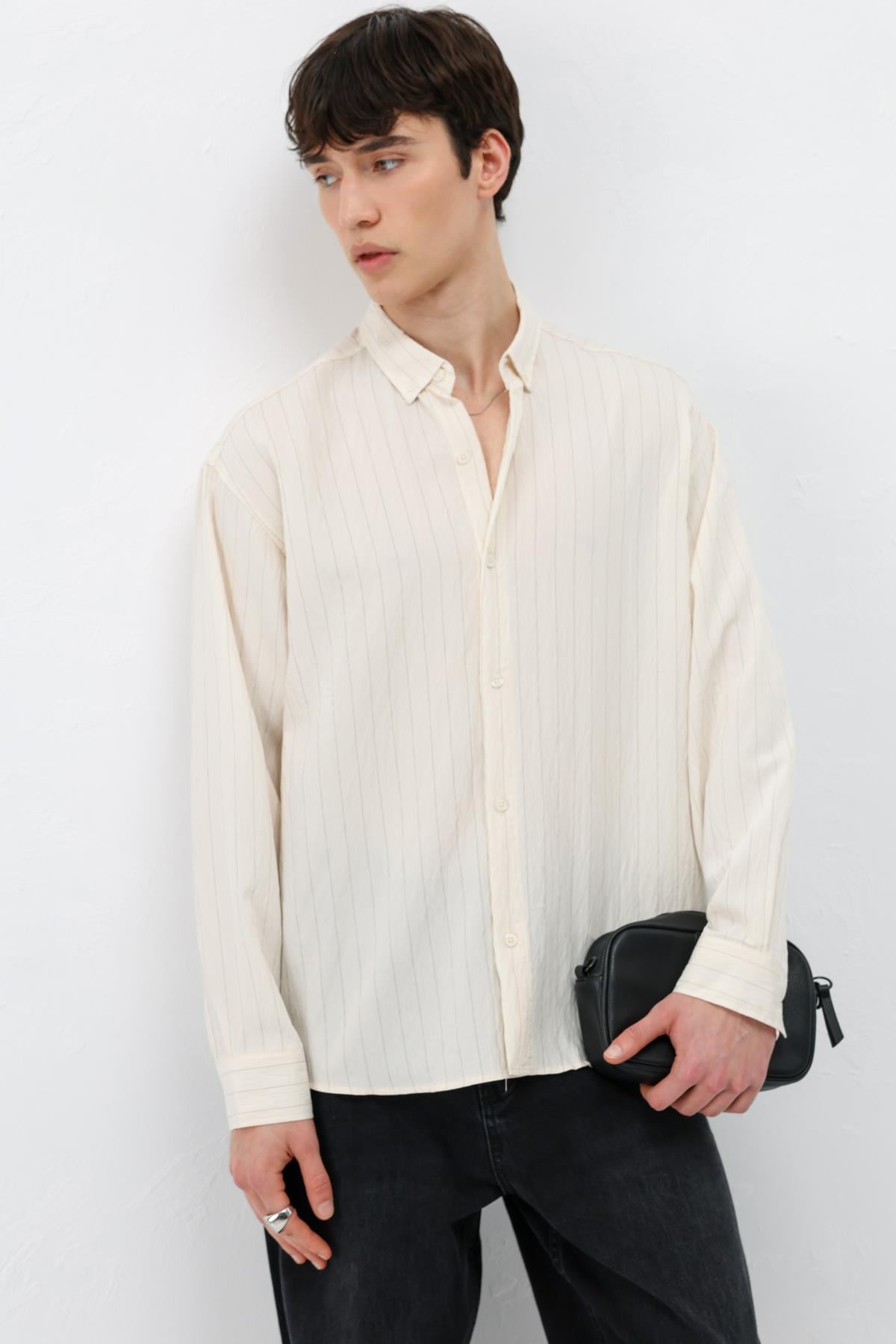 Çizgili Müslin Kumaş Oversize Gömlek Krem (V40-105)
