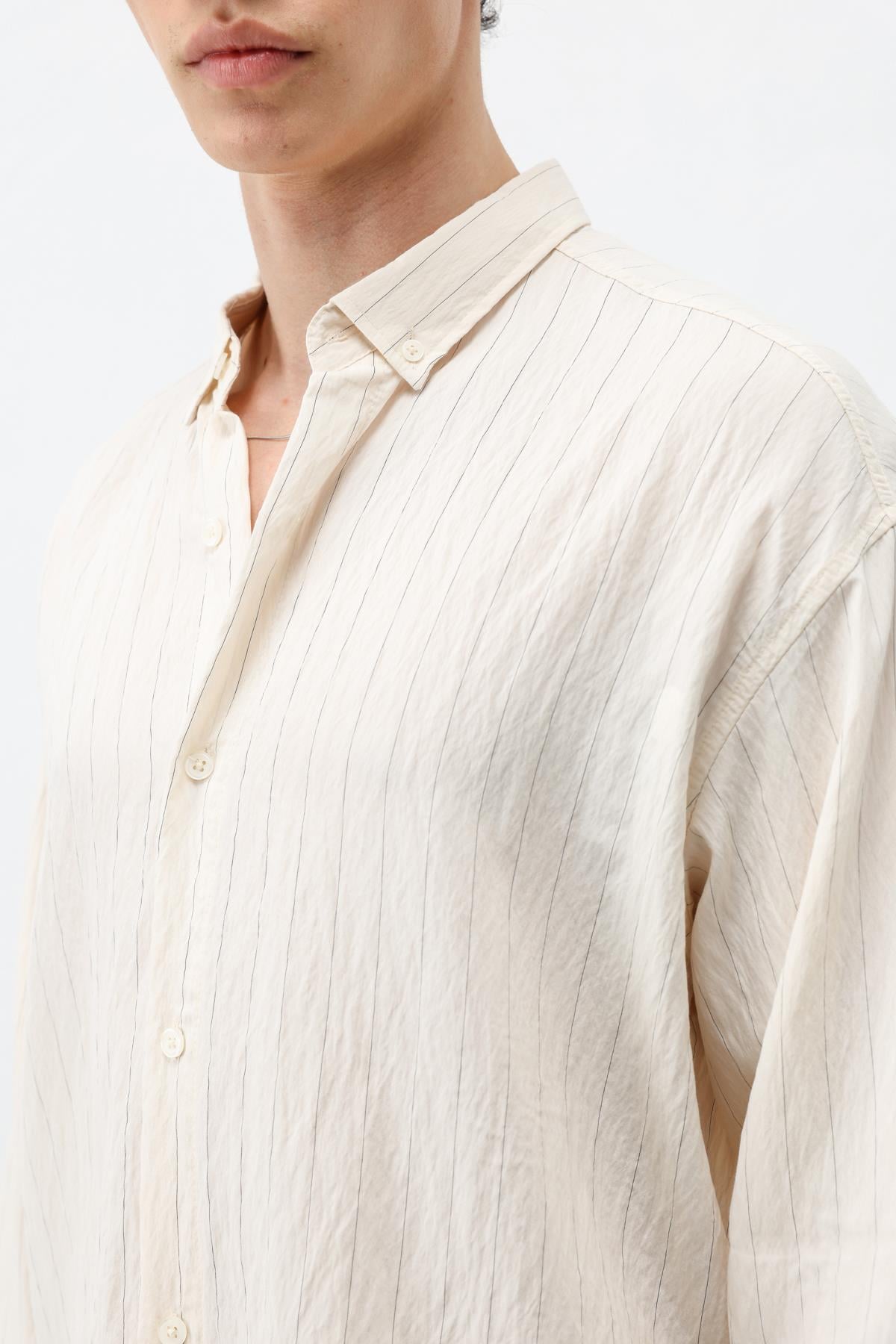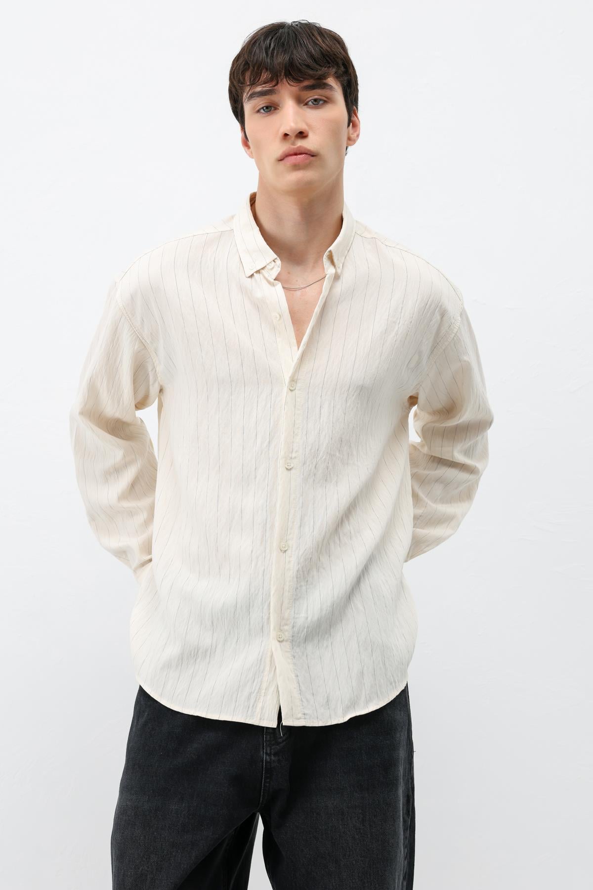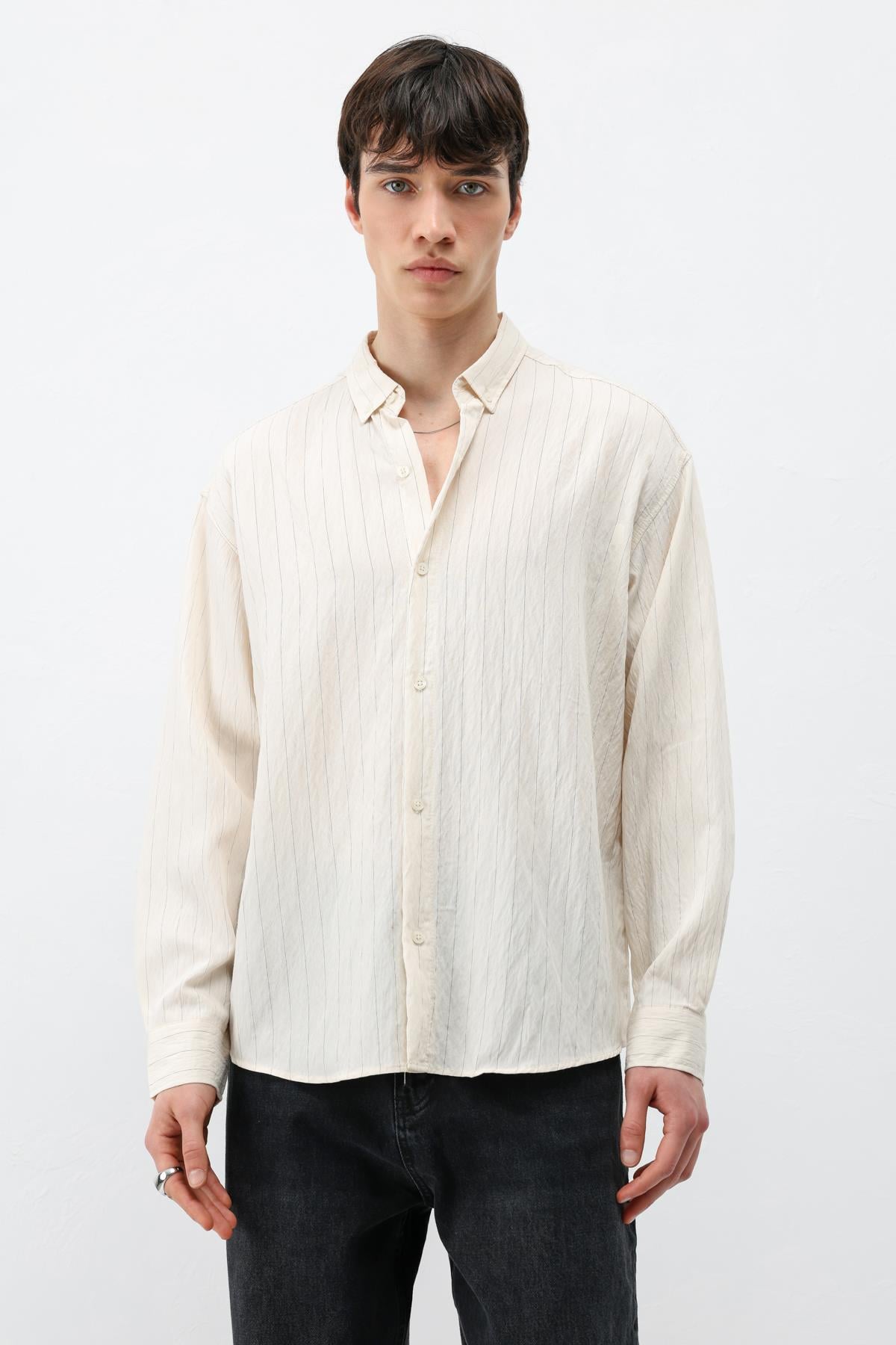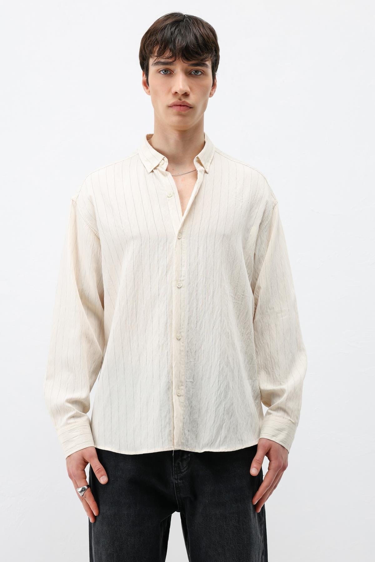 Çizgili Müslin Kumaş Oversize Gömlek Krem (V40-105)
