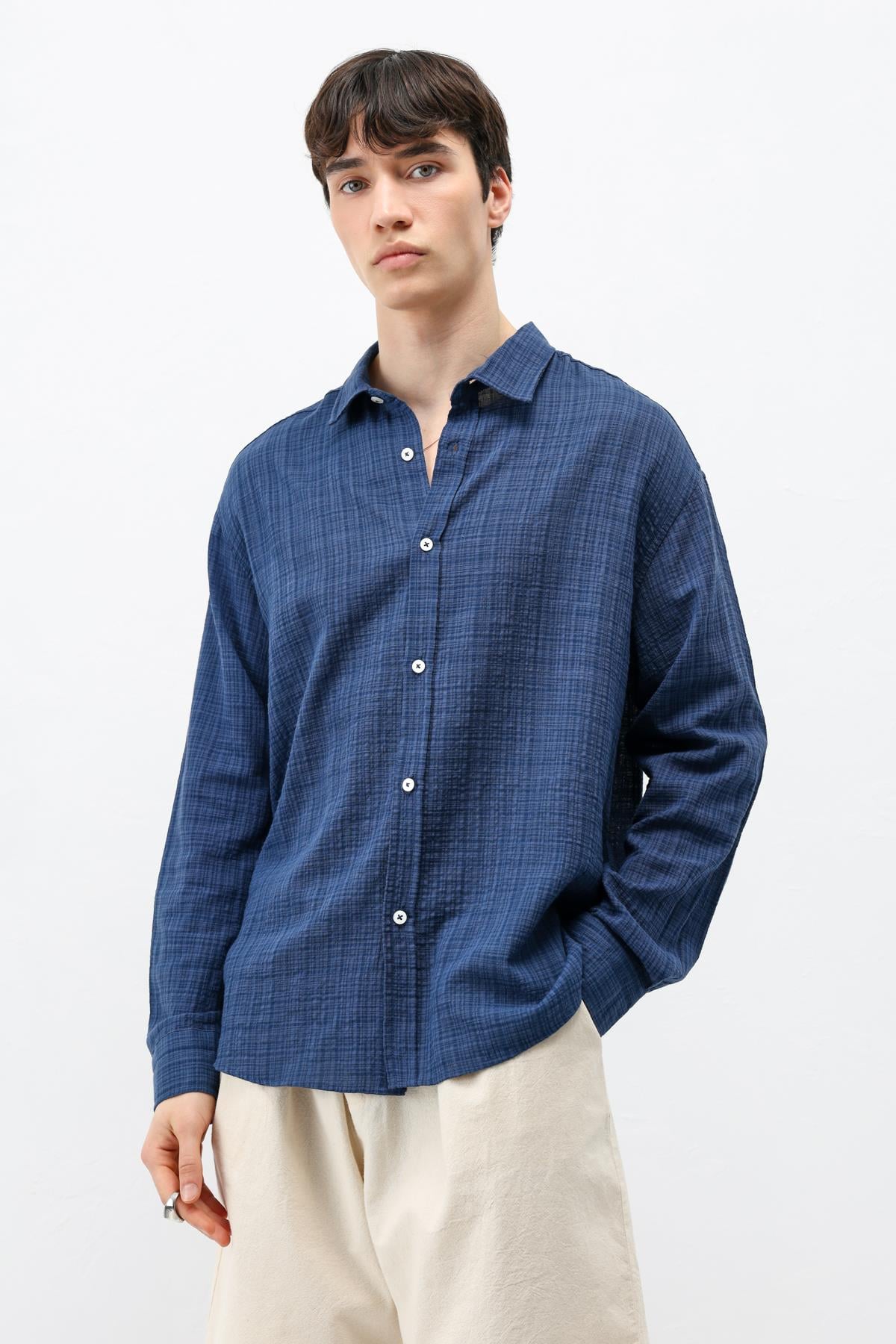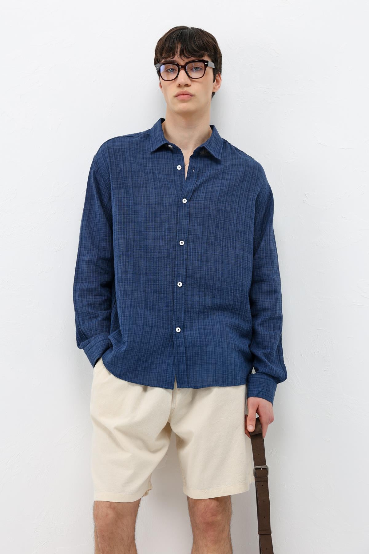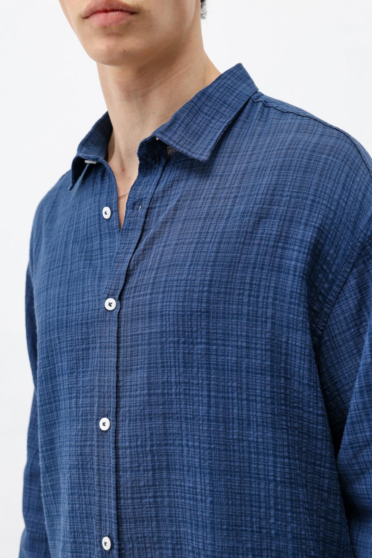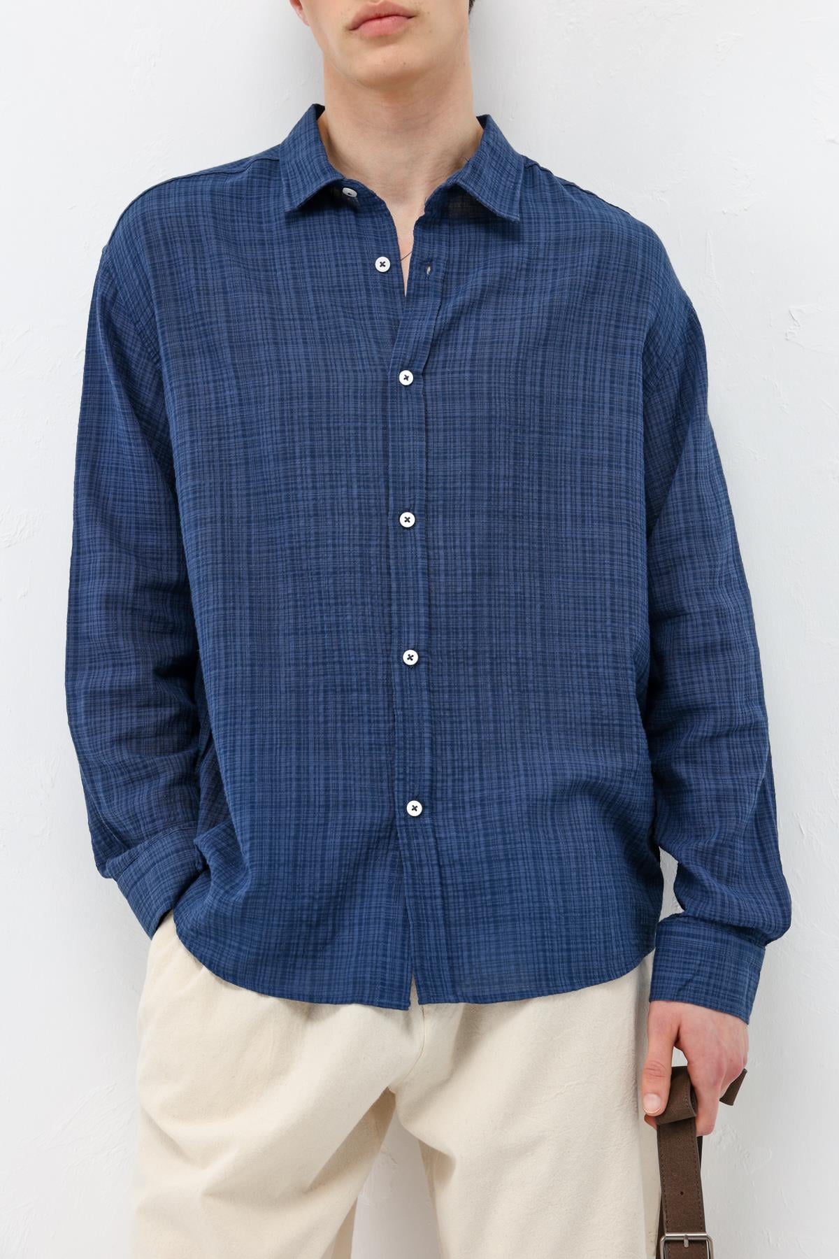 Dokulu Keten Görünümlü Oversize Gömlek Lacivert (V40-85)