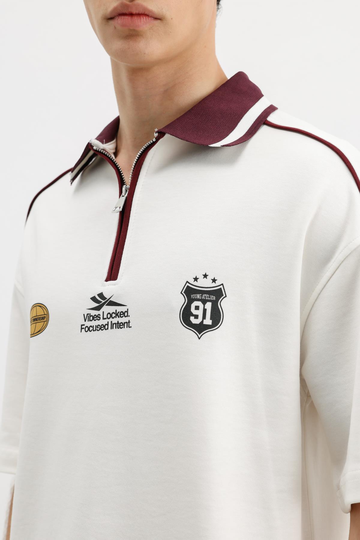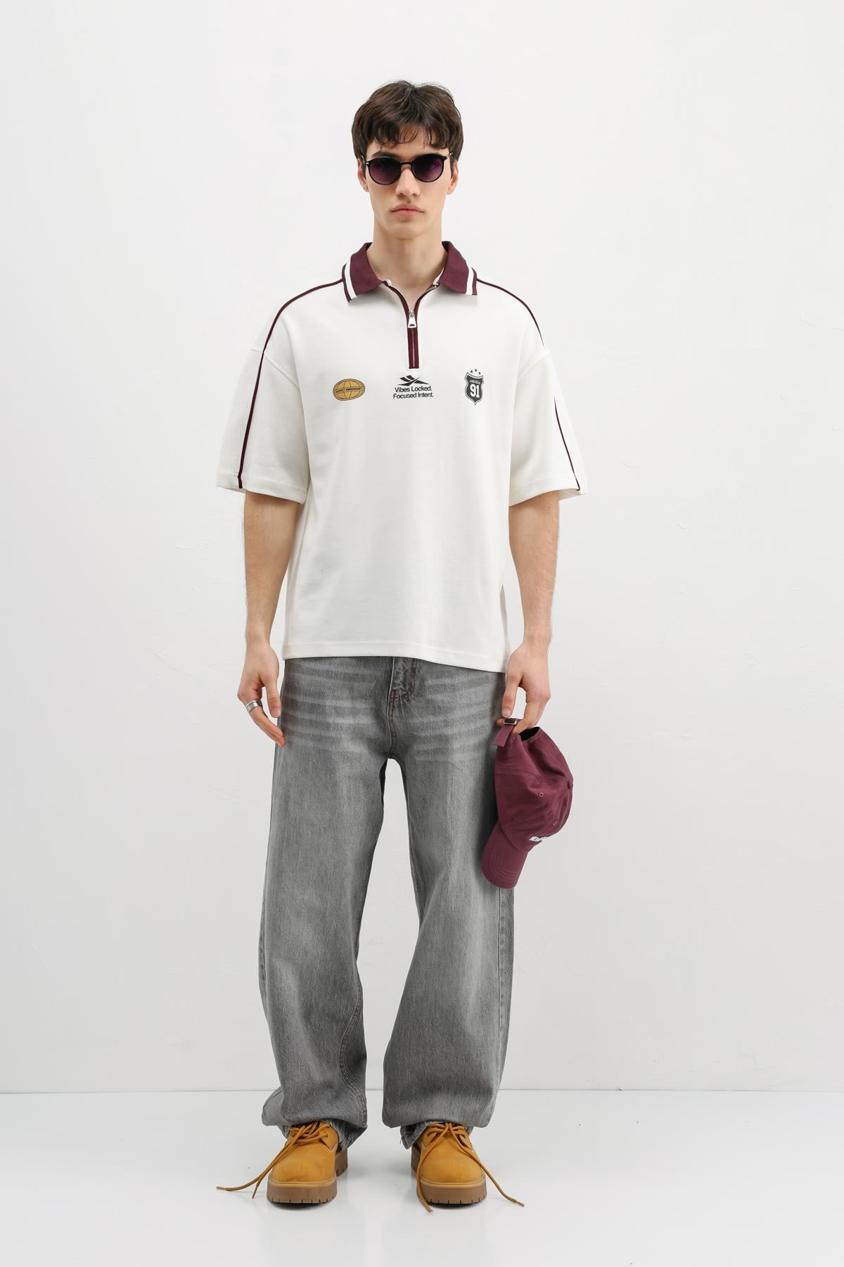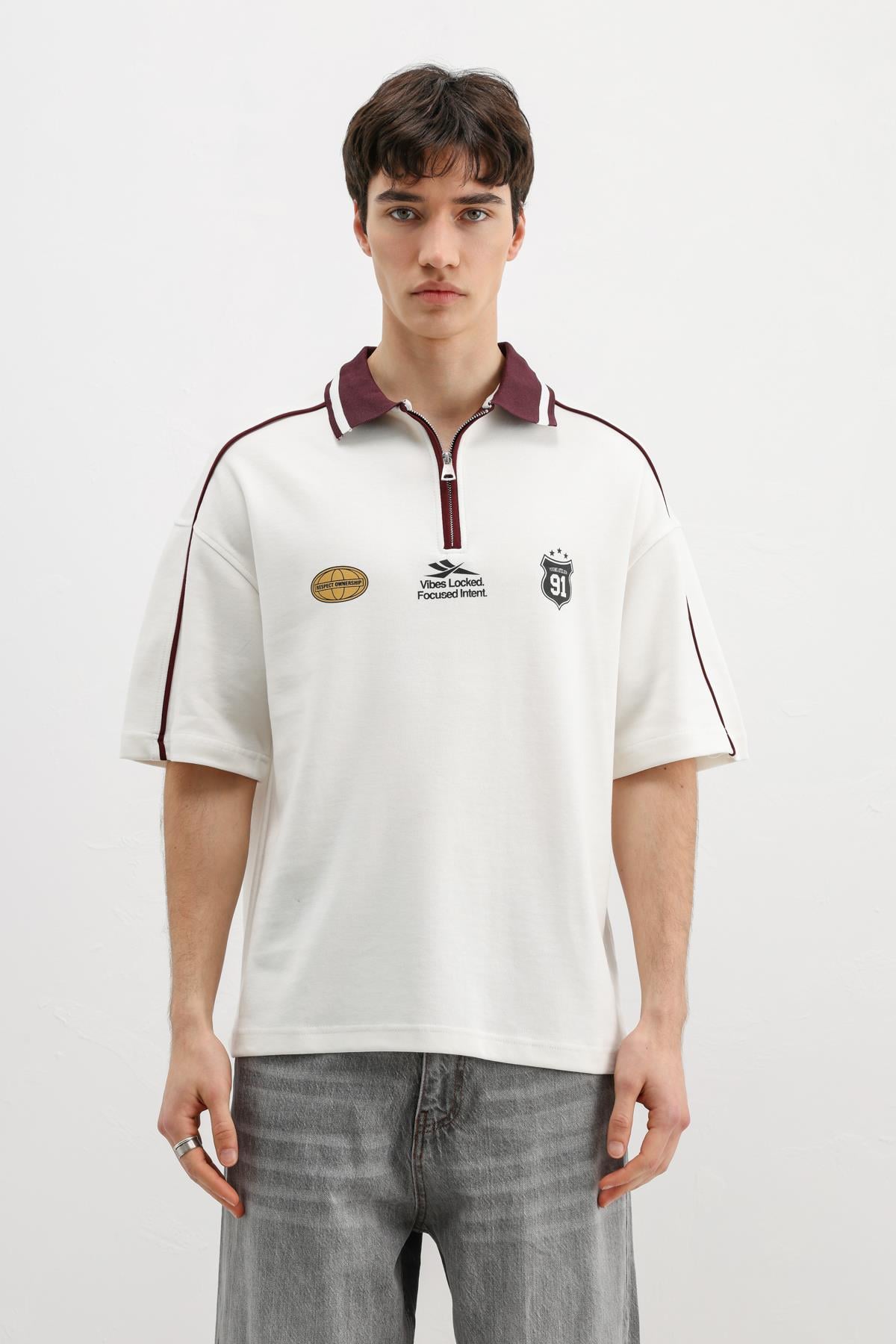 Fermuarlı Yaka Baskılı Oversize Tişört Ekru (V70-166)