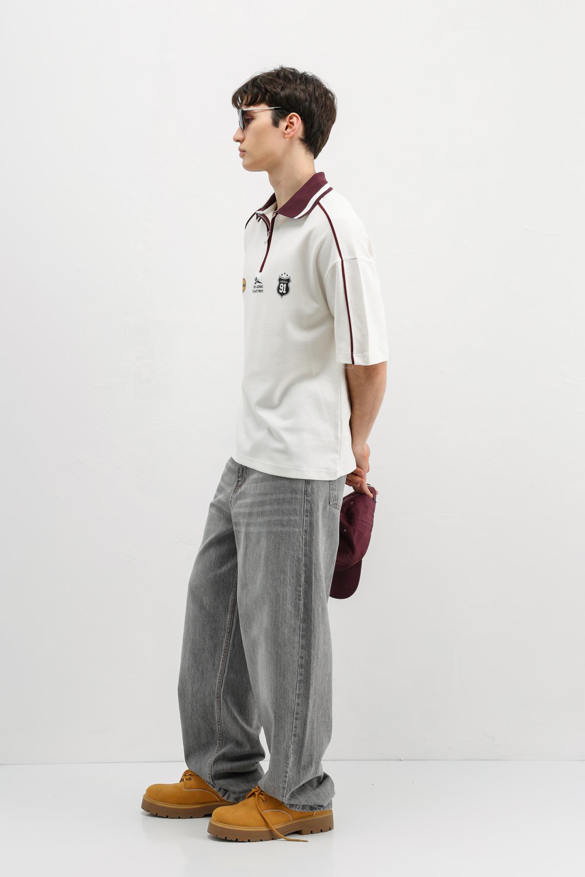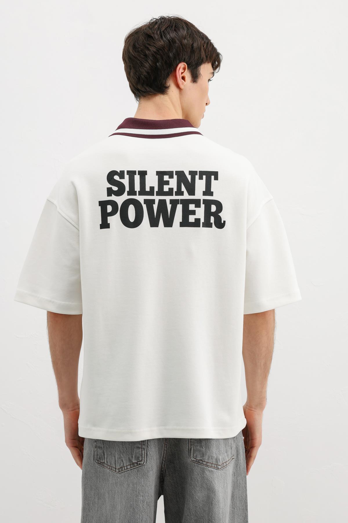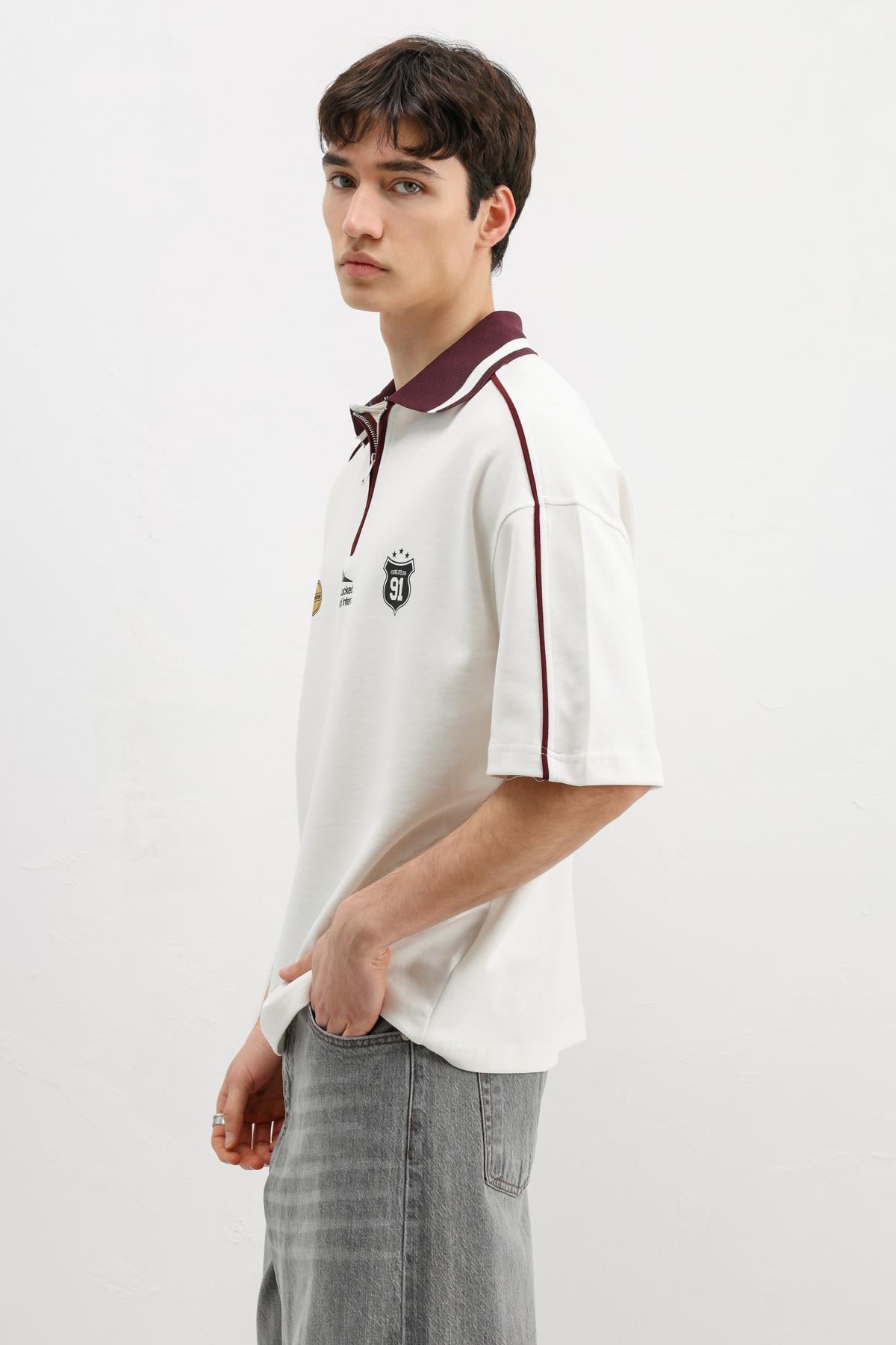 Fermuarlı Yaka Baskılı Oversize Tişört Ekru (V70-166)