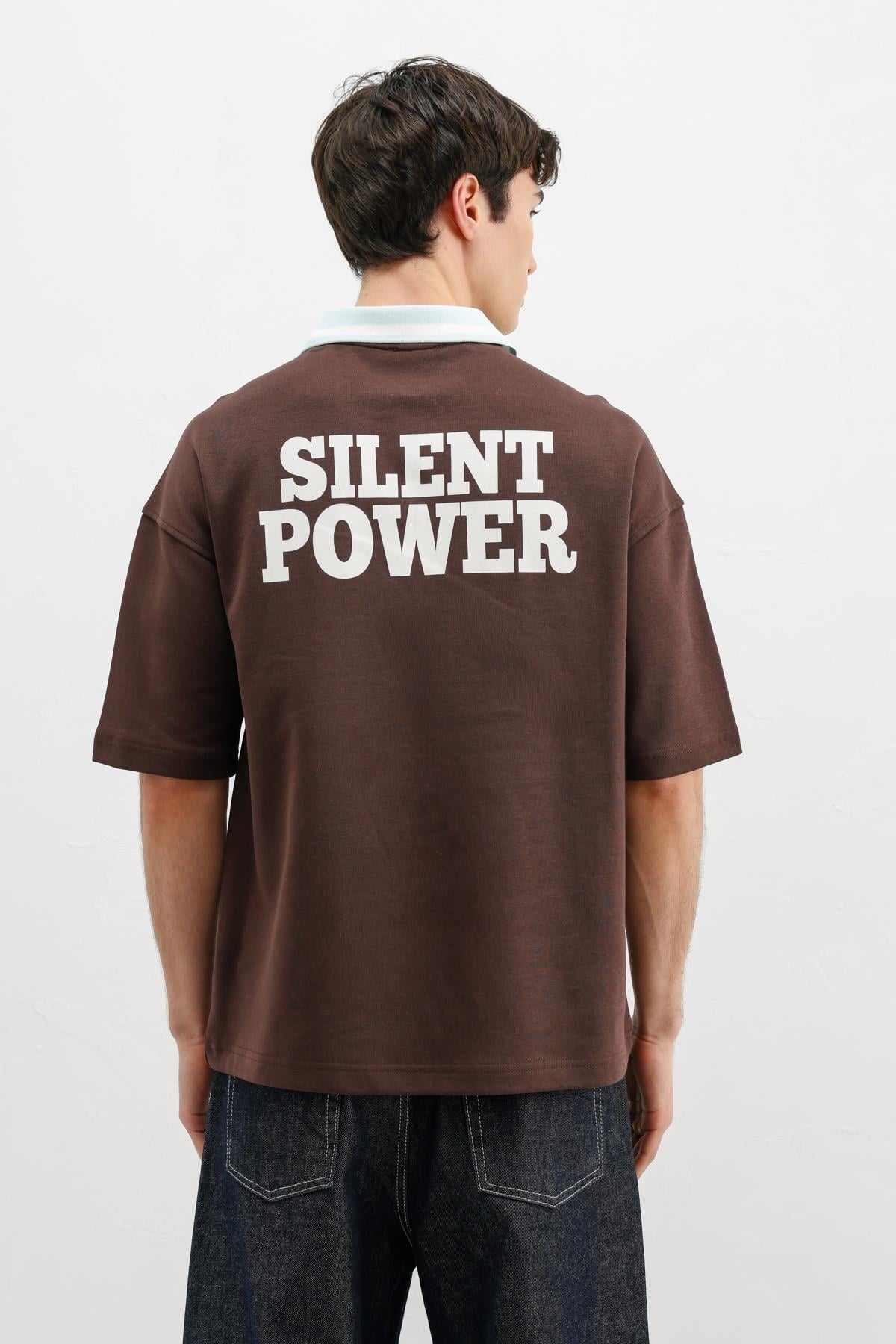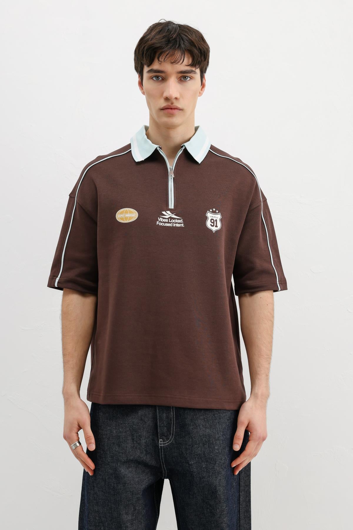 Fermuarlı Yaka Baskılı Oversize Tişört Kahve (V70-166)