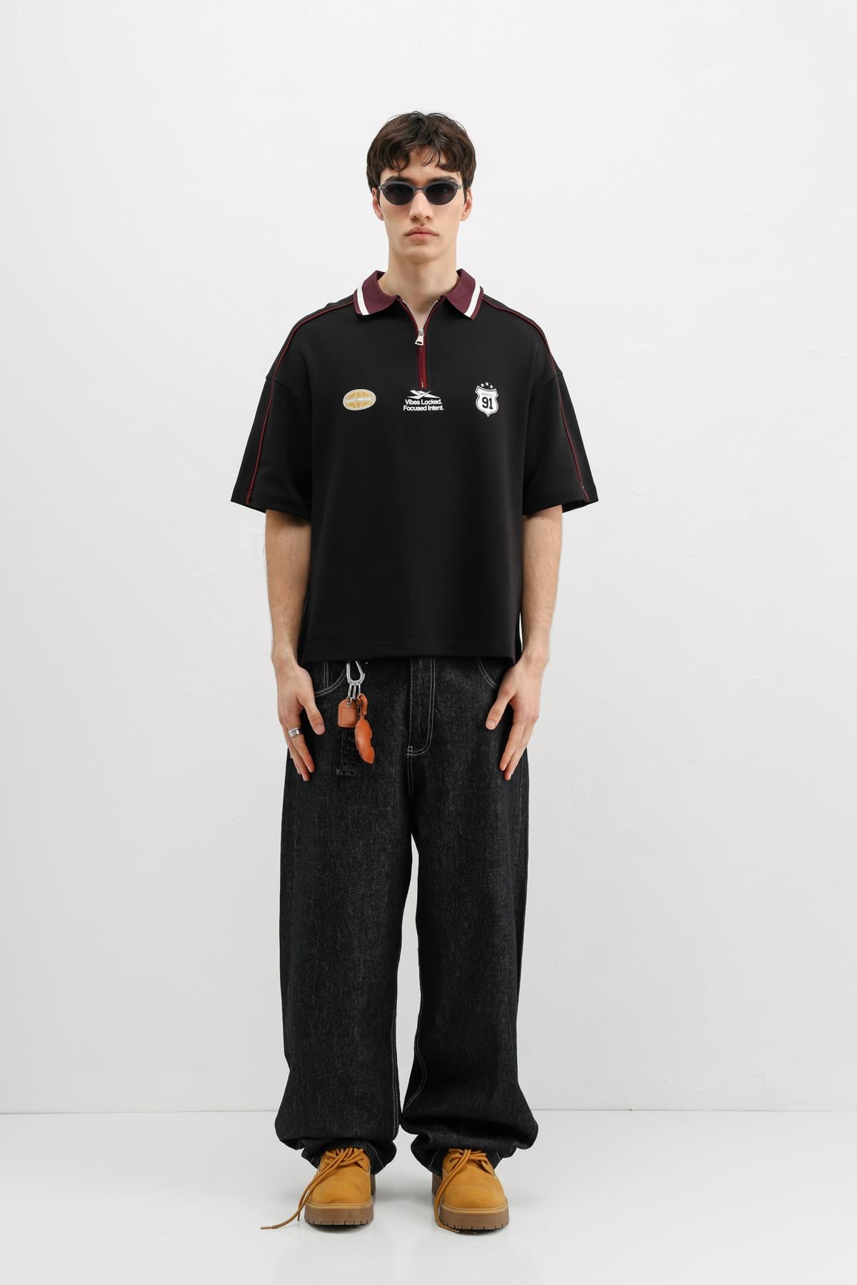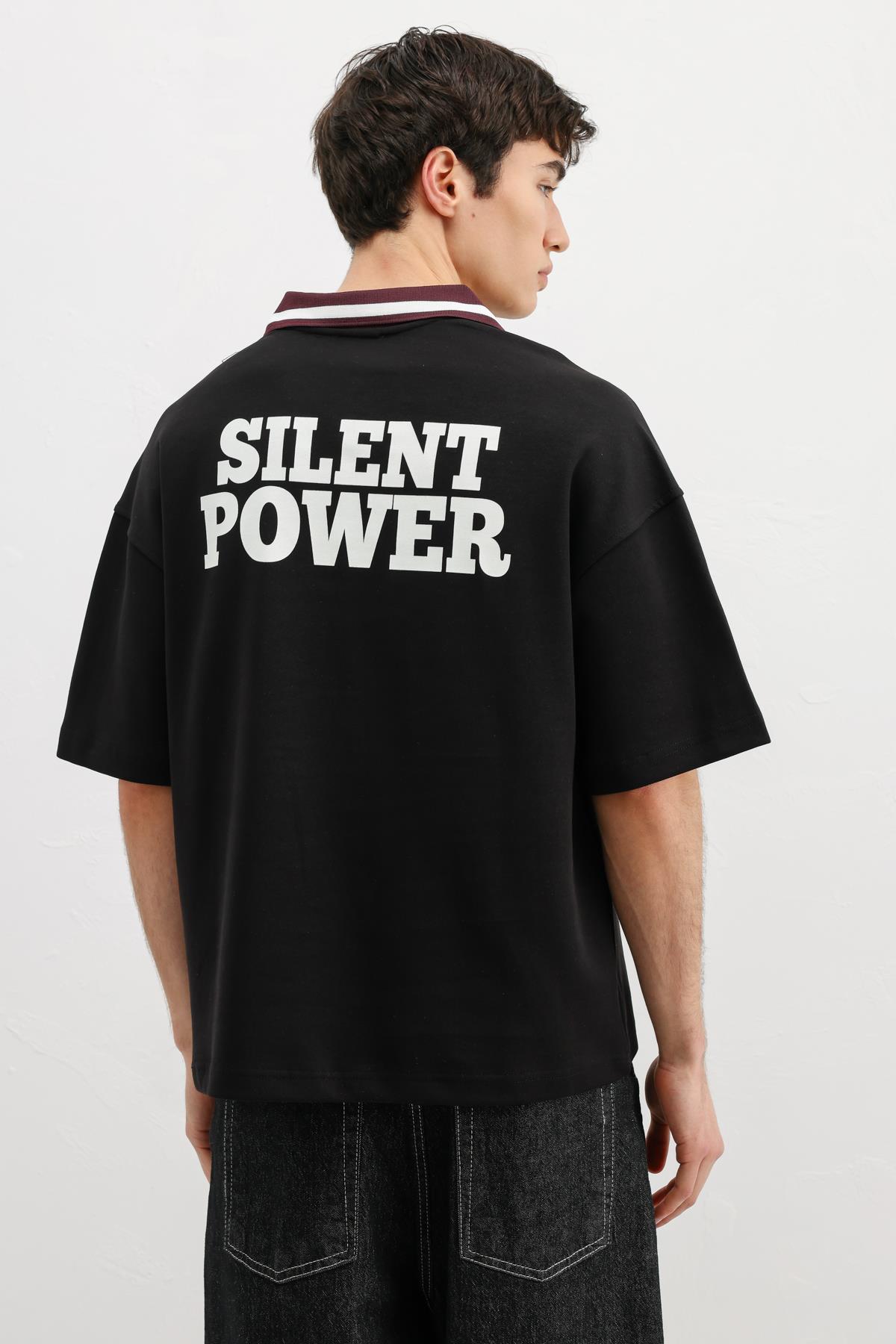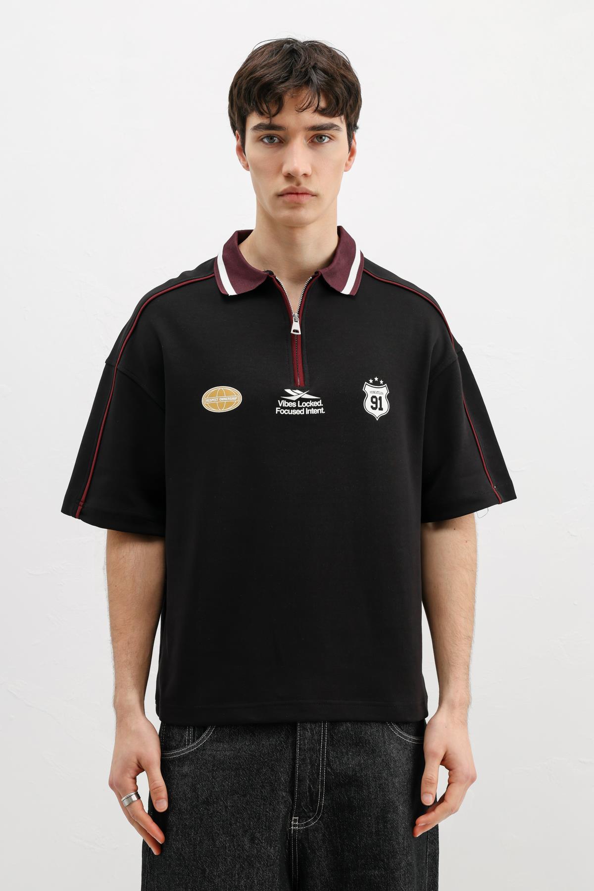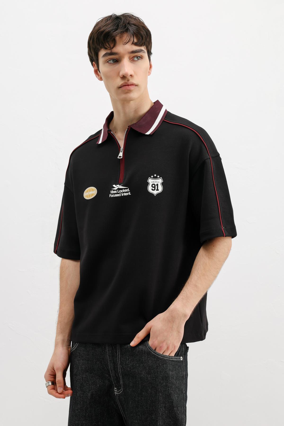 Fermuarlı Yaka Baskılı Oversize Tişört Siyah (V70-166)