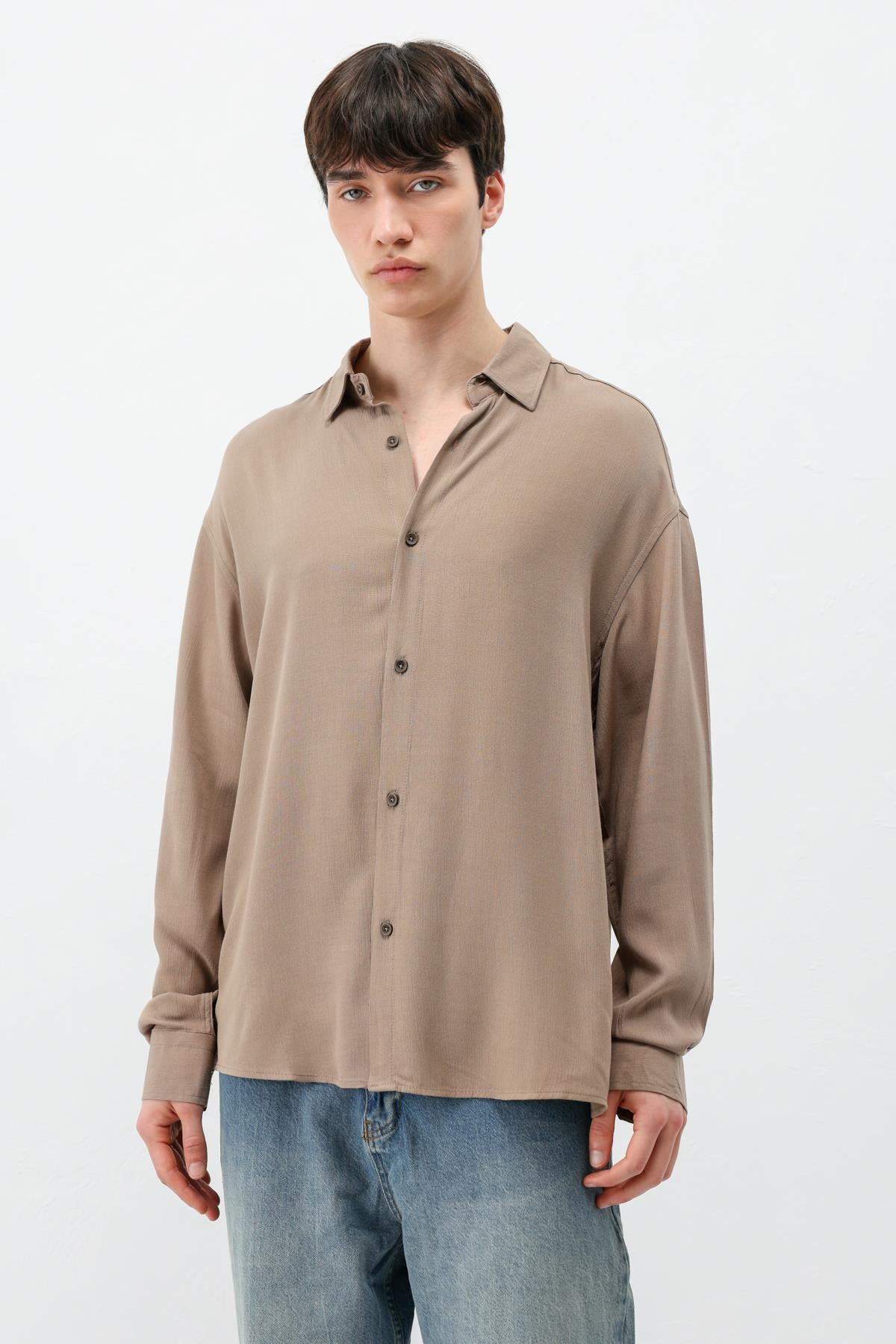 Hafif Dokulu Oversize Gömlek Vizon (V40-91)