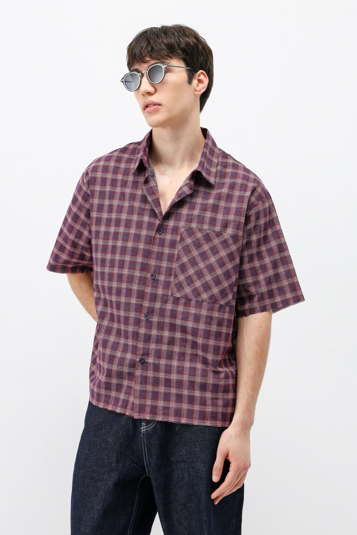 Kareli Kısa Kollu Oversize Gömlek Bordo (V40-95)