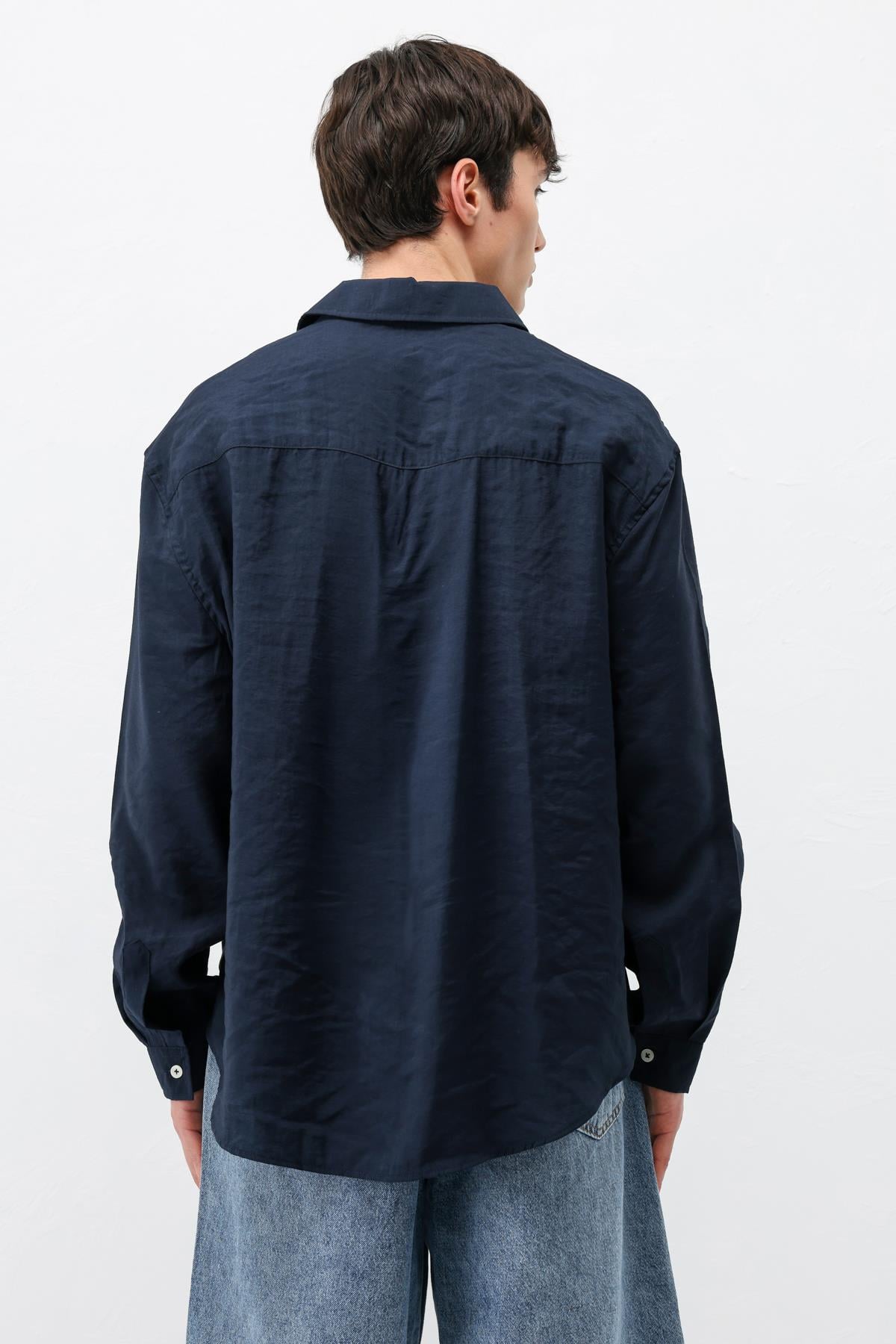 Modal Kumaş Cepli Oversize Gömlek Lacivert (V40-101)