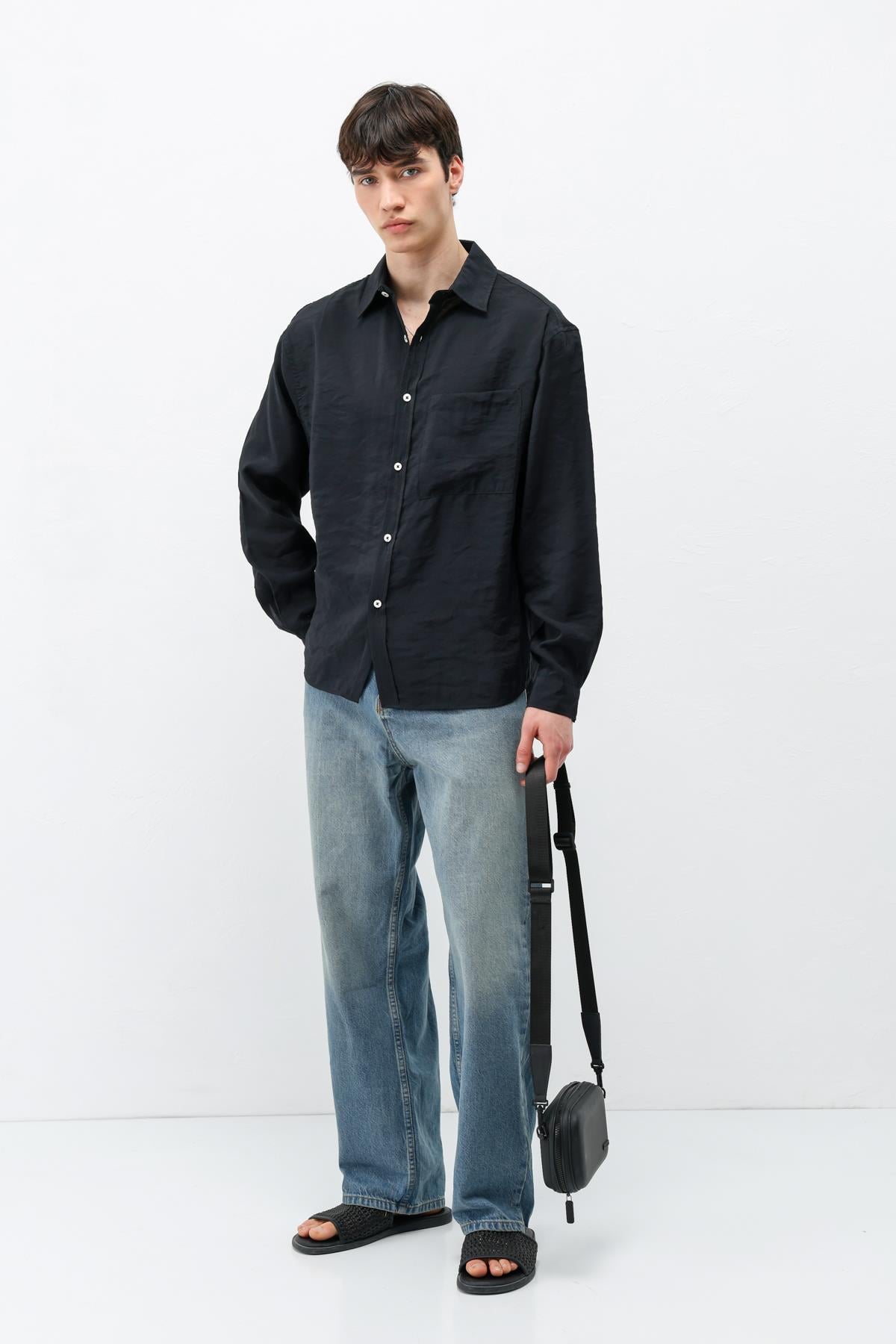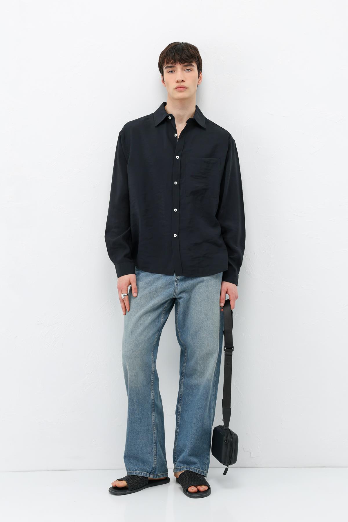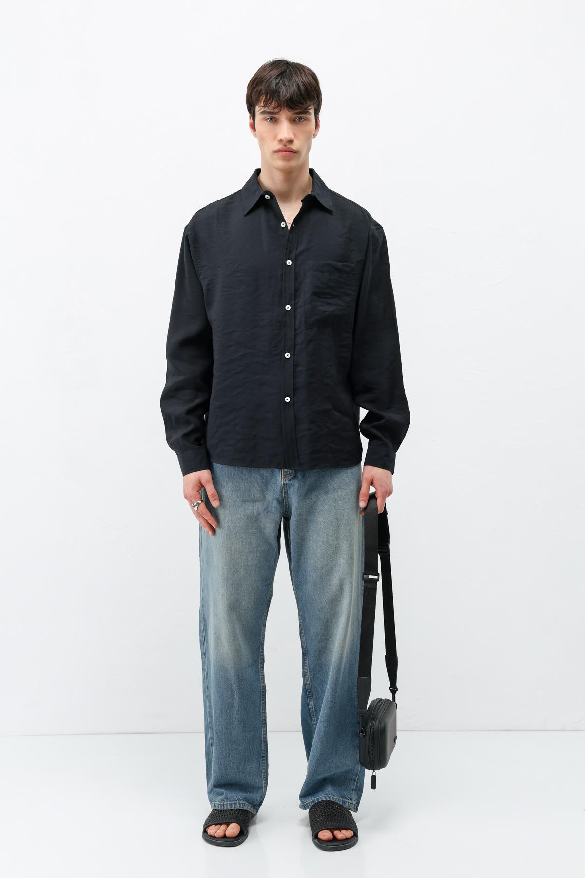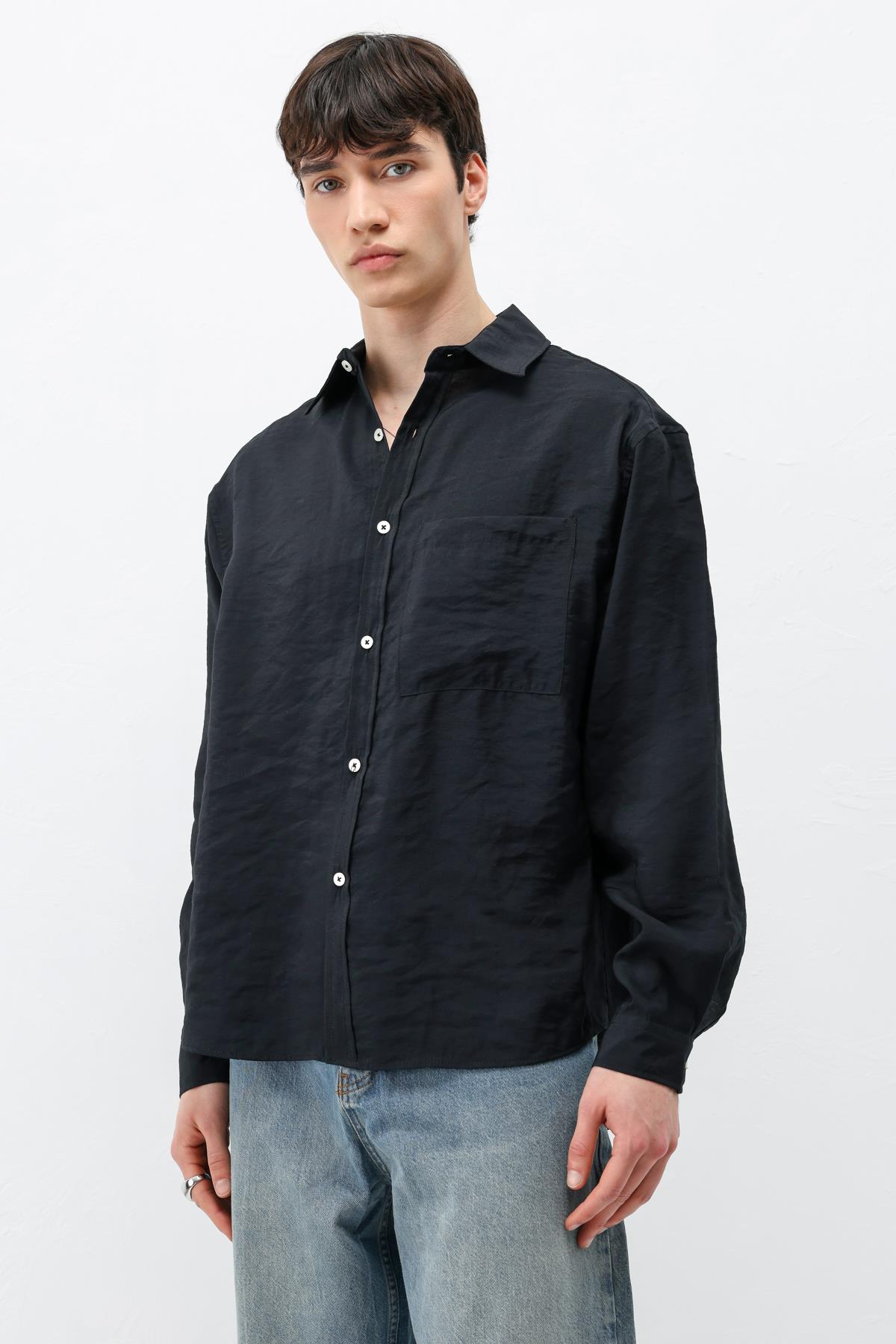 Modal Kumaş Cepli Oversize Gömlek Siyah (V40-101)