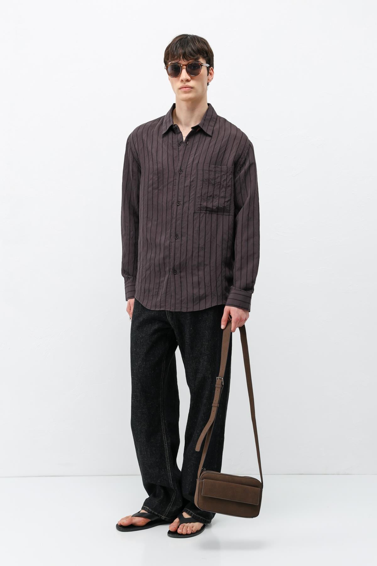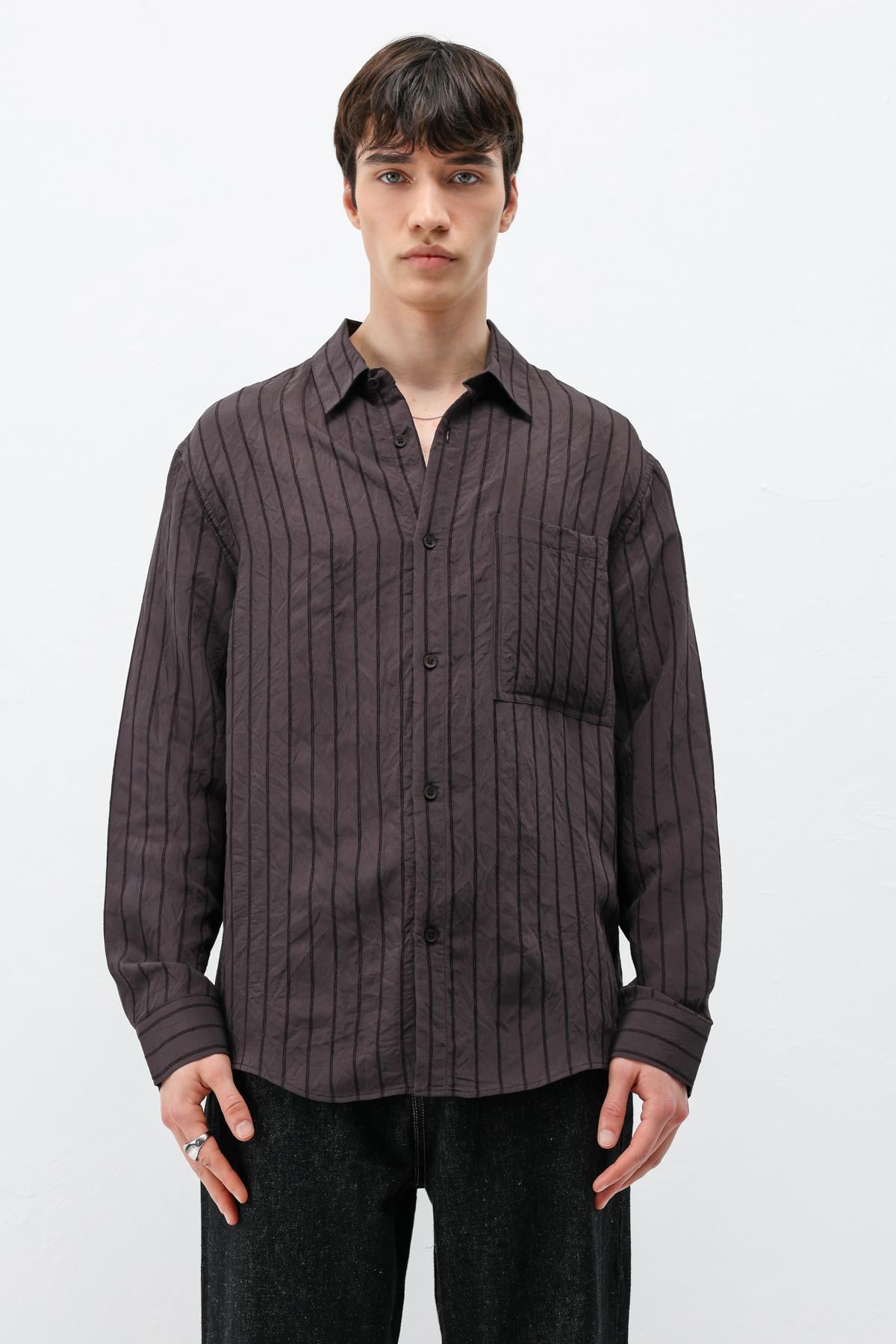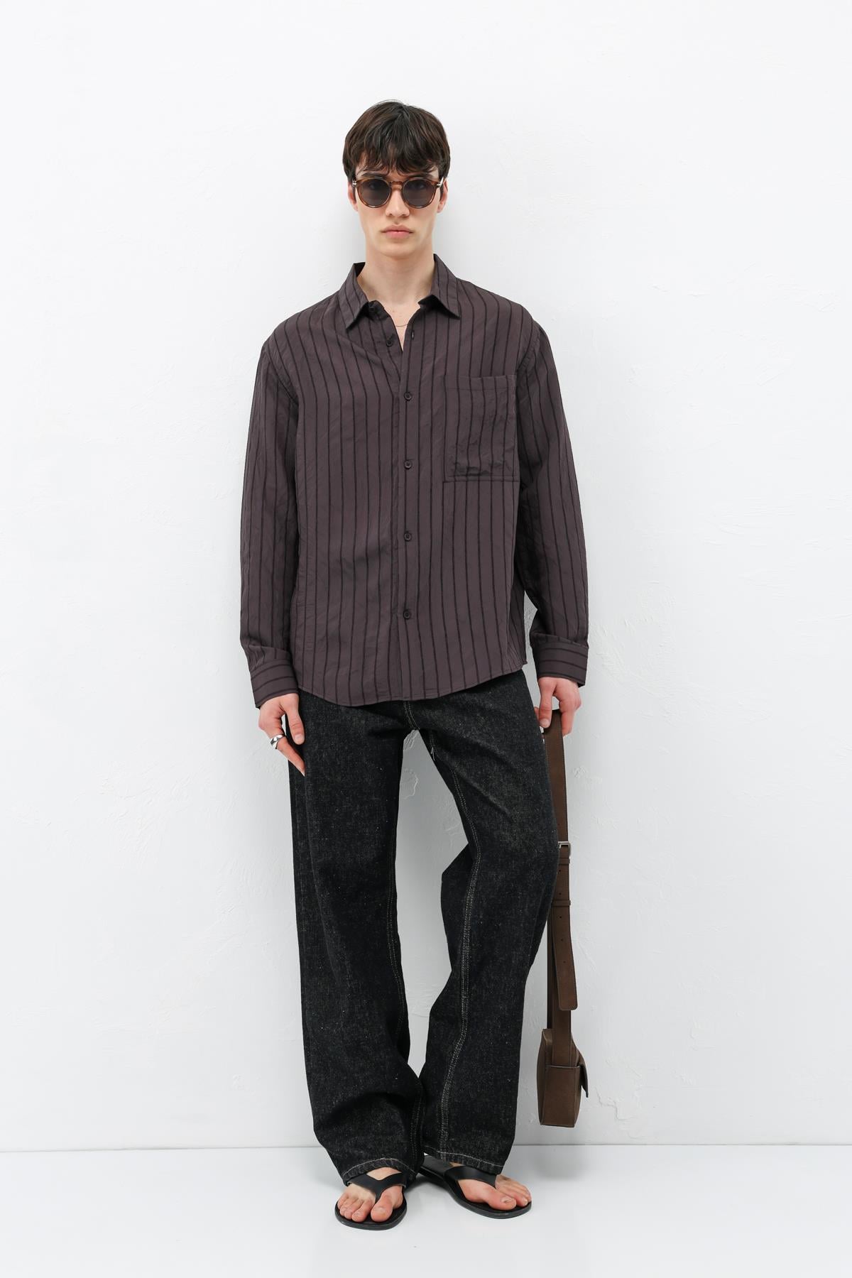 Modal Kumaş Çizgili Oversize Gömlek Koyu Kahve (V40-102)