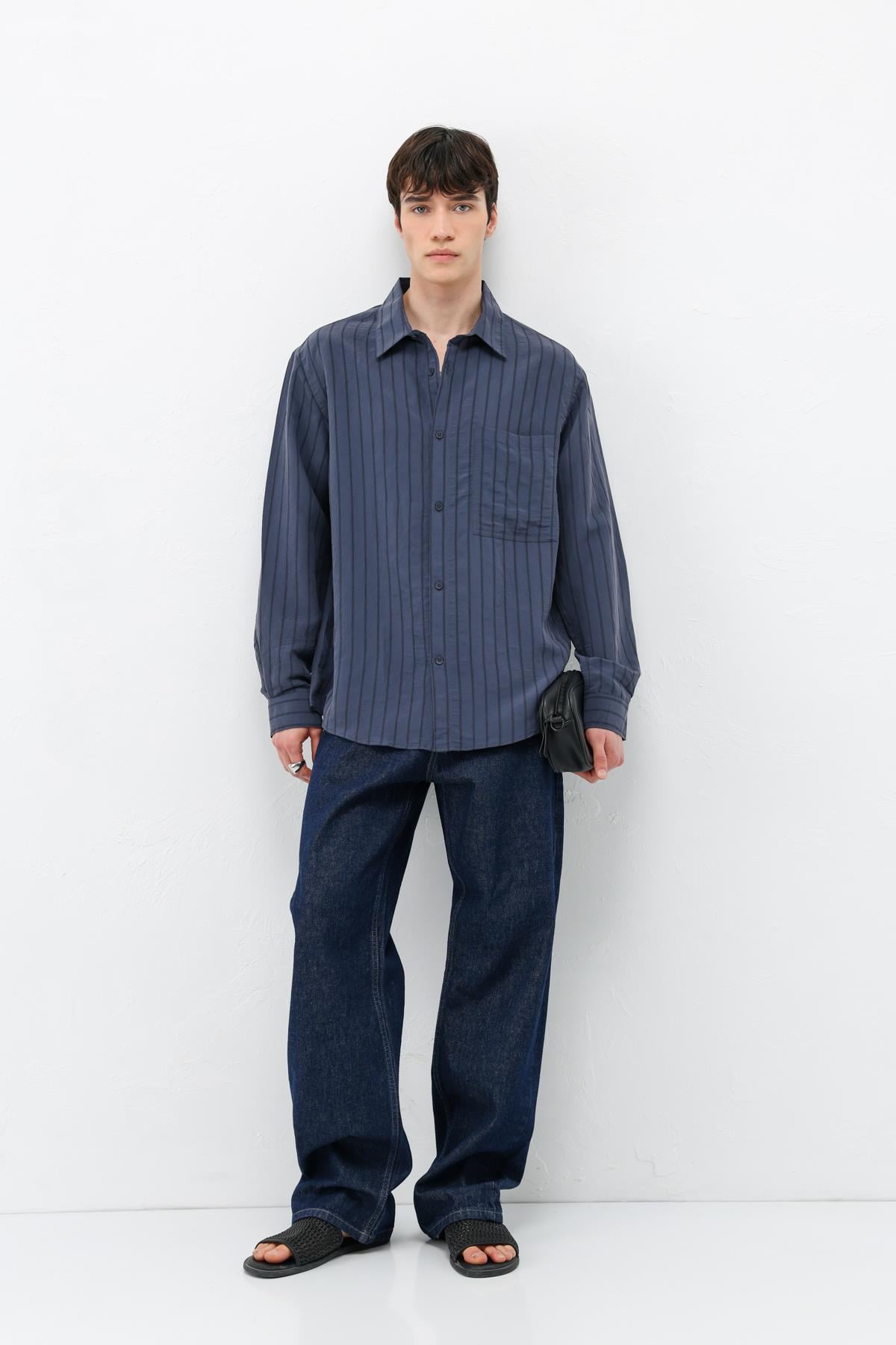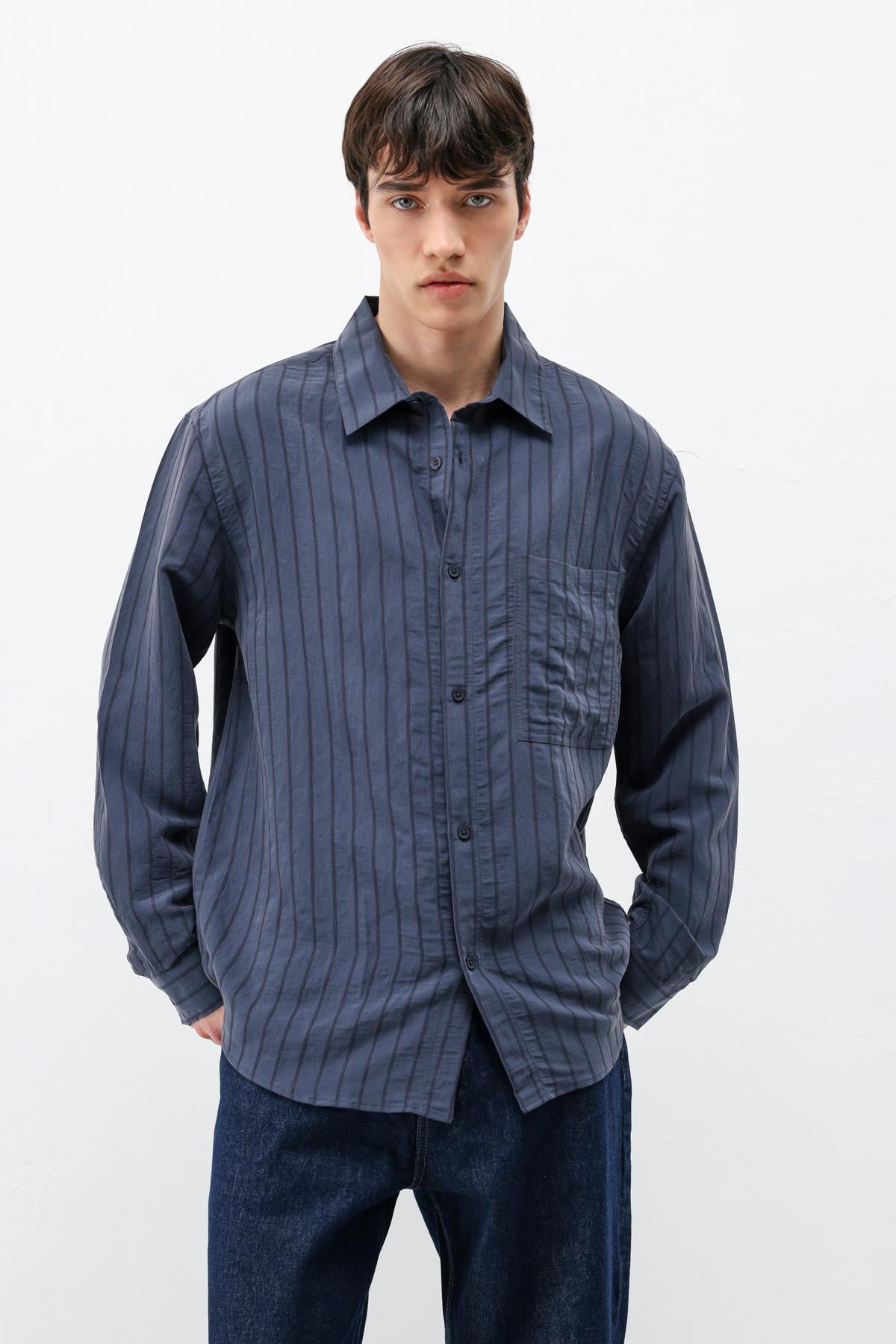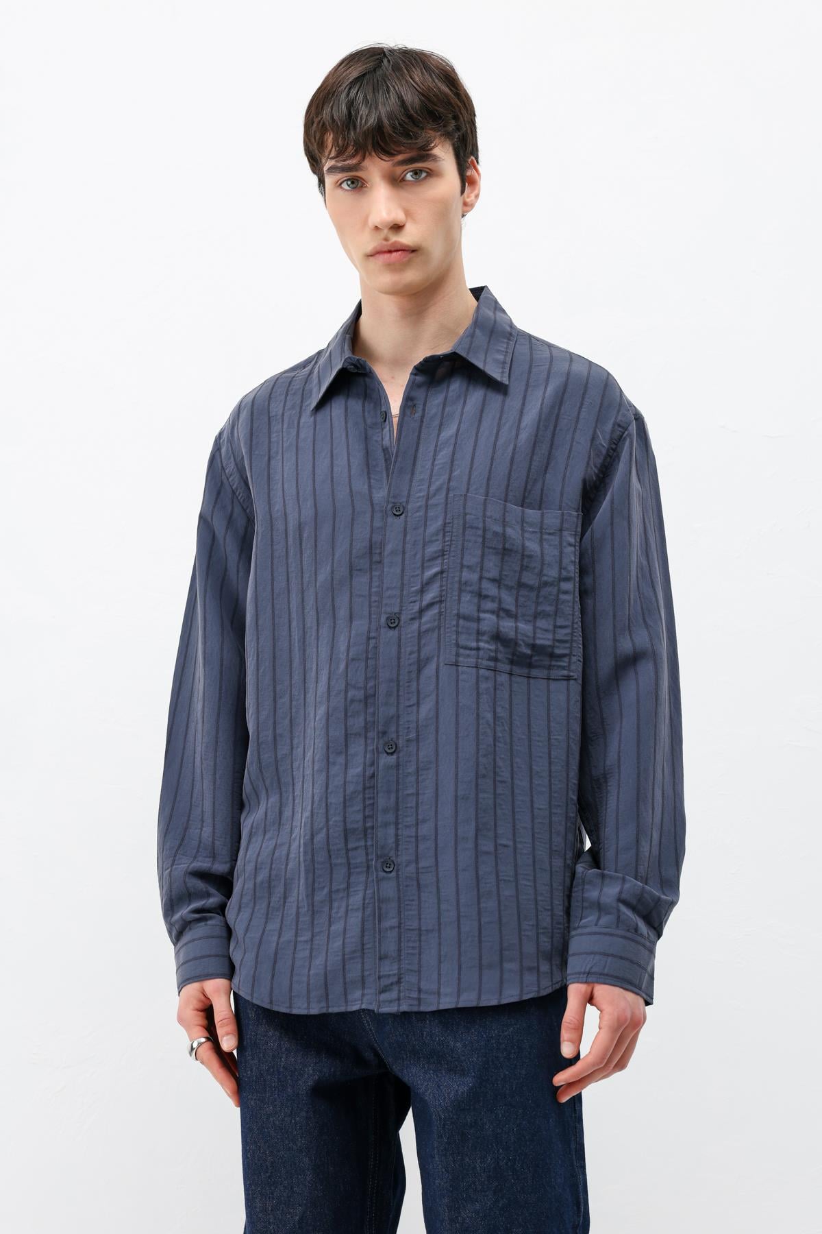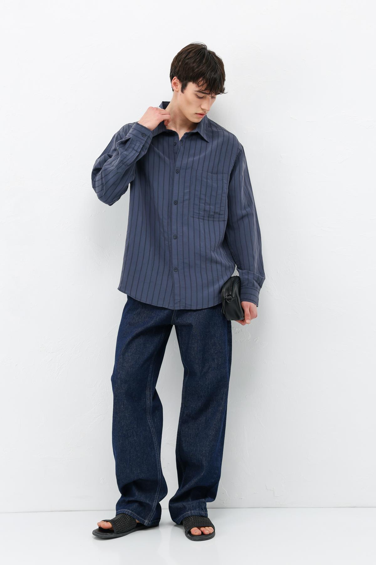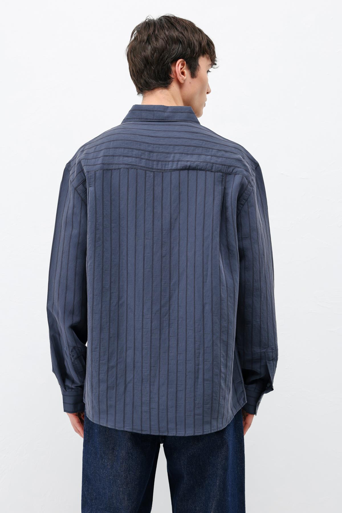 Modal Kumaş Çizgili Oversize Gömlek Lacivert (V40-102)