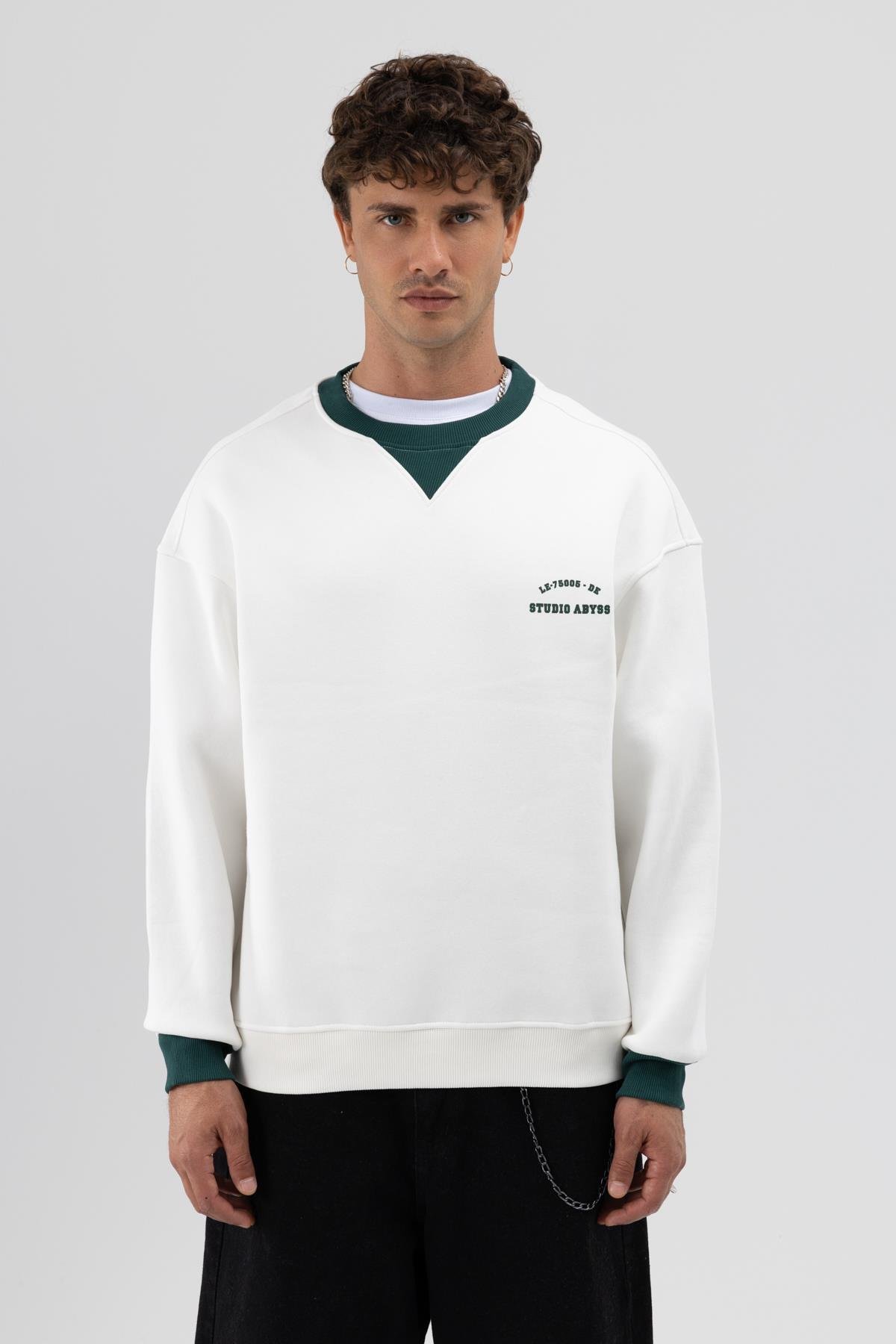 Oversize Bisiklet Yaka Baskılı Sweatshirt Ekru (V70-91)