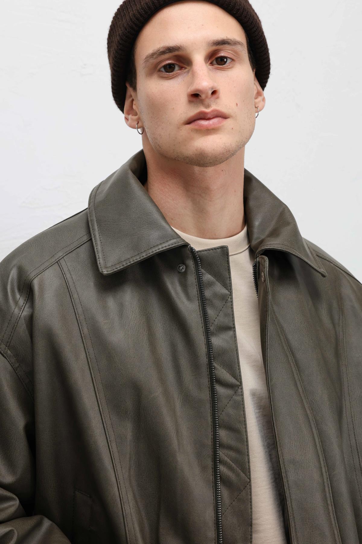 Oversize Deri Bomber Ceket Haki (V50-18)
