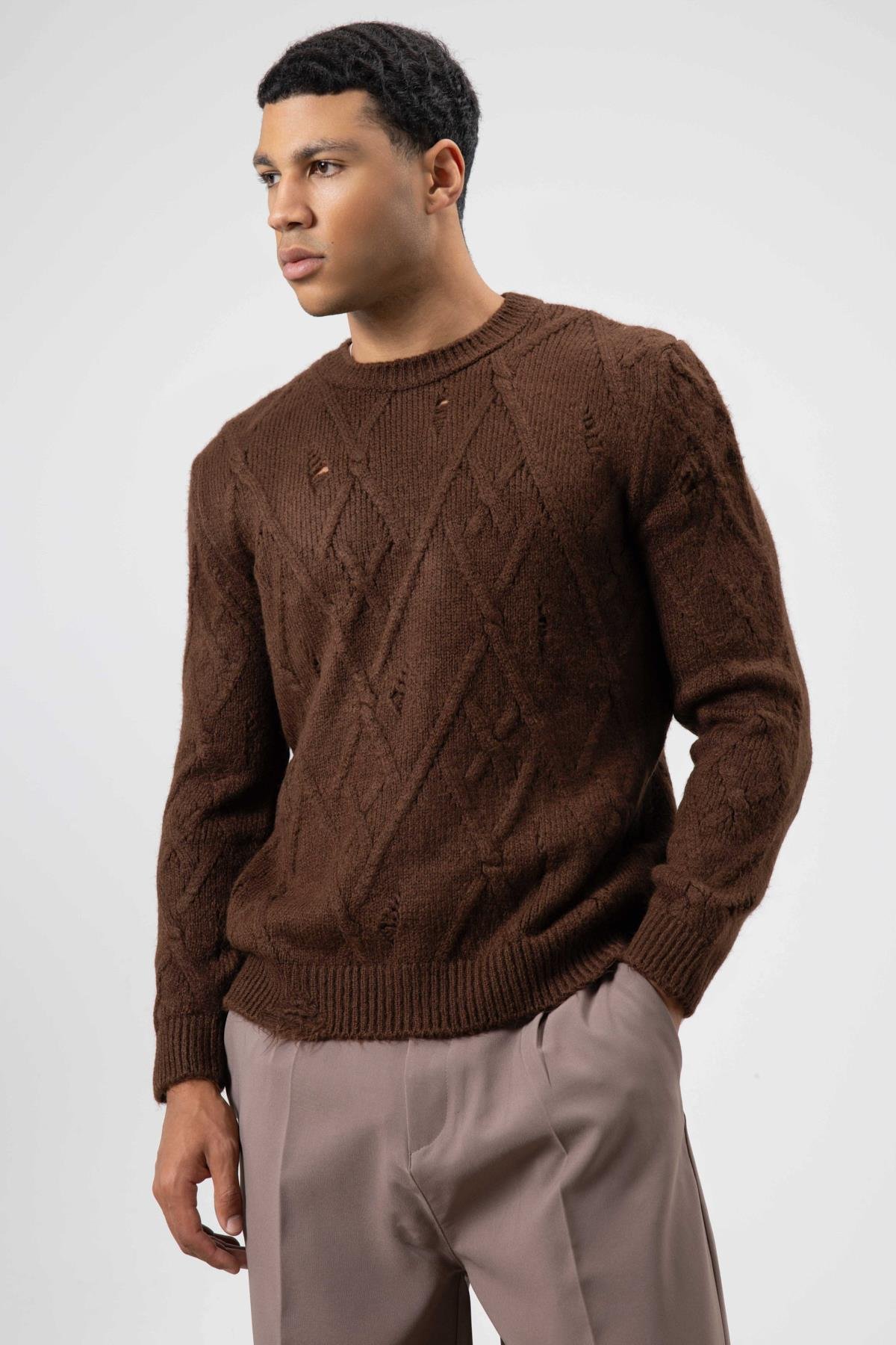 Oversize Desenli Triko Kazak Kahve (V60-23)