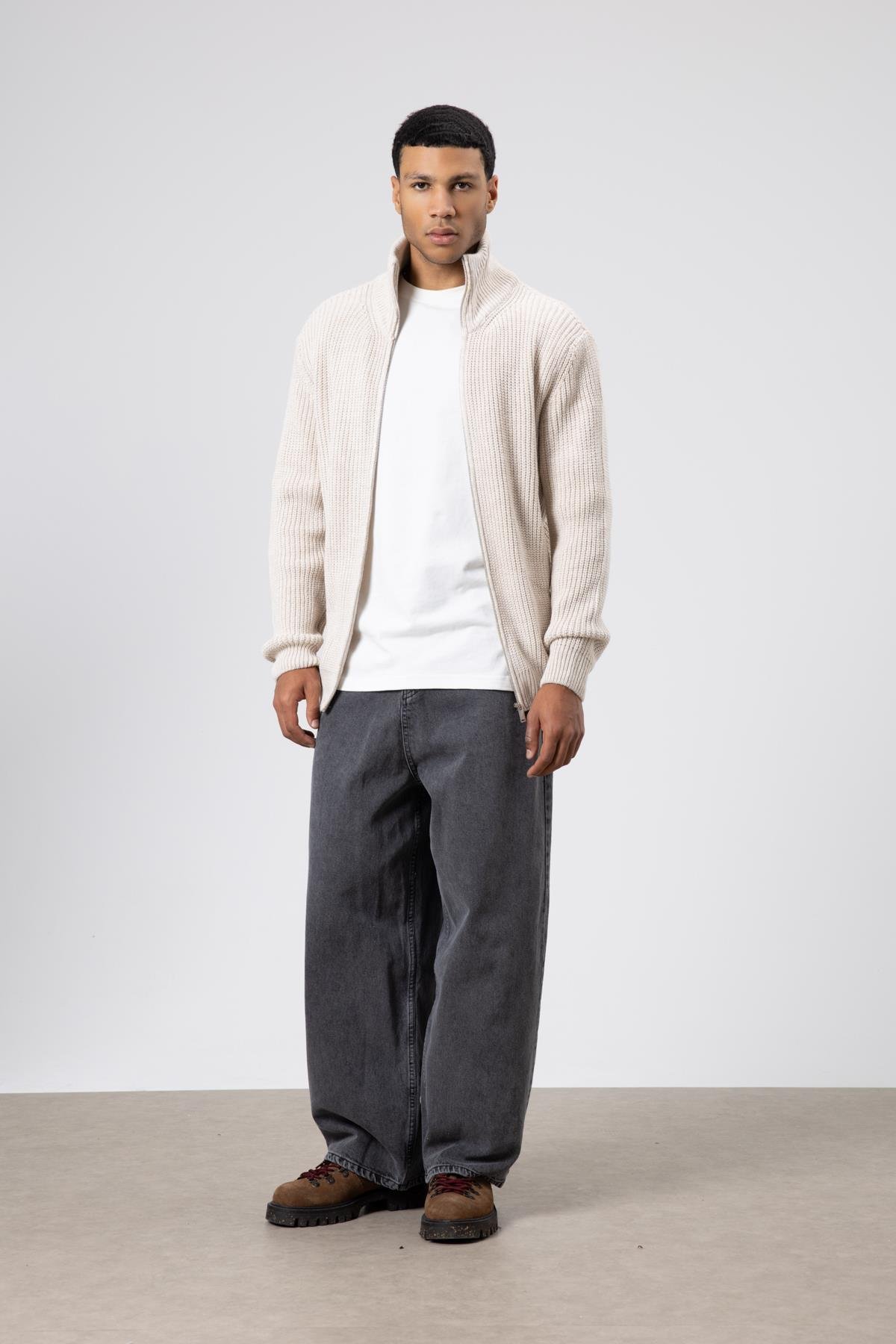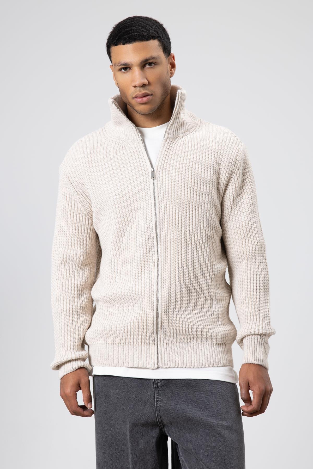 Oversize Fermuarlı Triko Hırka Açık Taş (V60-14)