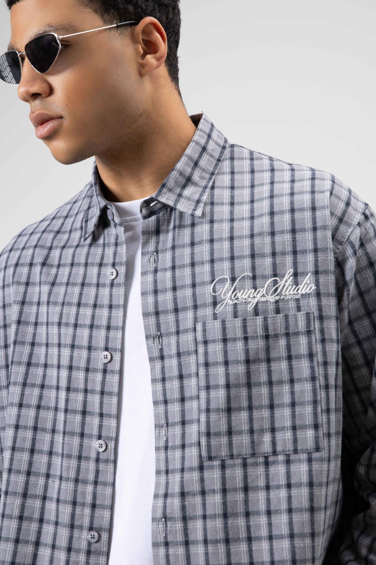 Oversize Kareli Arka Baskılı Uzun Kol Gömlek Gri-Lacivert (V40-84)