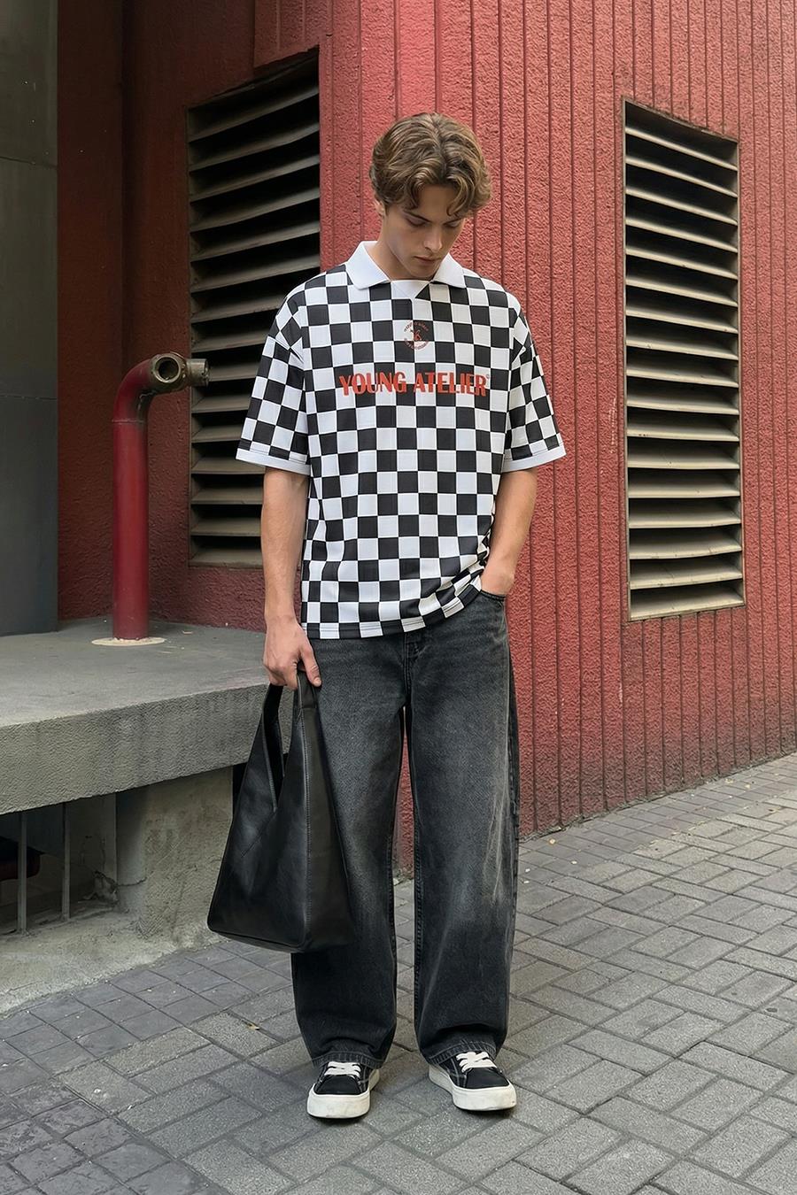Oversize Polo Yaka Forma Tişört SİYAH/BEYAZ (V70-47)