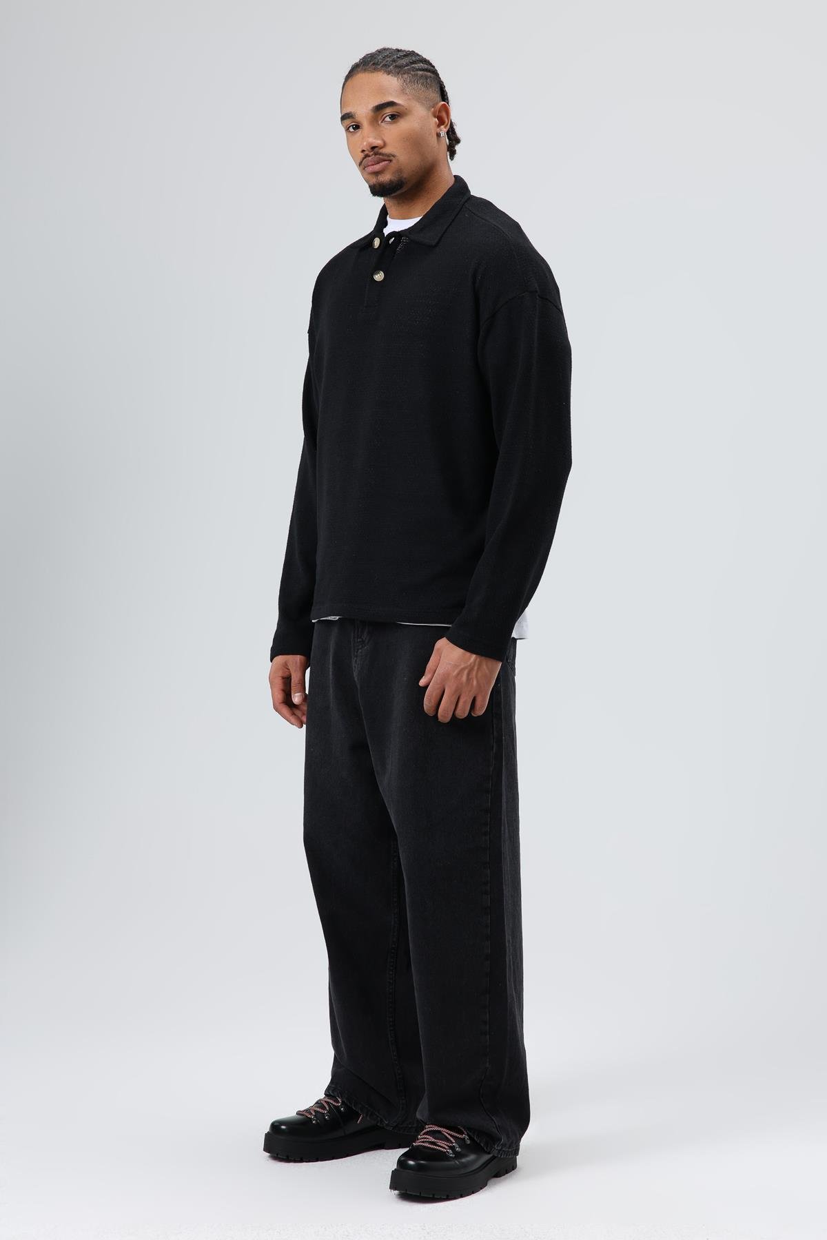 Oversize Polo Yaka Triko Kazak Siyah (V60-21)