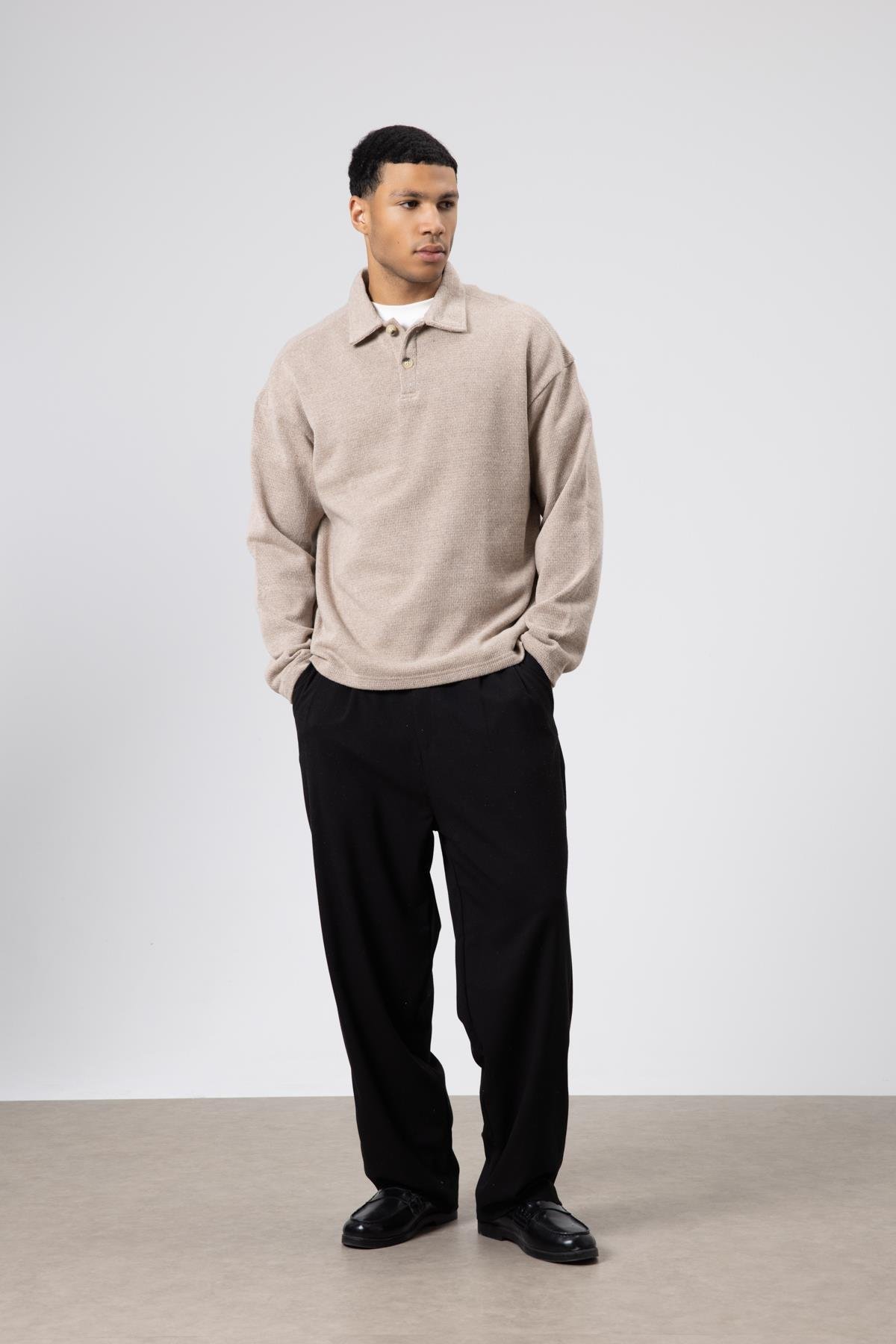 Oversize Polo Yaka Triko Kazak Vizon (V60-21)