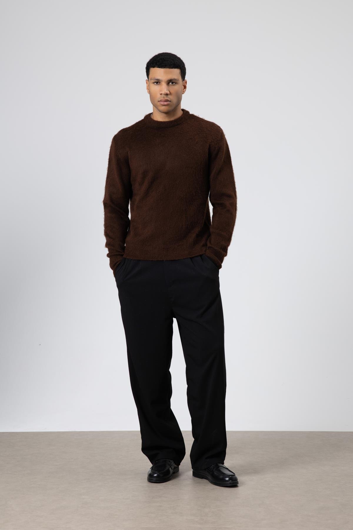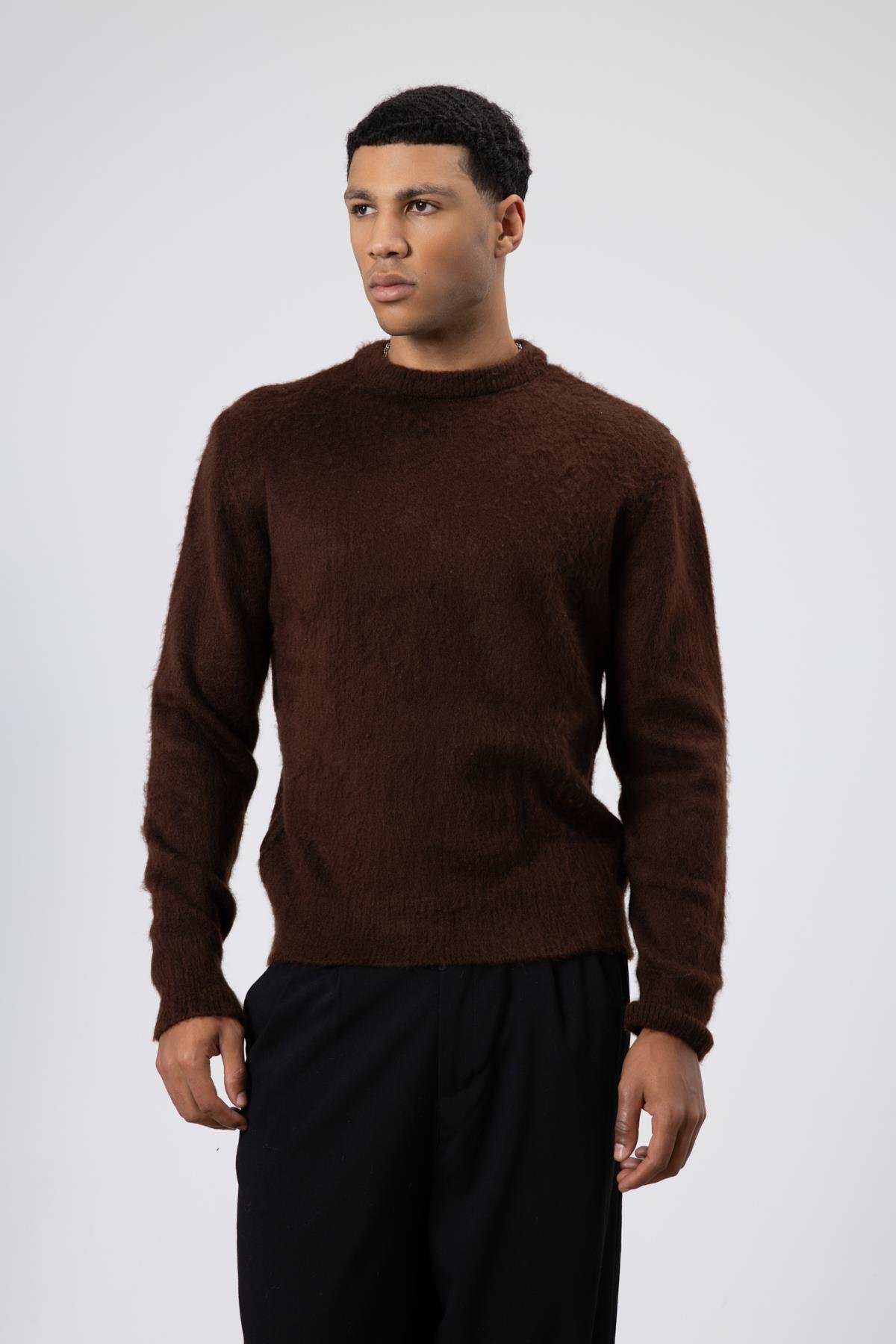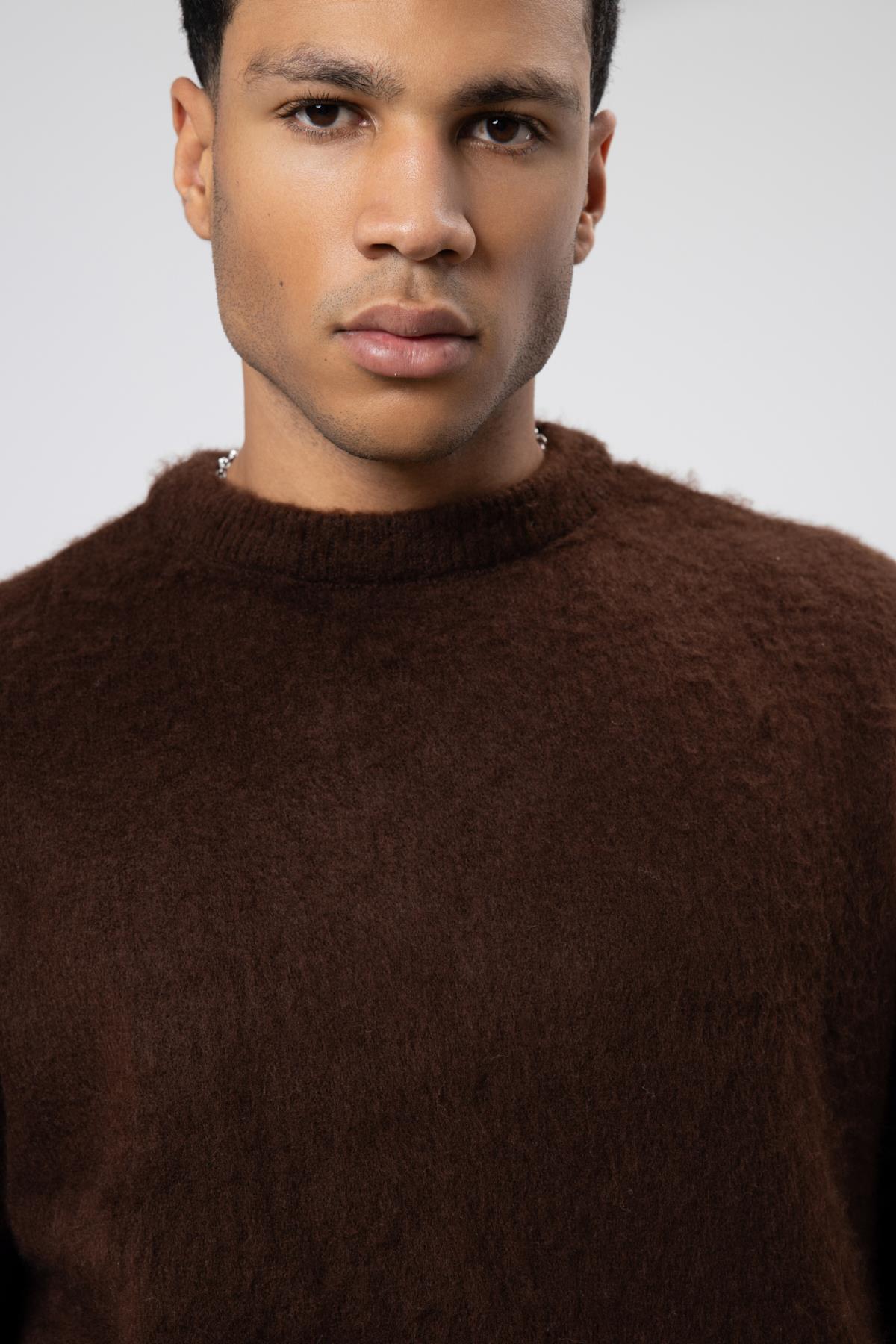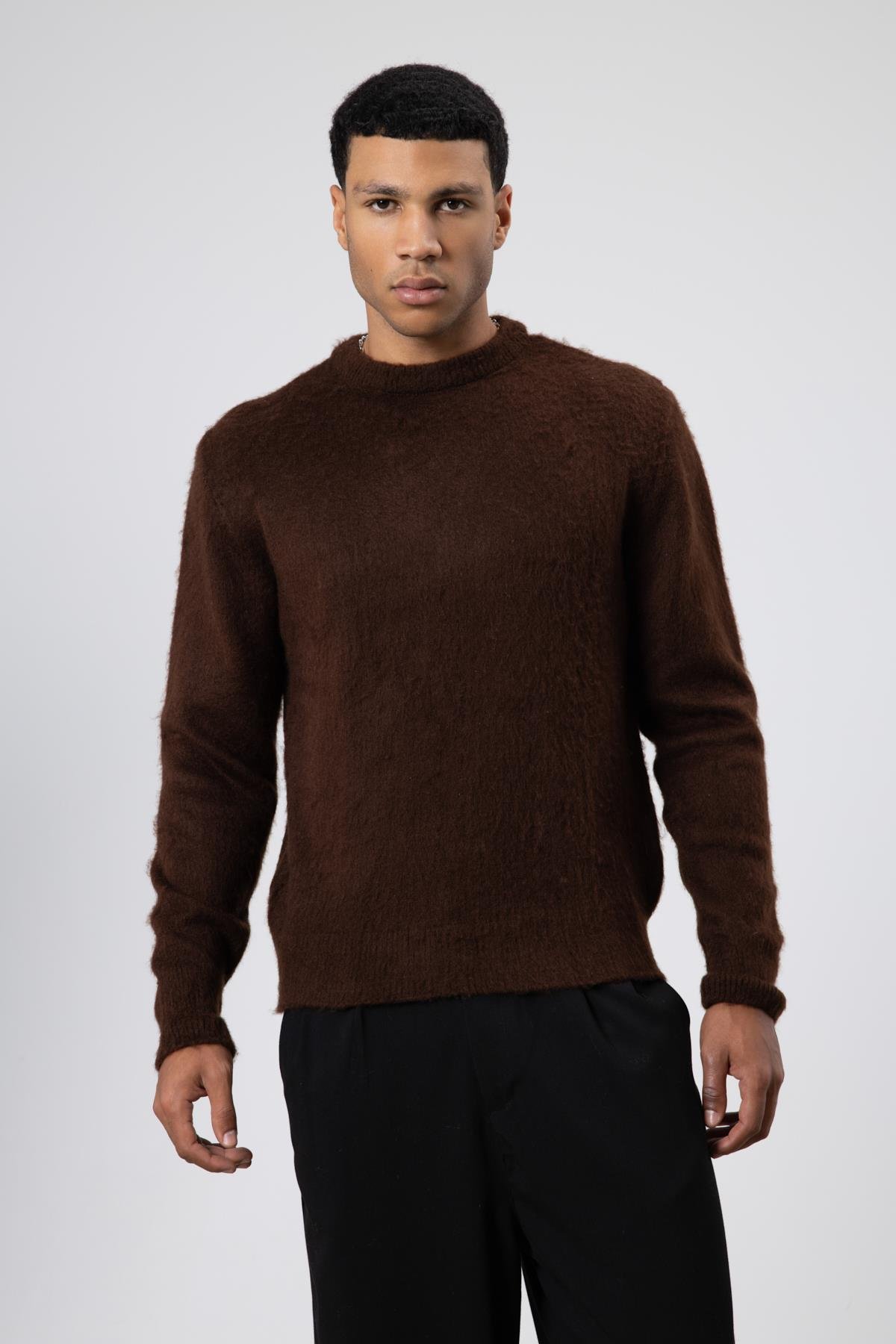 Oversize Yumuşak Dokulu Bisiklet Yaka Kazak Kahve (V60-16)