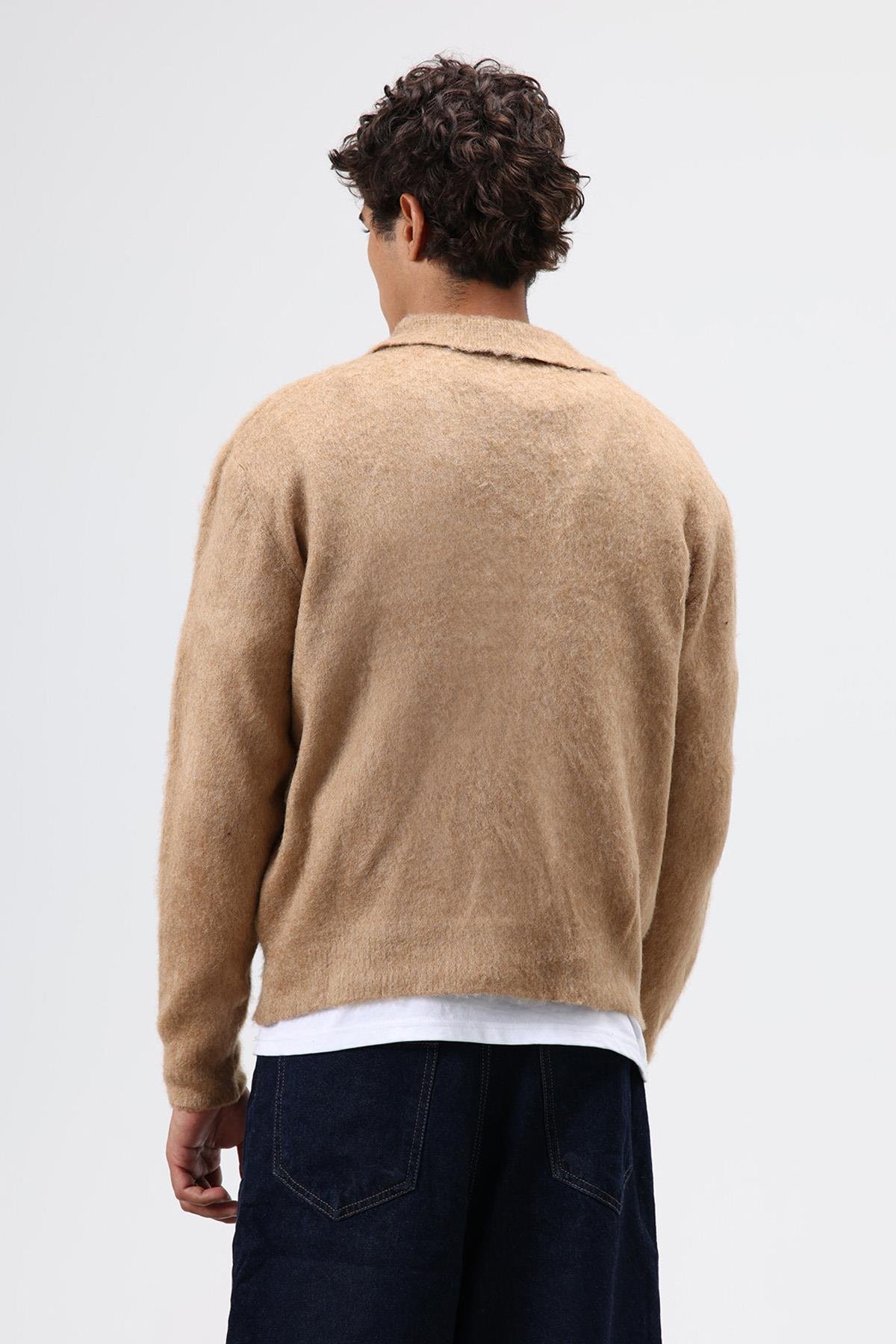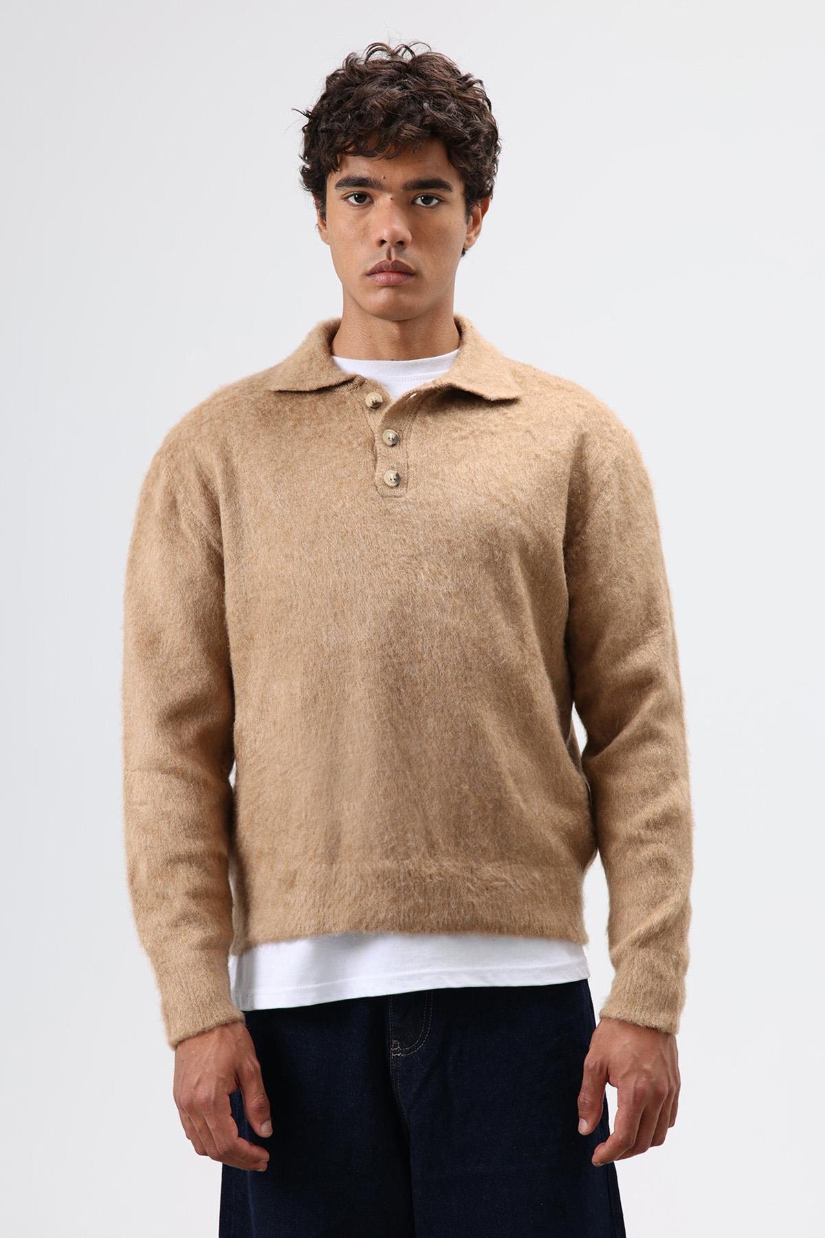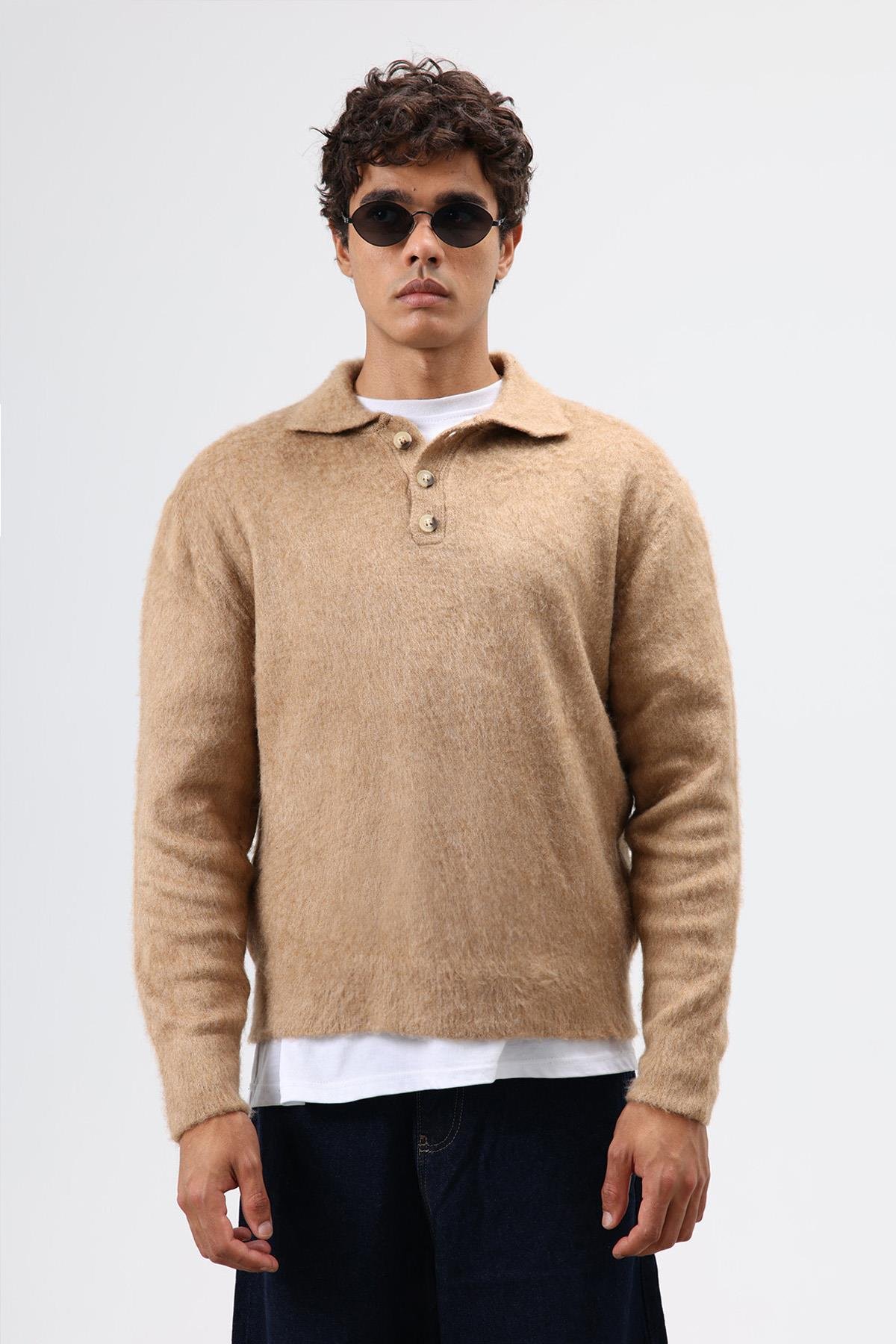 Polo Yaka Yumuşak Dokulu Triko Kazak Bej (V60-18)