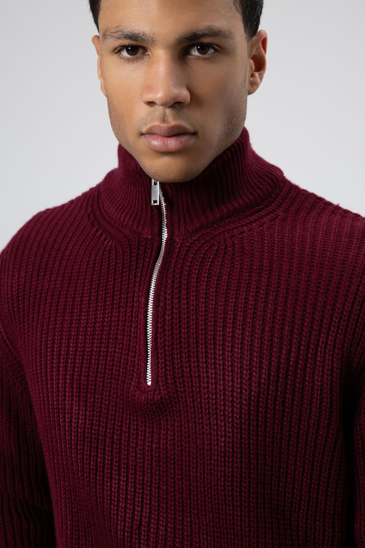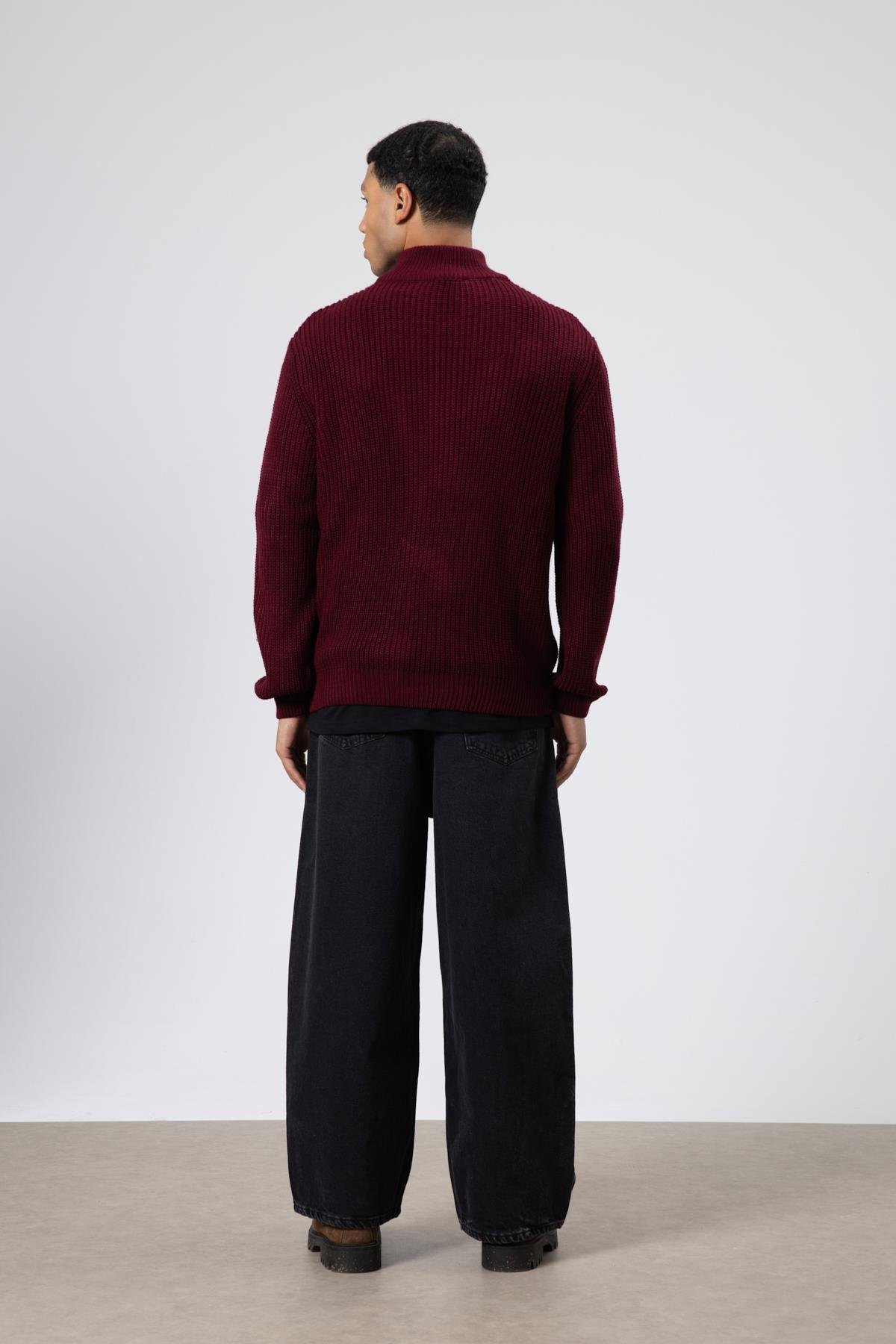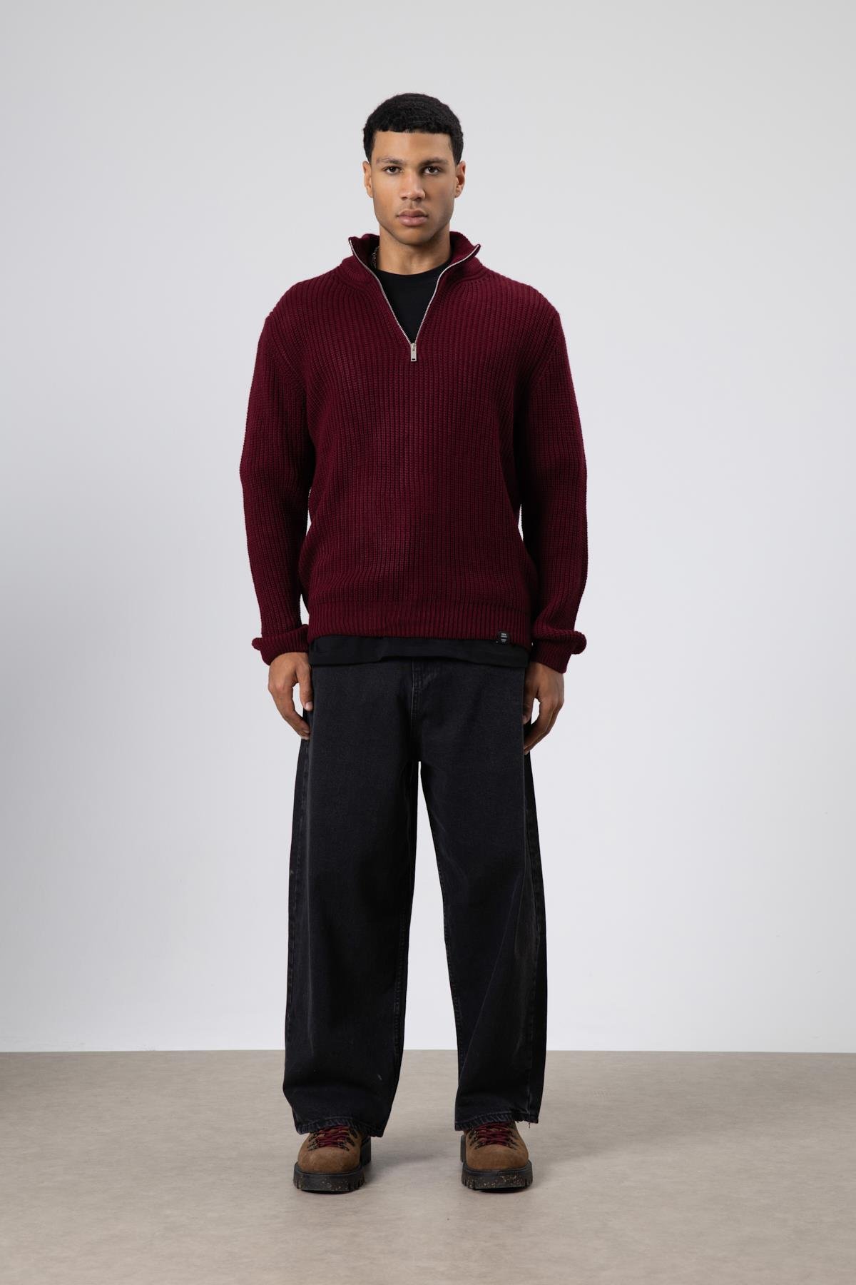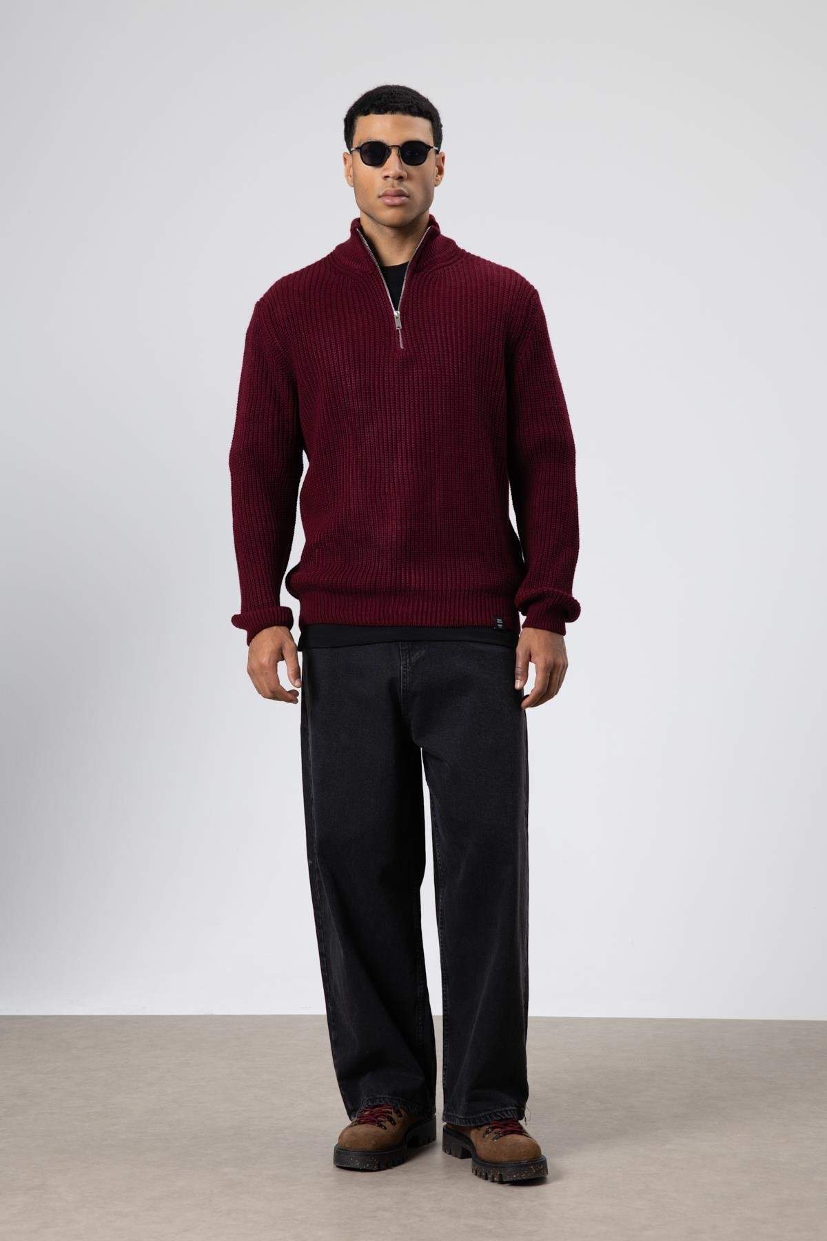 Fermuarlı Örme Triko Kazak Bordo (V60-11)