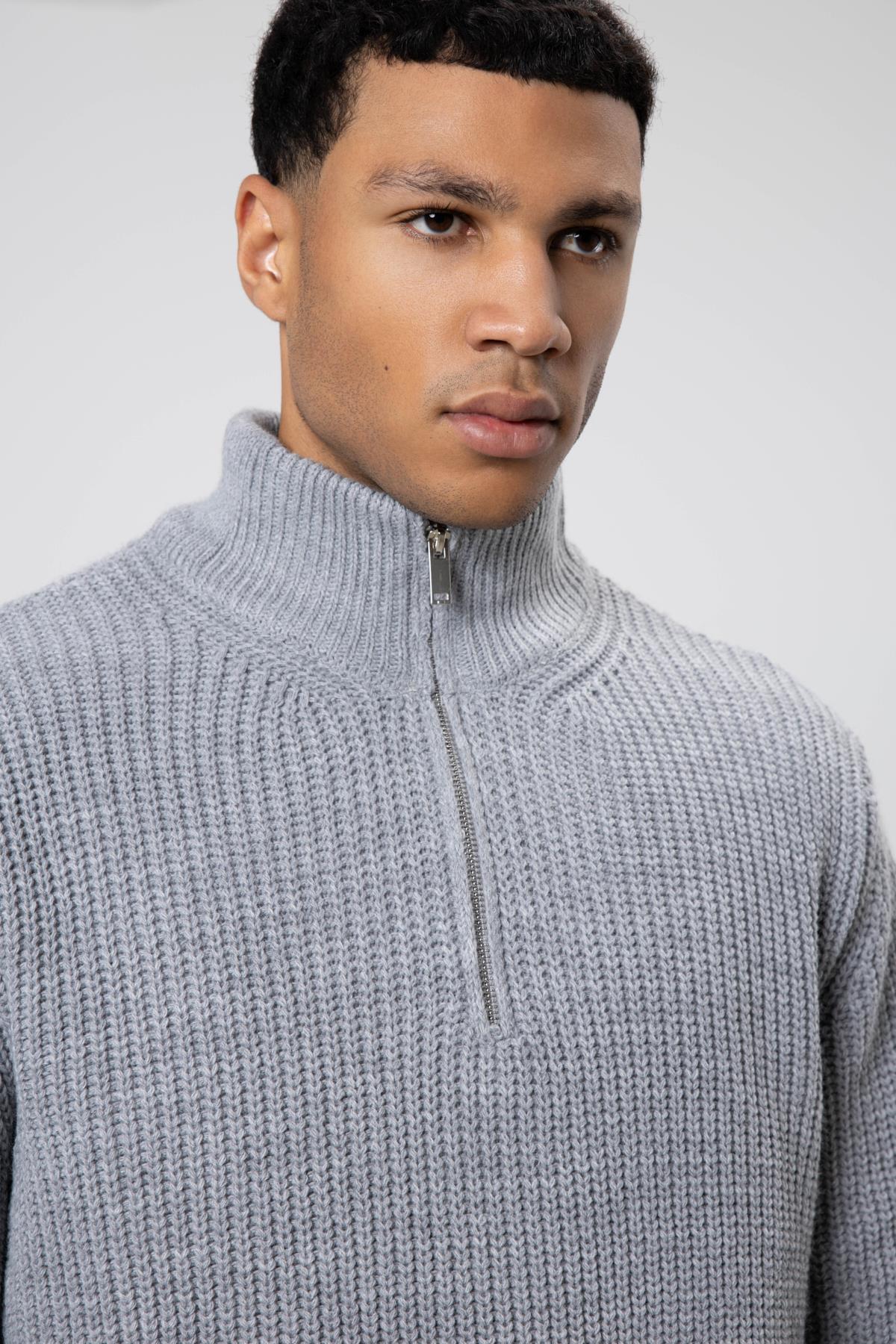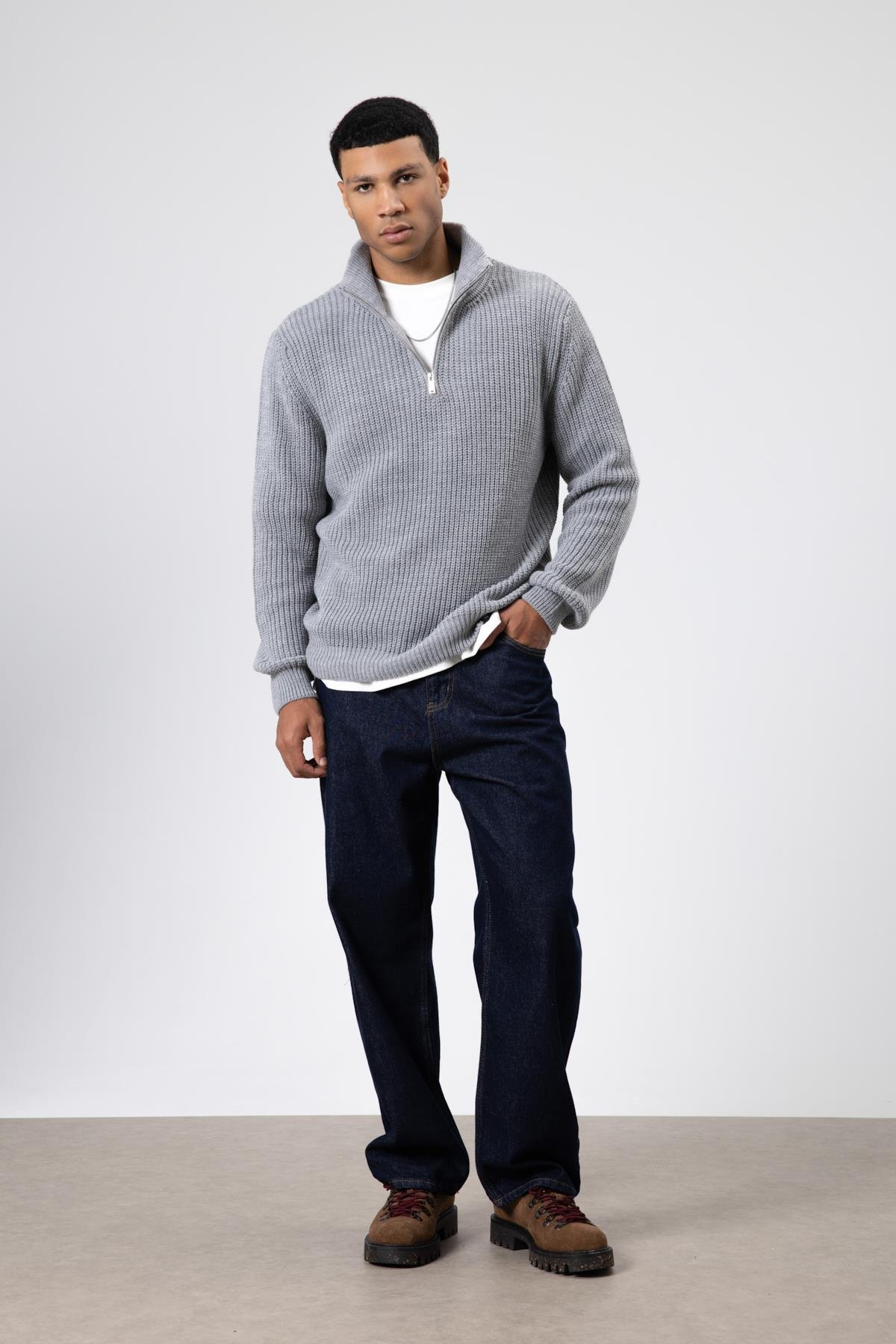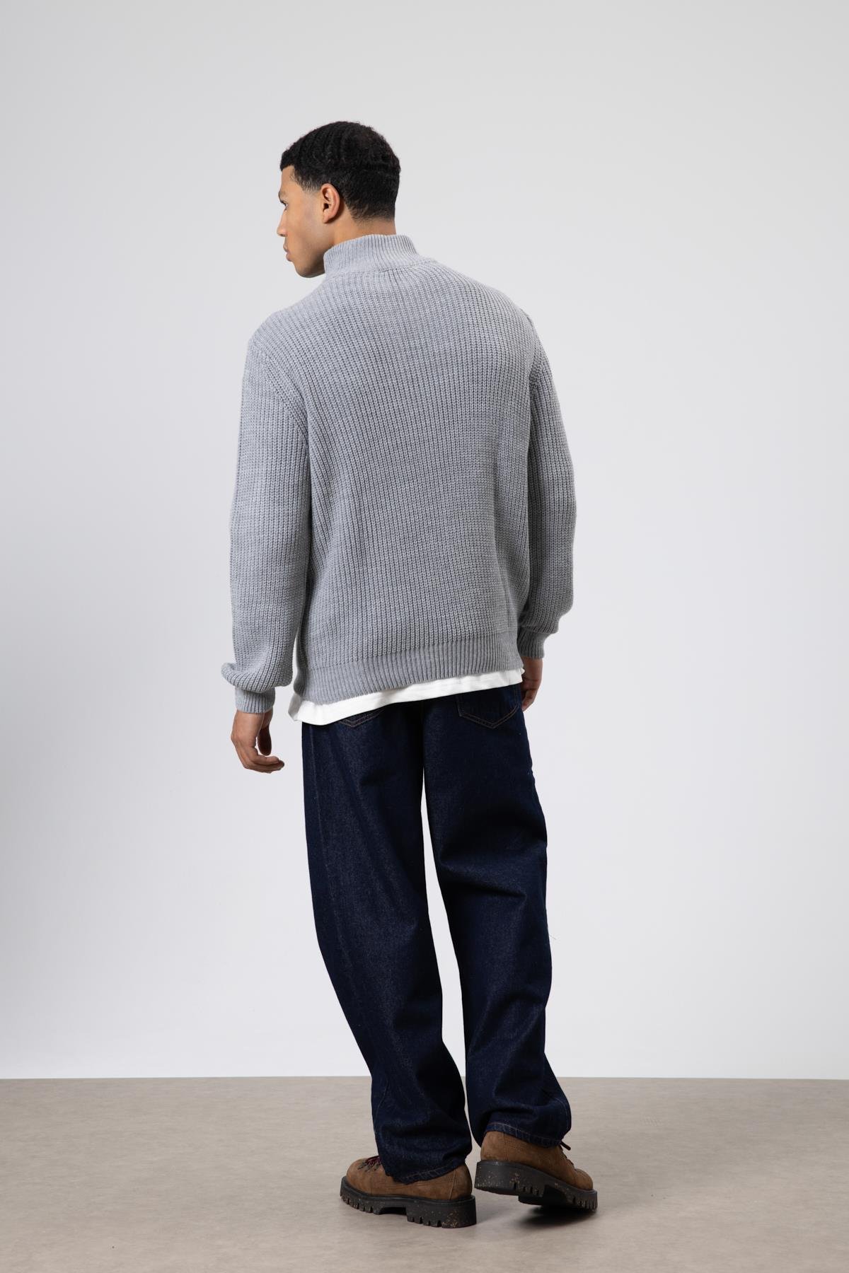 Fermuarlı Örme Triko Kazak Gri Melanj (V60-11)