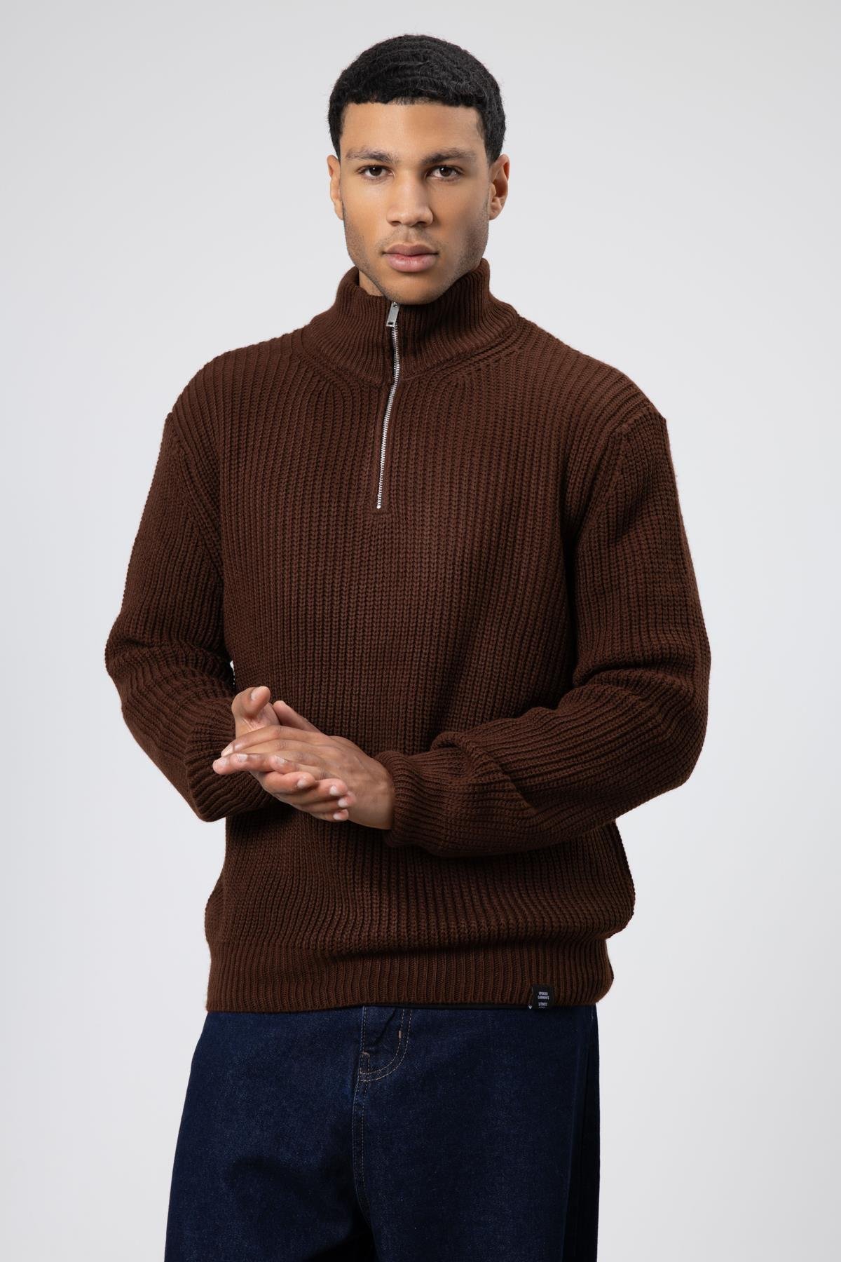 Fermuarlı Örme Triko Kazak Kahve (V60-11)