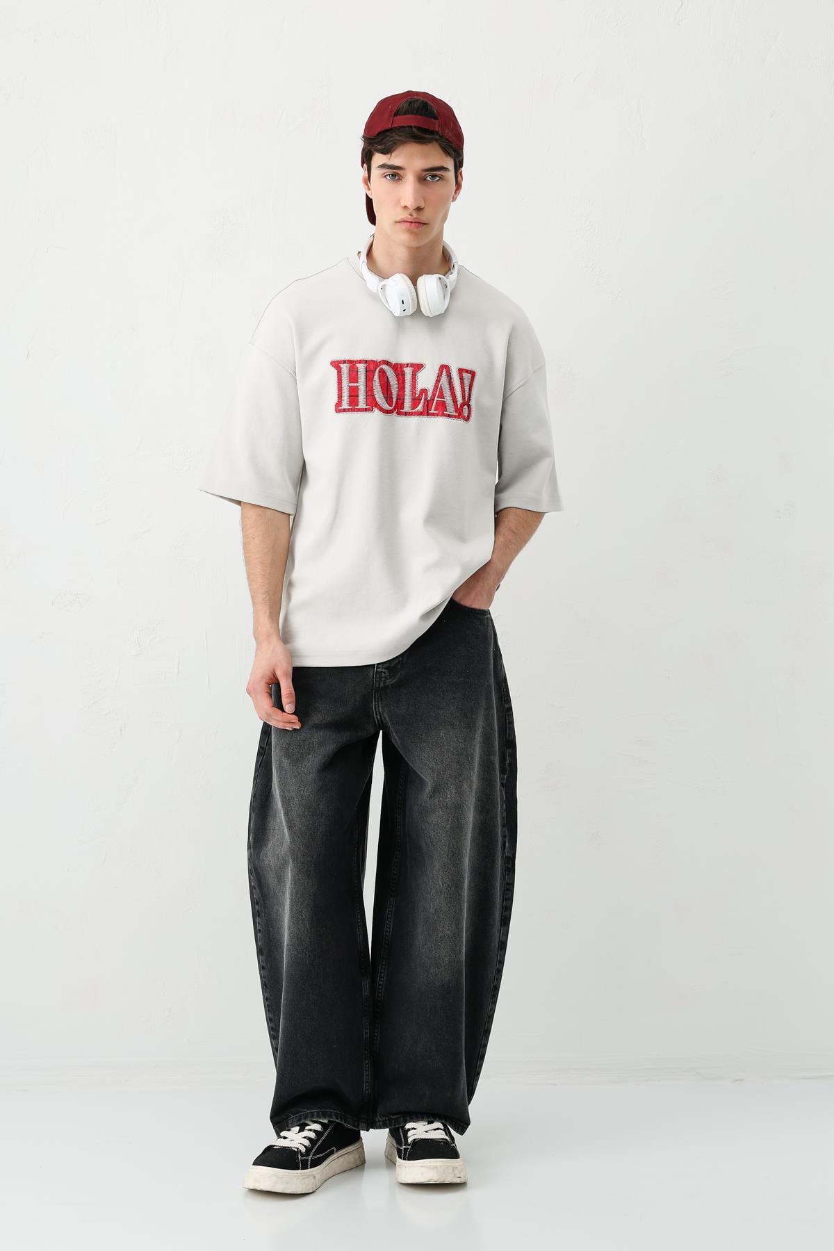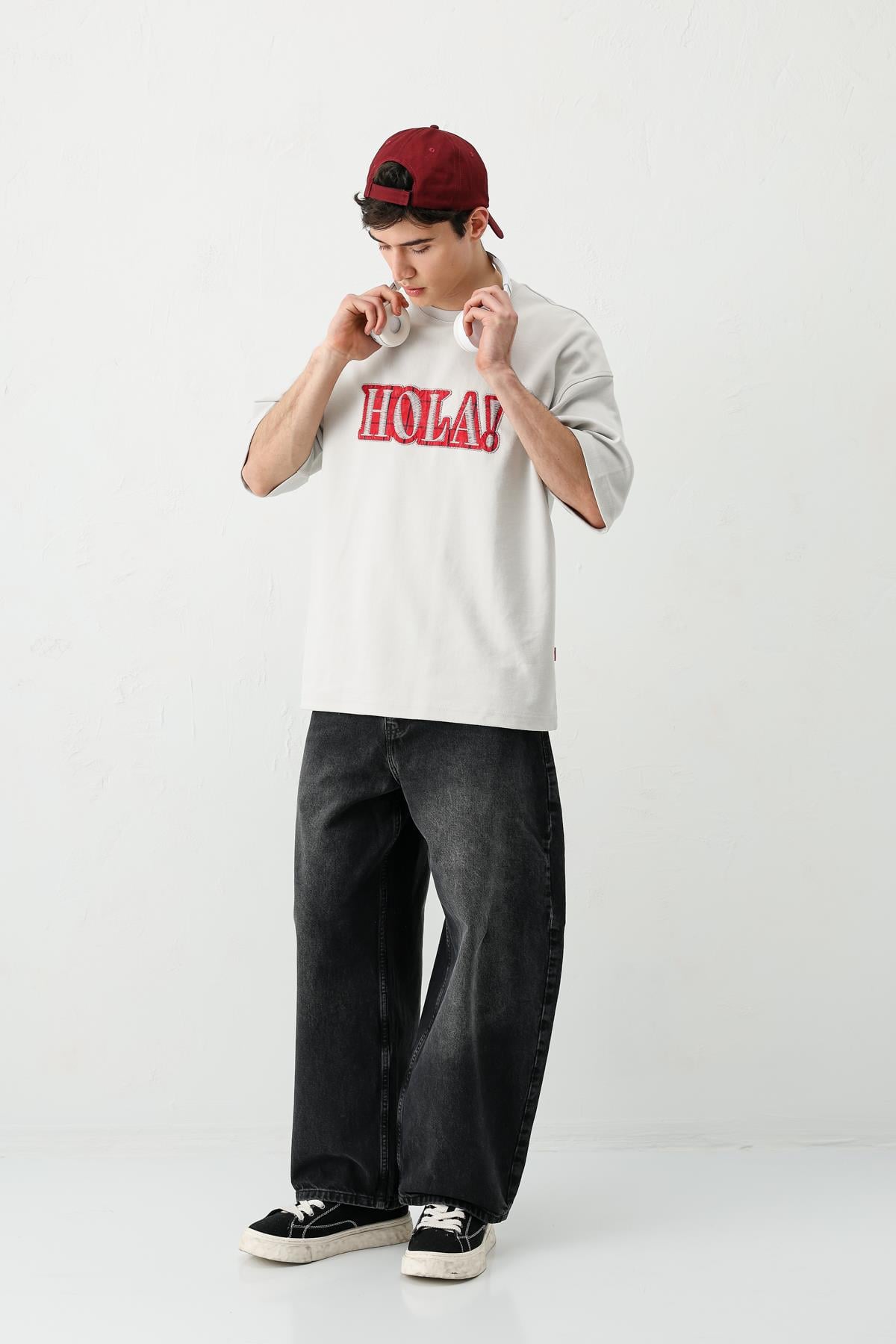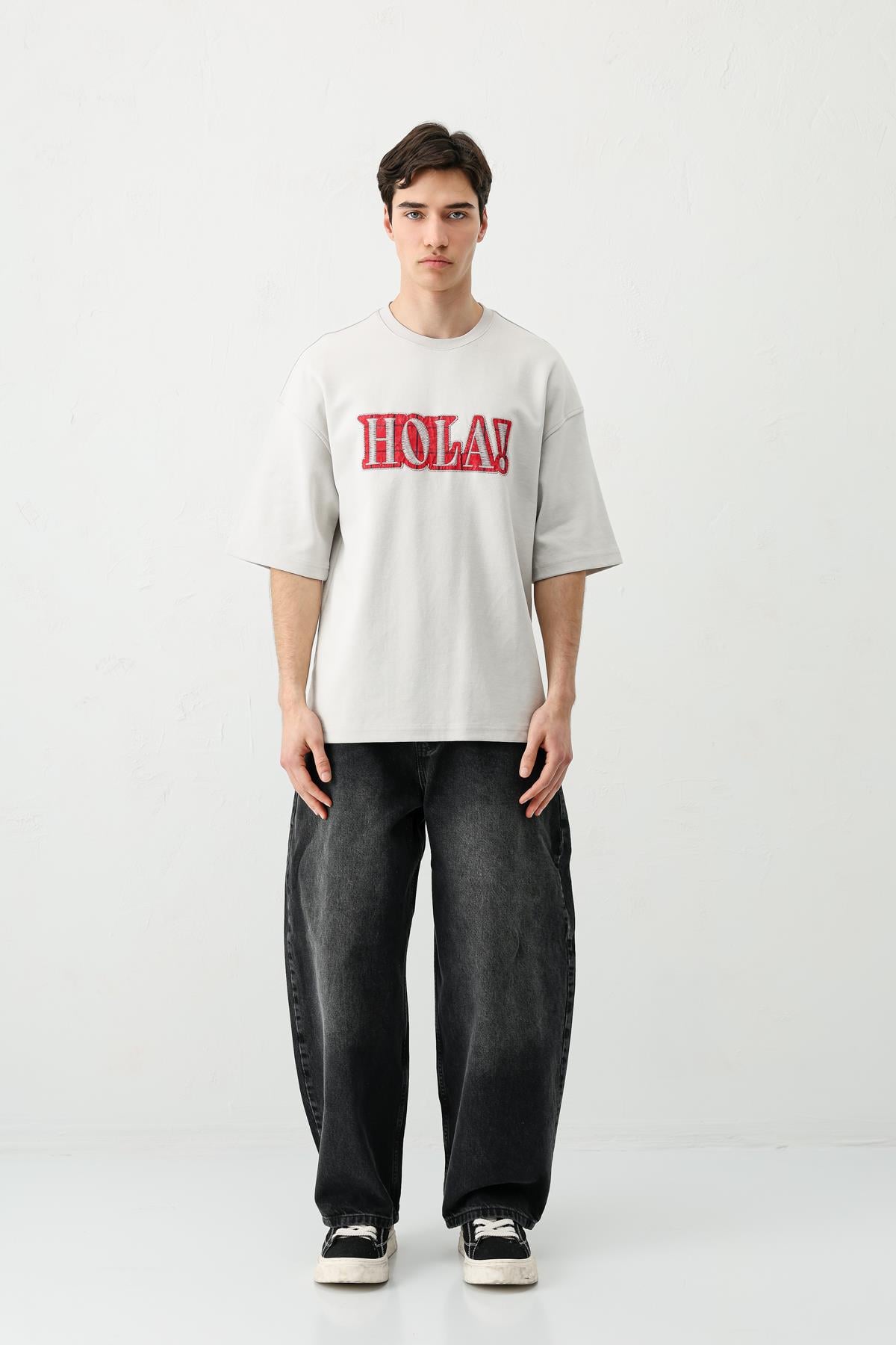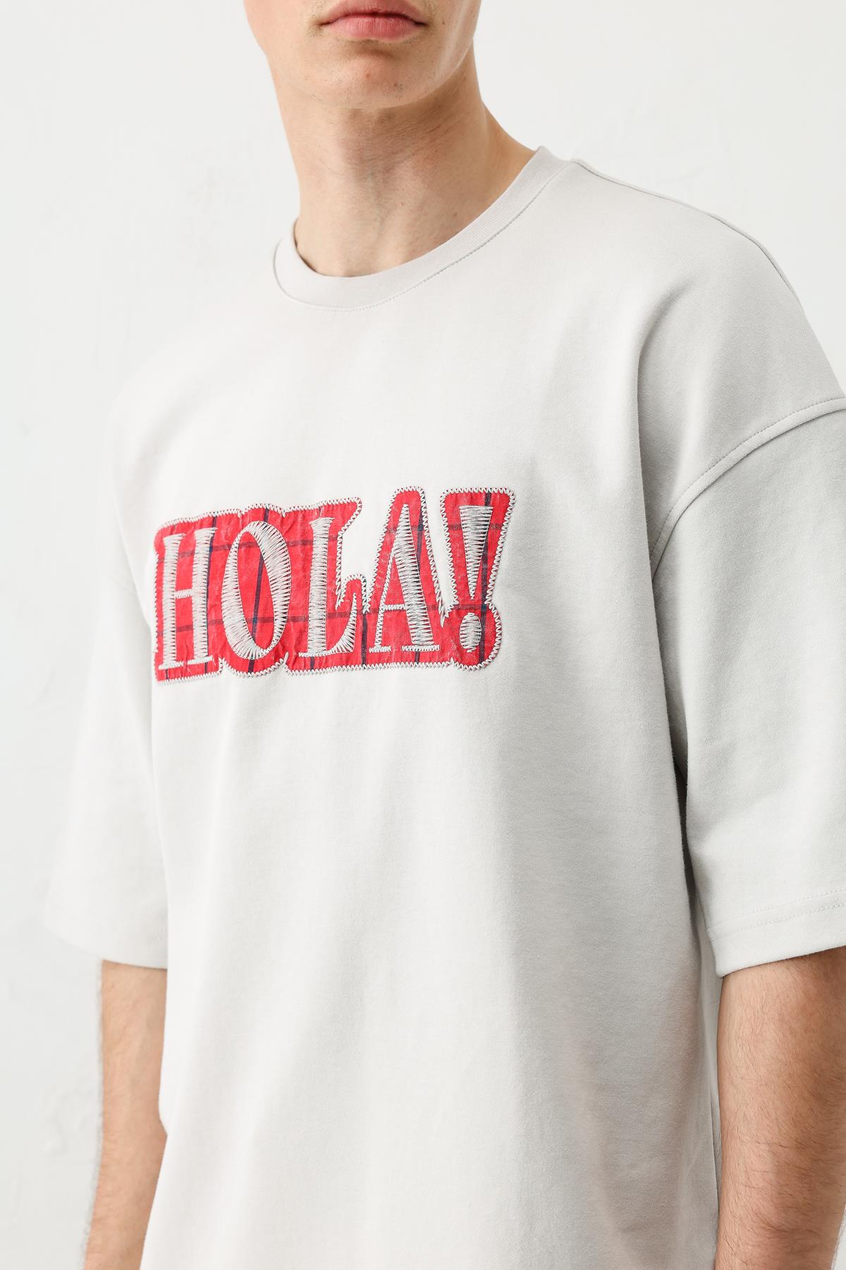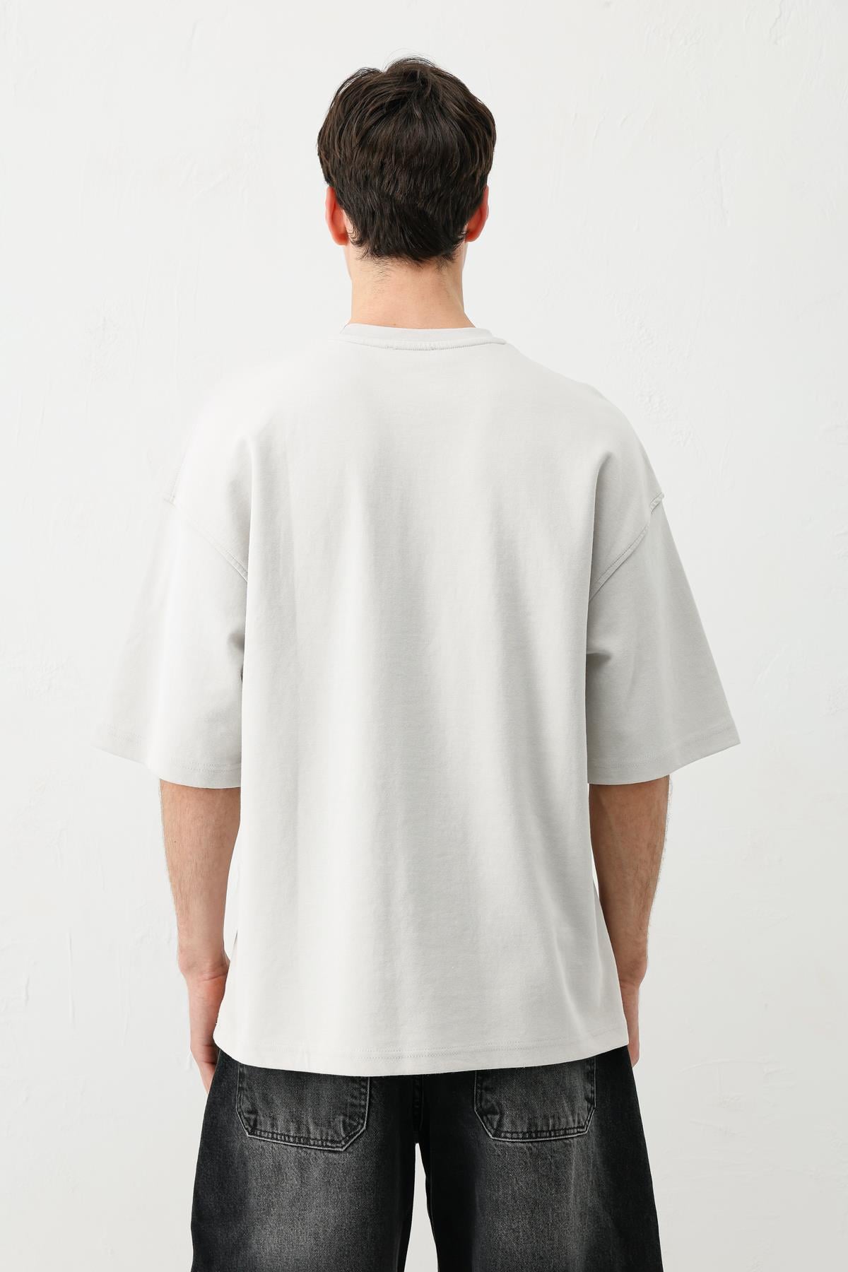 Yıkamalı Baskılı Oversize Tişört Açık Gri (V70-146)