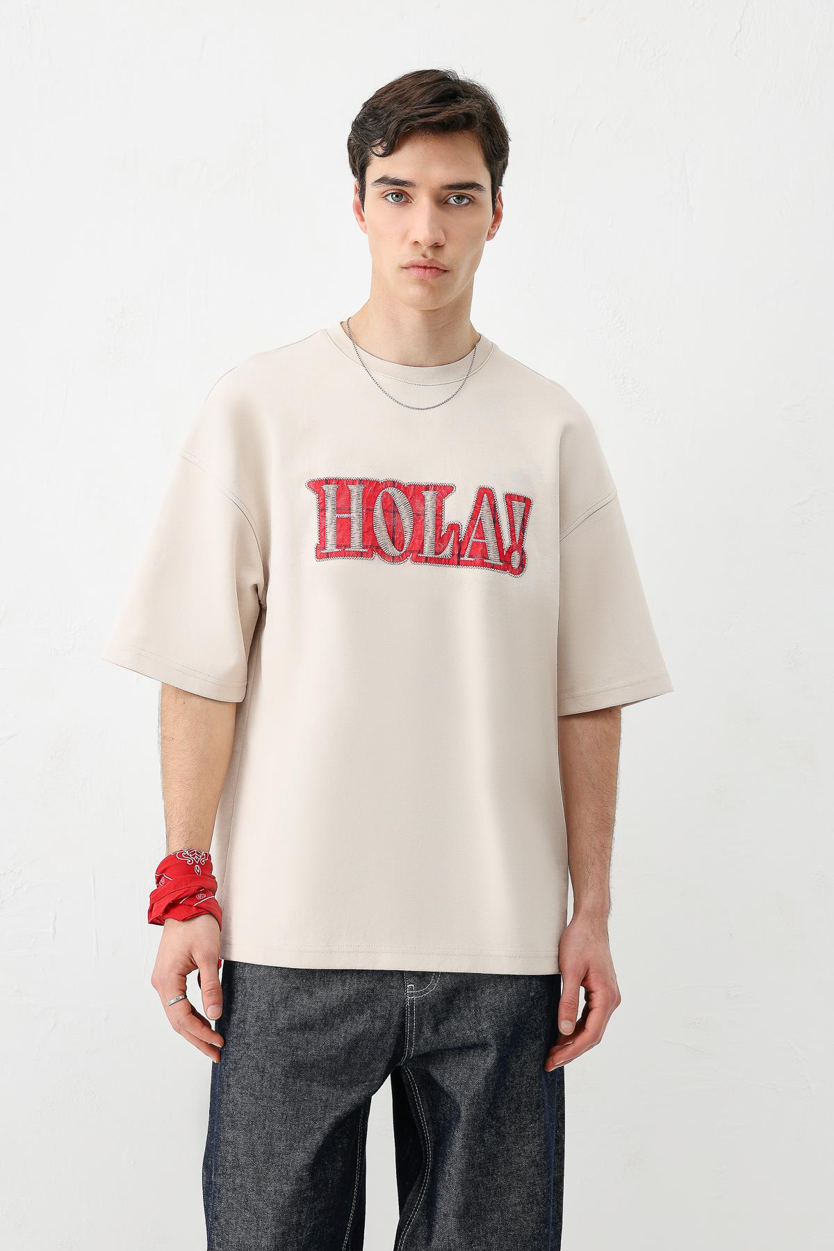 Yıkamalı Baskılı Oversize Tişört Açık Taş (V70-146)