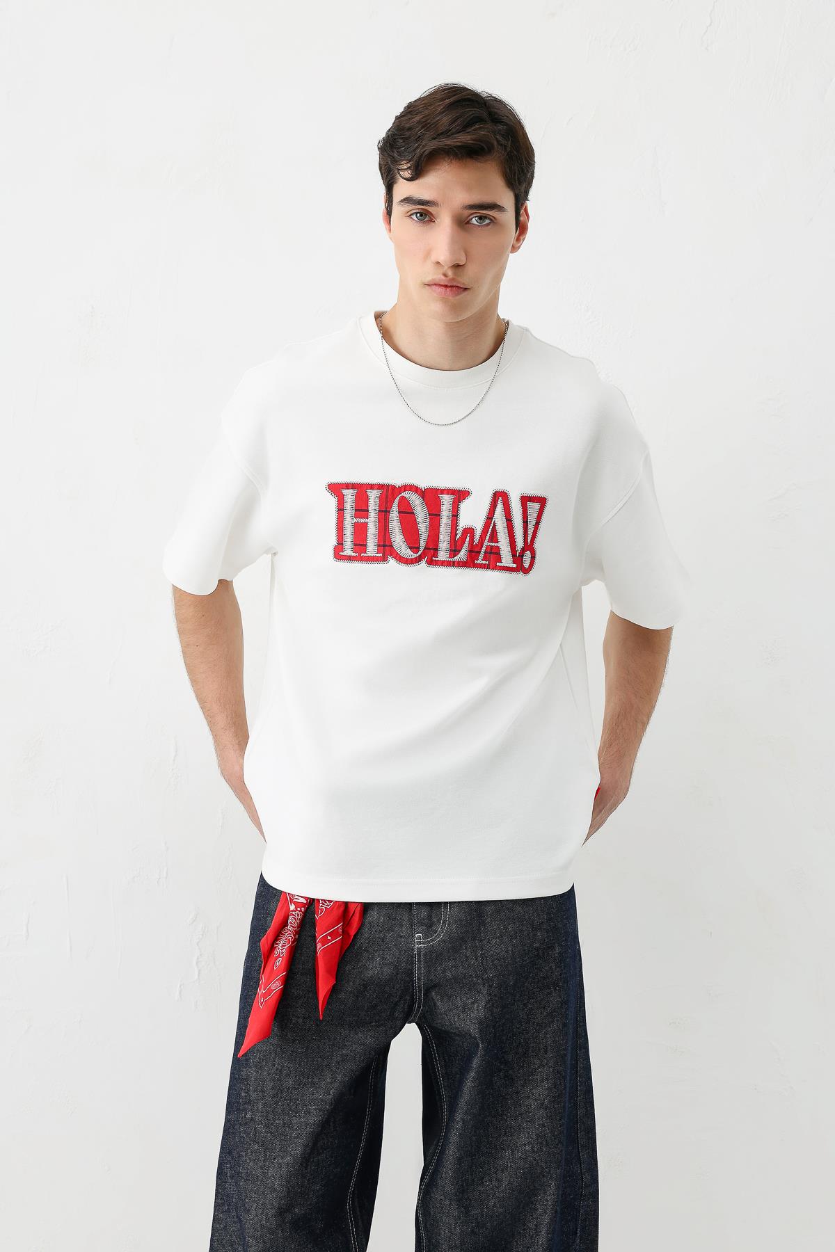 Yıkamalı Baskılı Oversize Tişört Ekru (V70-146)