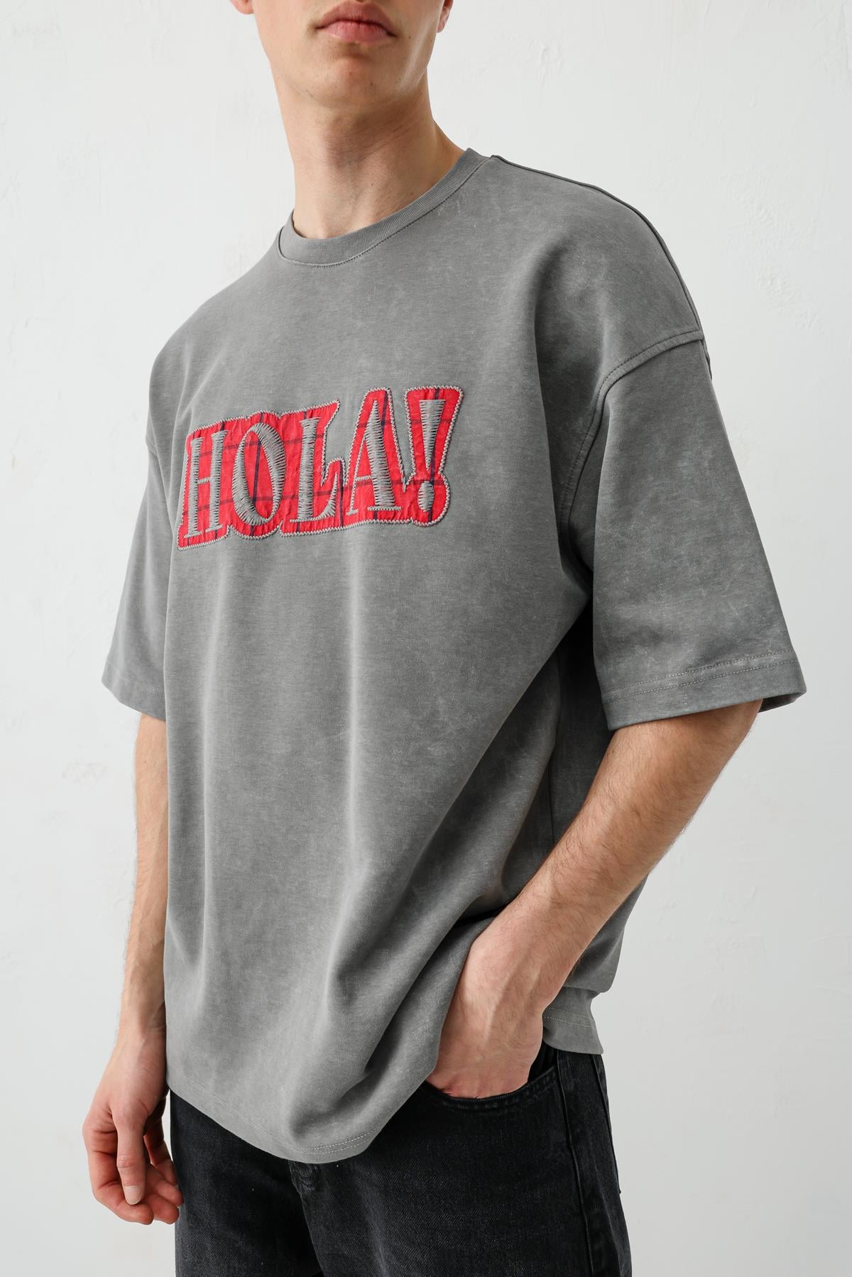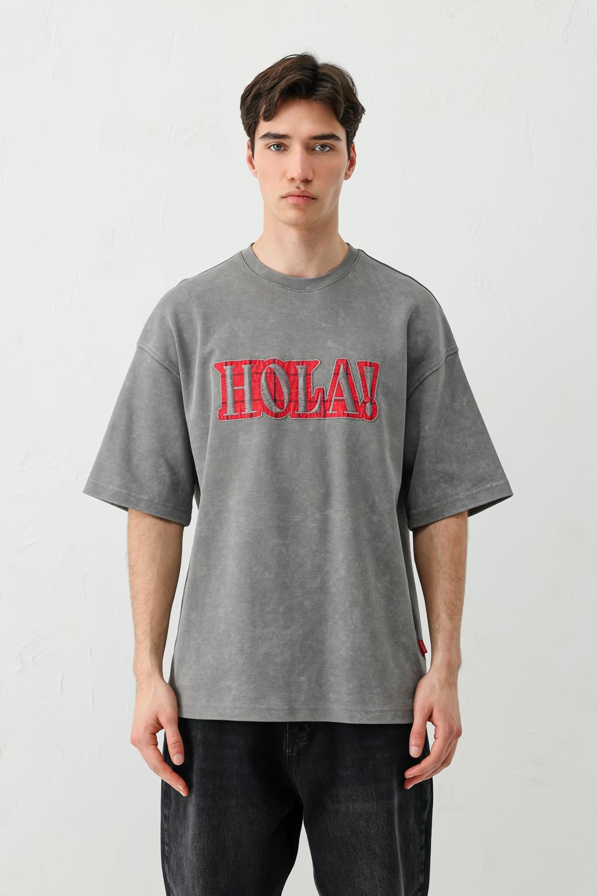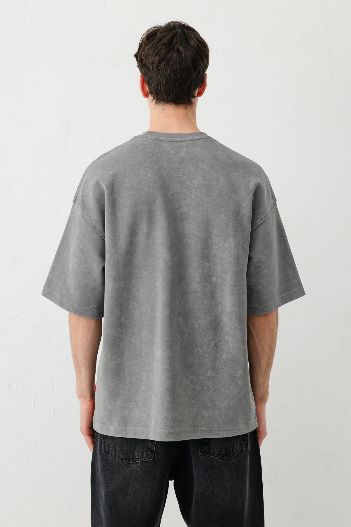 Yıkamalı Baskılı Oversize Tişört Füme (V70-146)