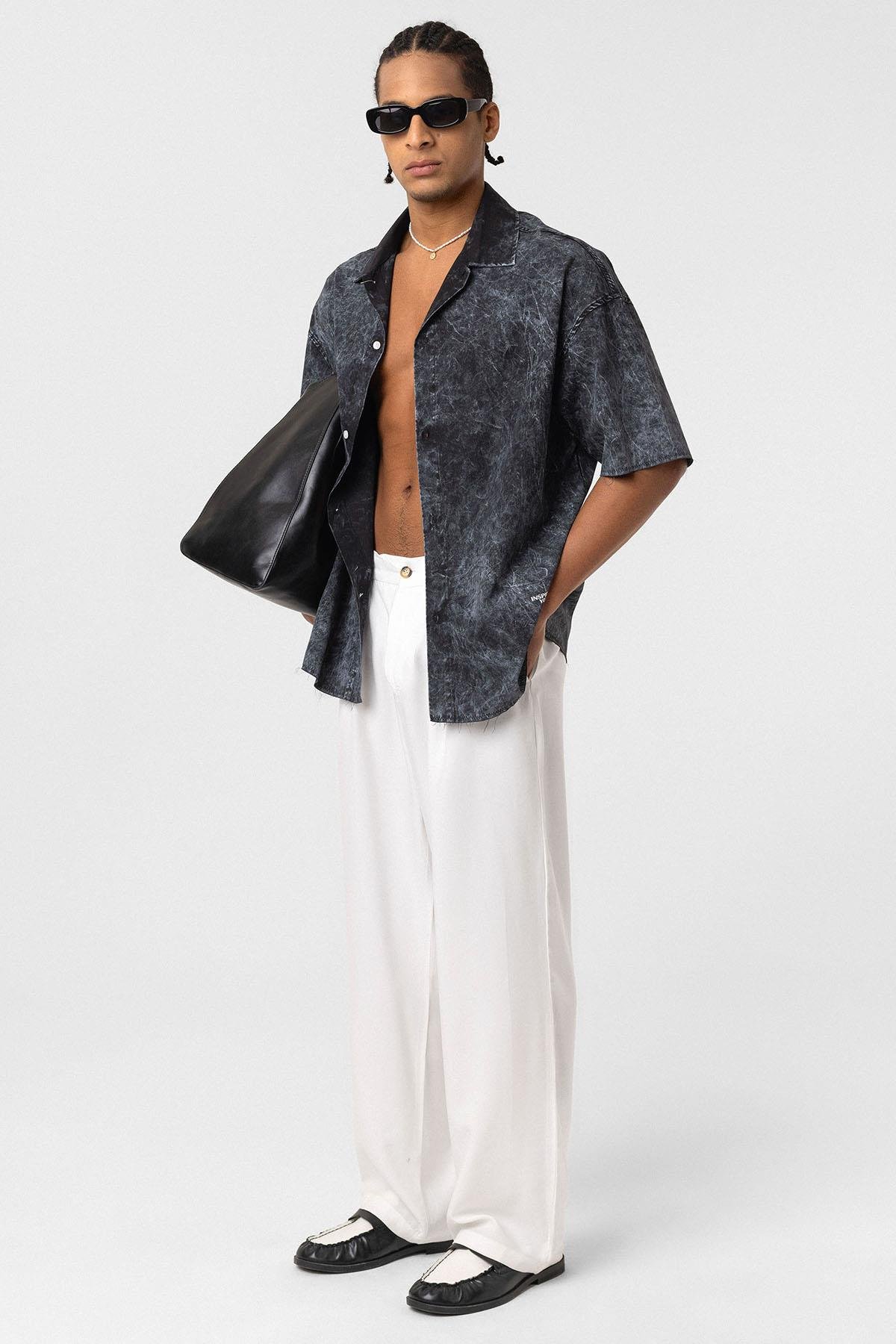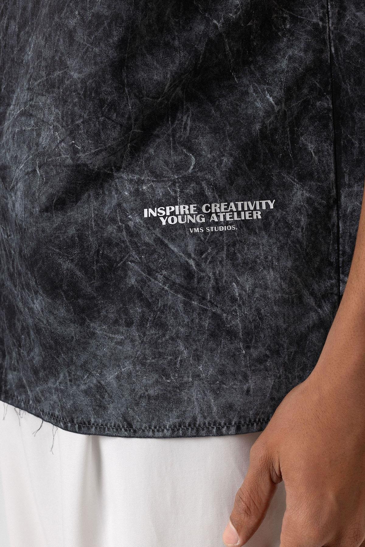 Yıkamalı Yazı Baskılı Oversize Kısa Kol Gömlek Siyah (V40-43)