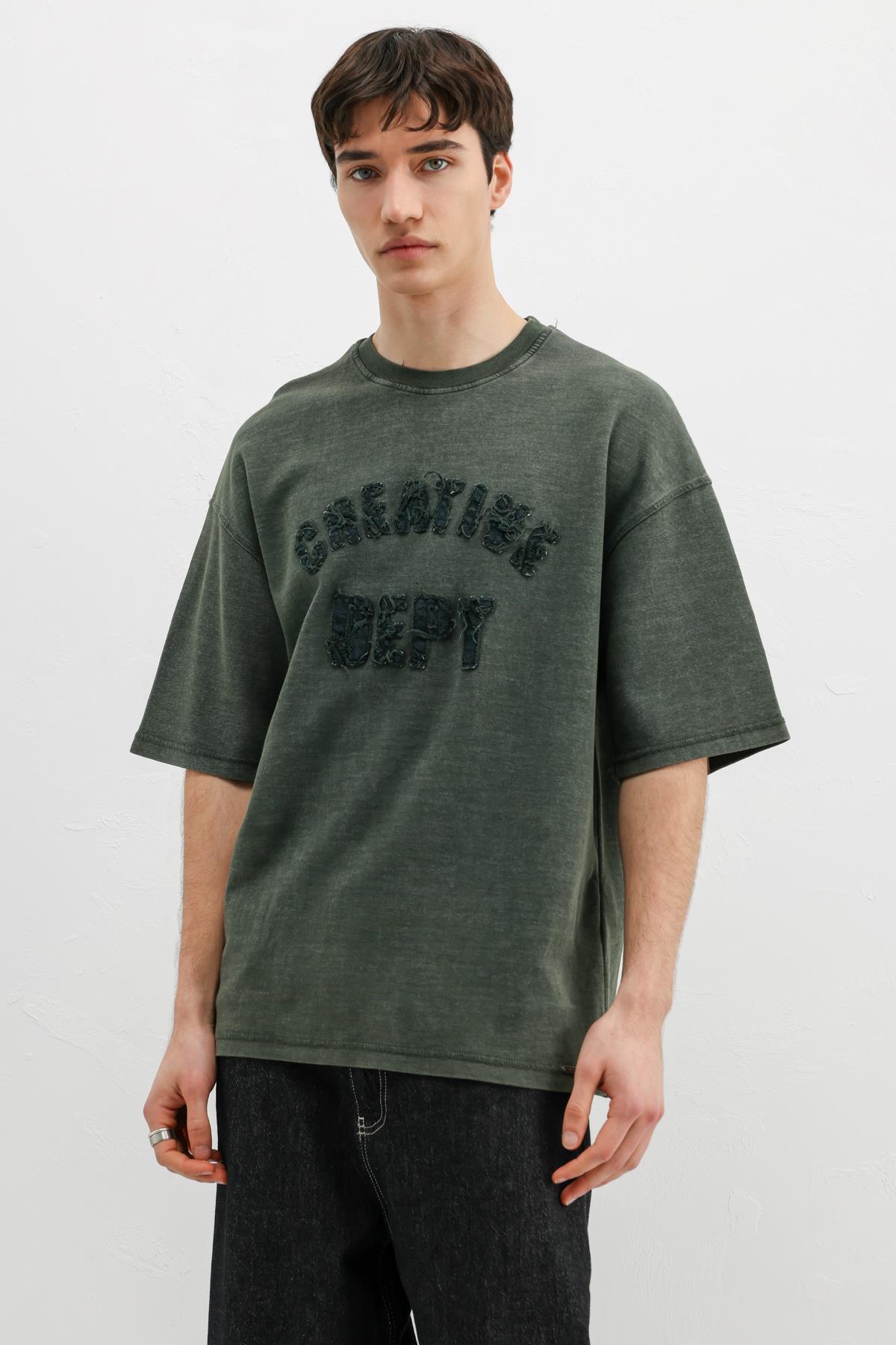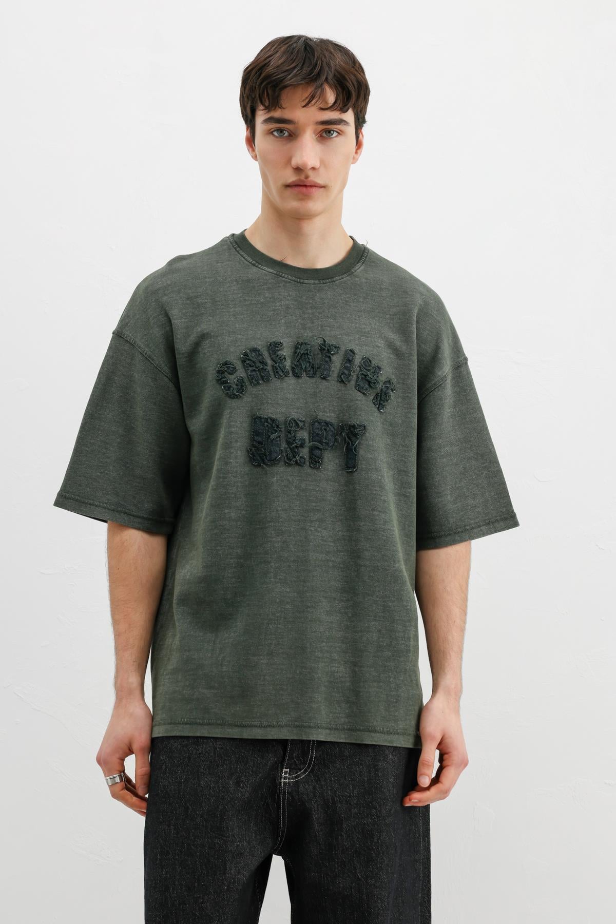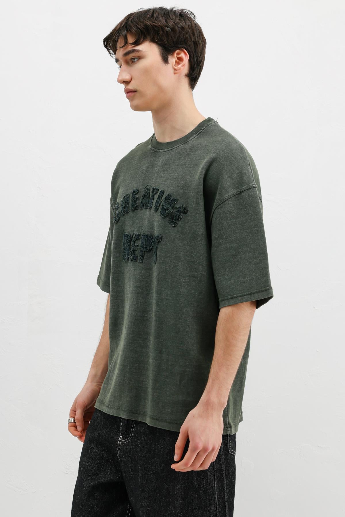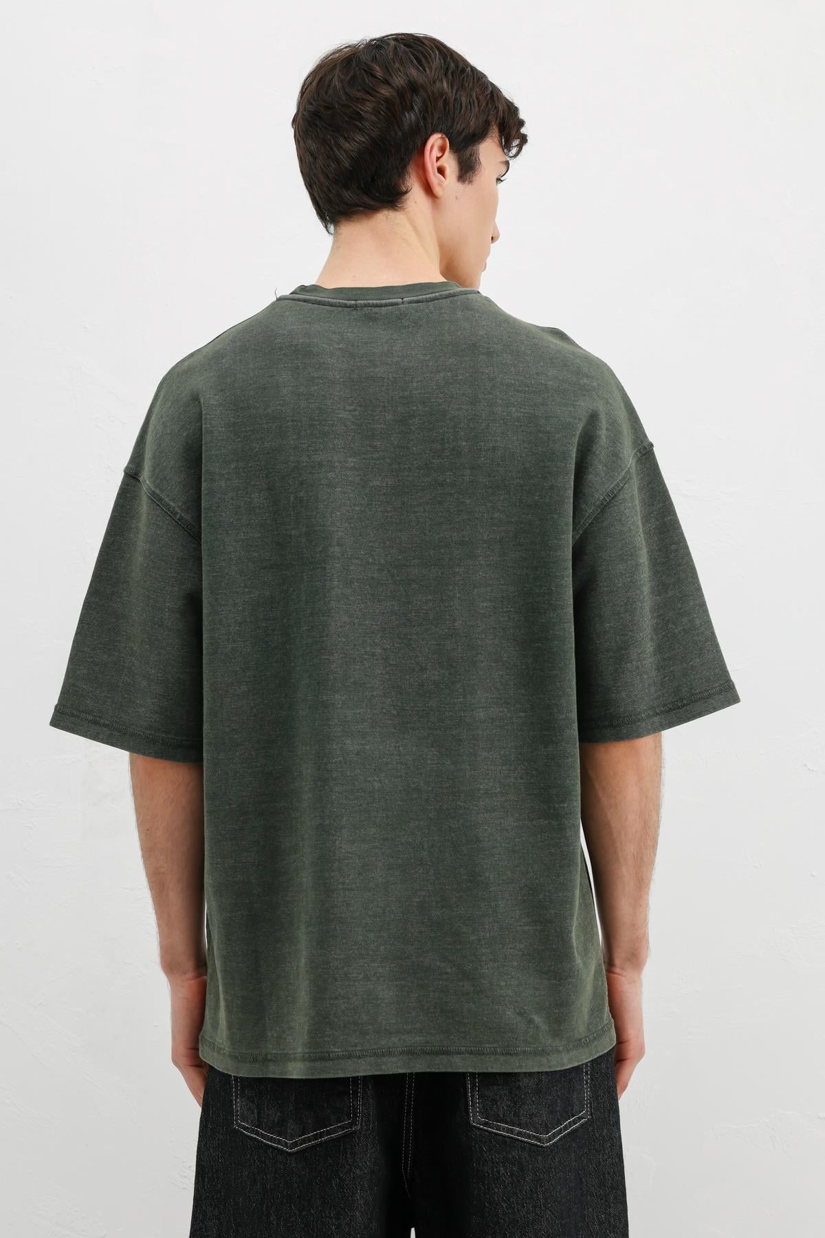 Yıkamalı Yazı Baskılı Oversize Tişört Nefti (V70-147)