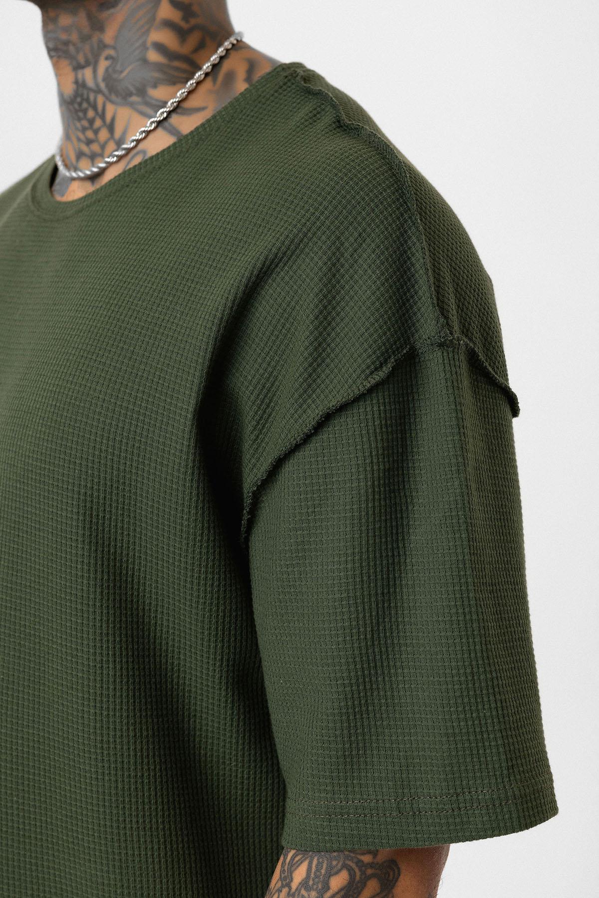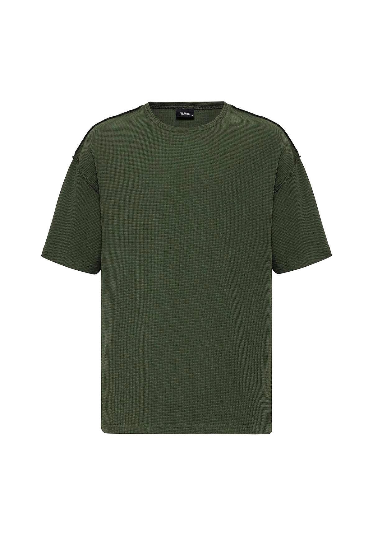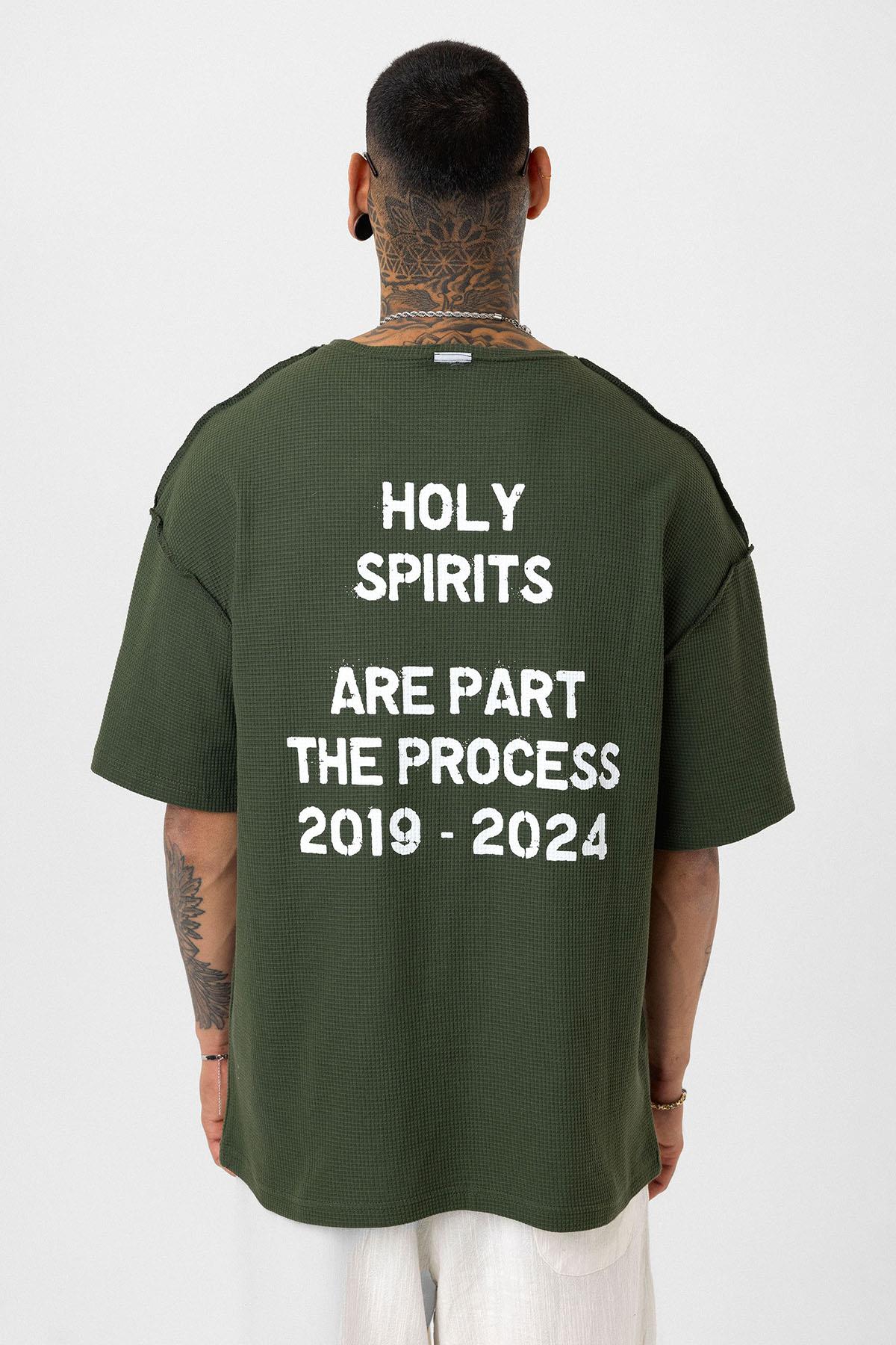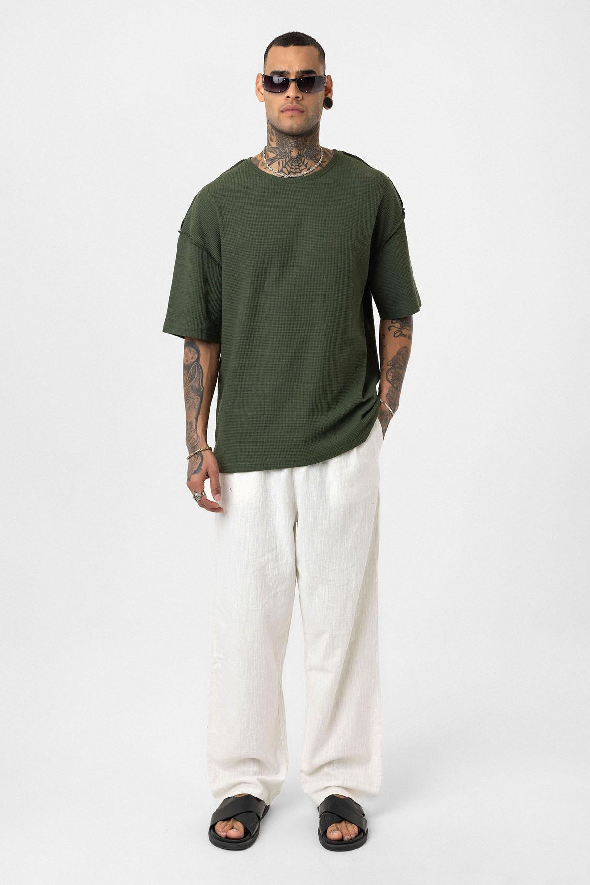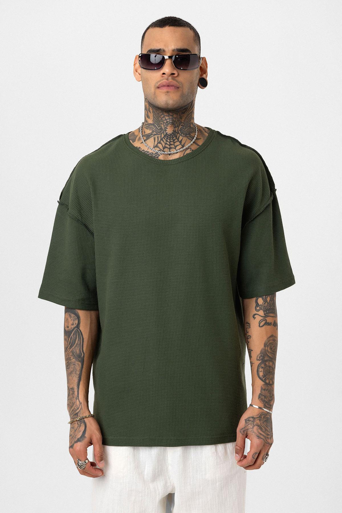 Arka Yazı Baskılı Oversize Triko Tişört Haki (30-861)