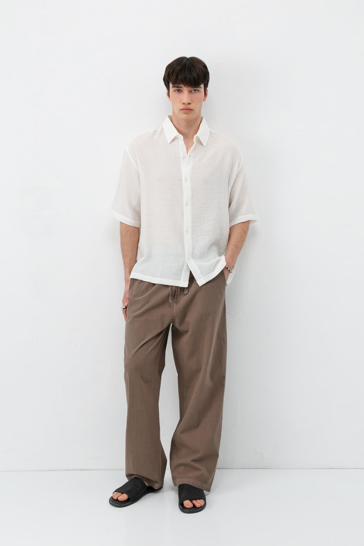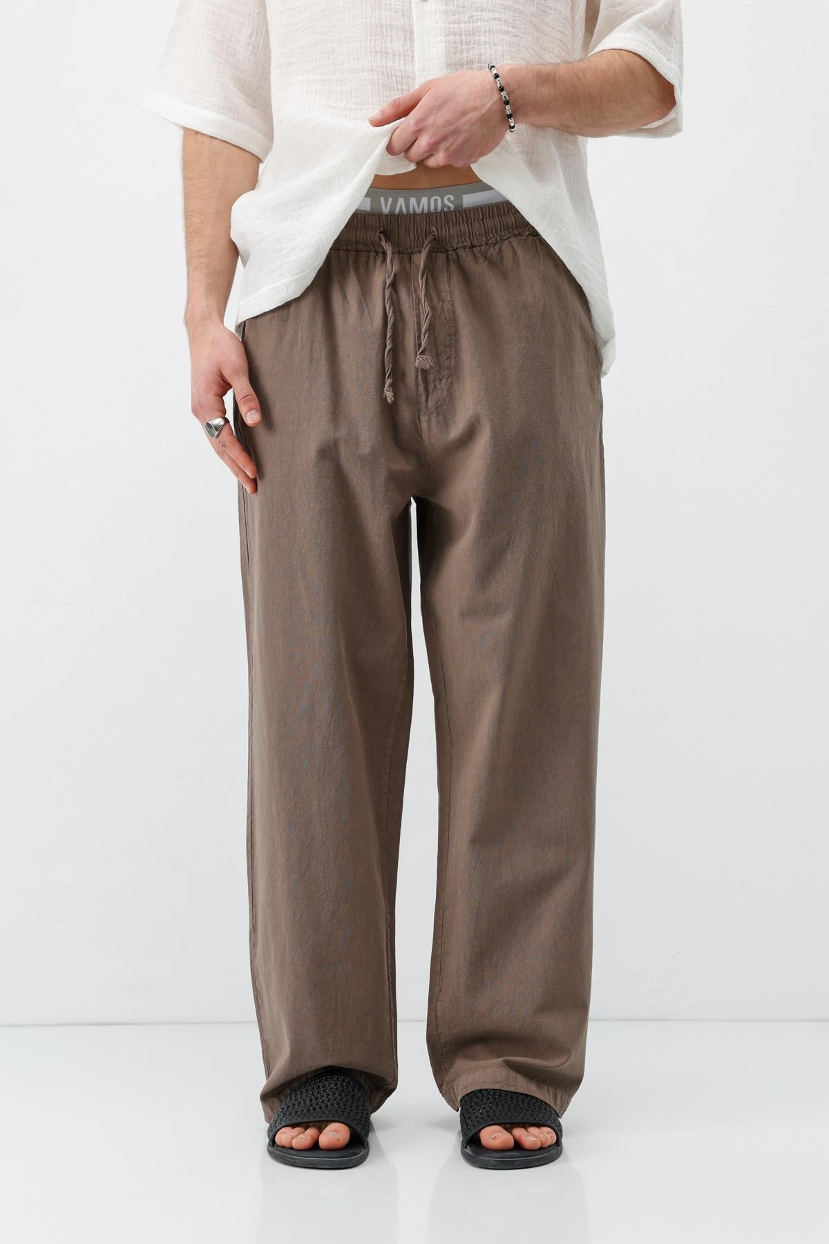 Bel Lastikli Baggy Fit Keten Pantolon Açık Kahve (V80-22)