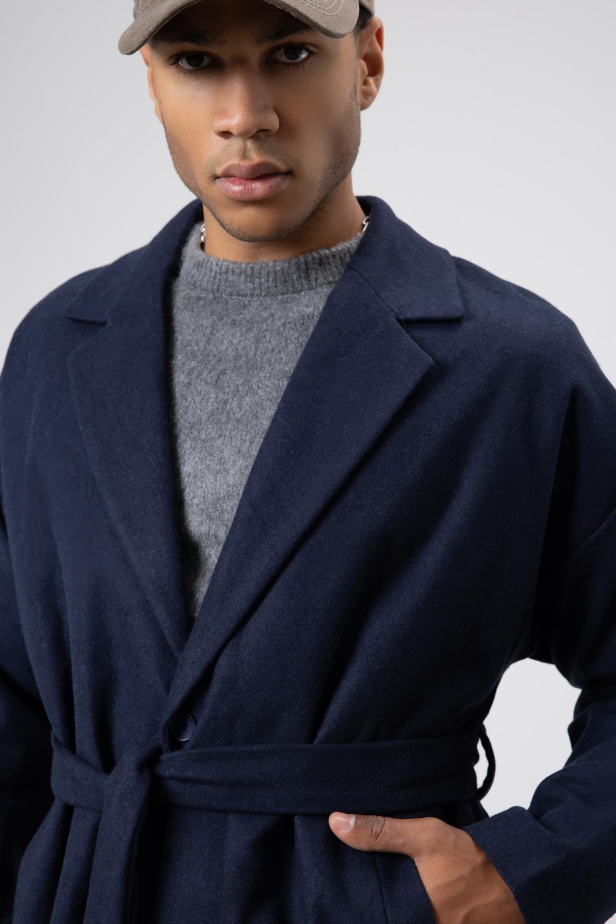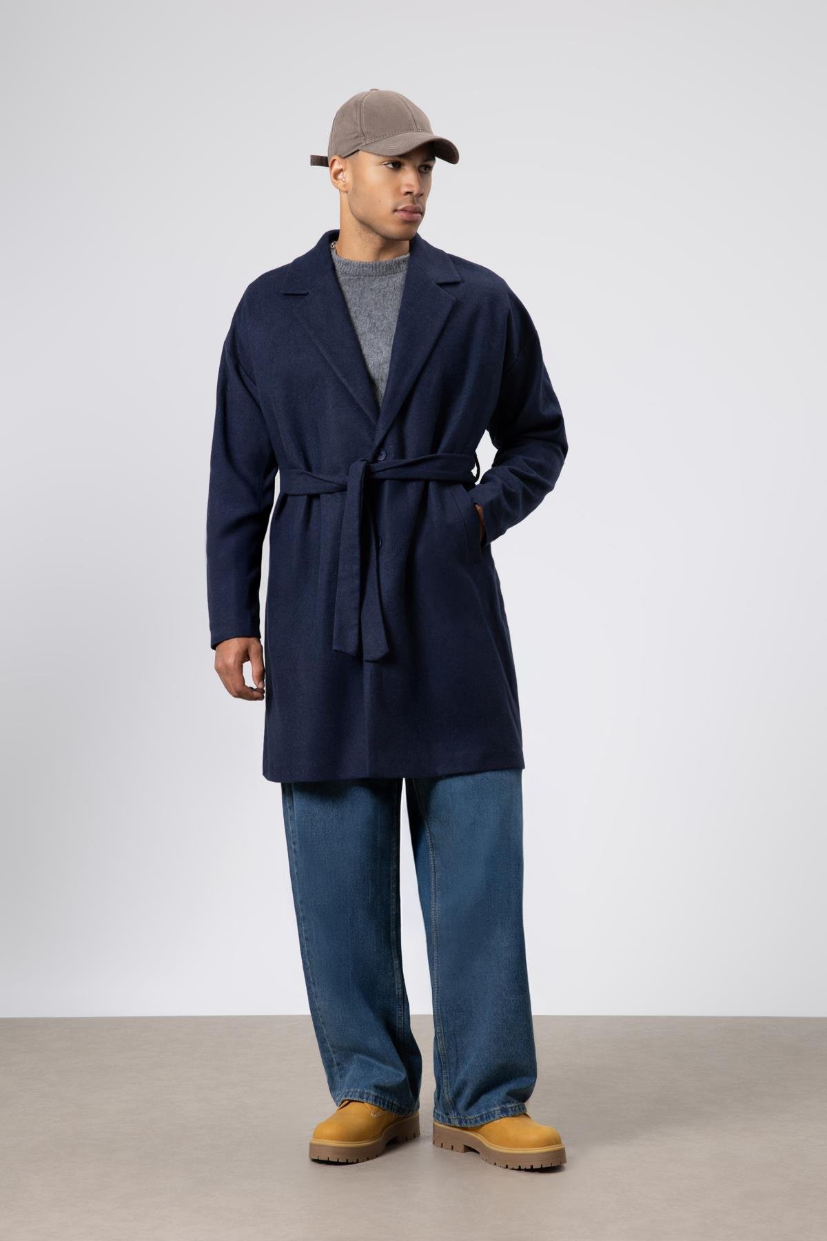 Kemerli Oversize Kaşe Kaban Lacivert (40-139)