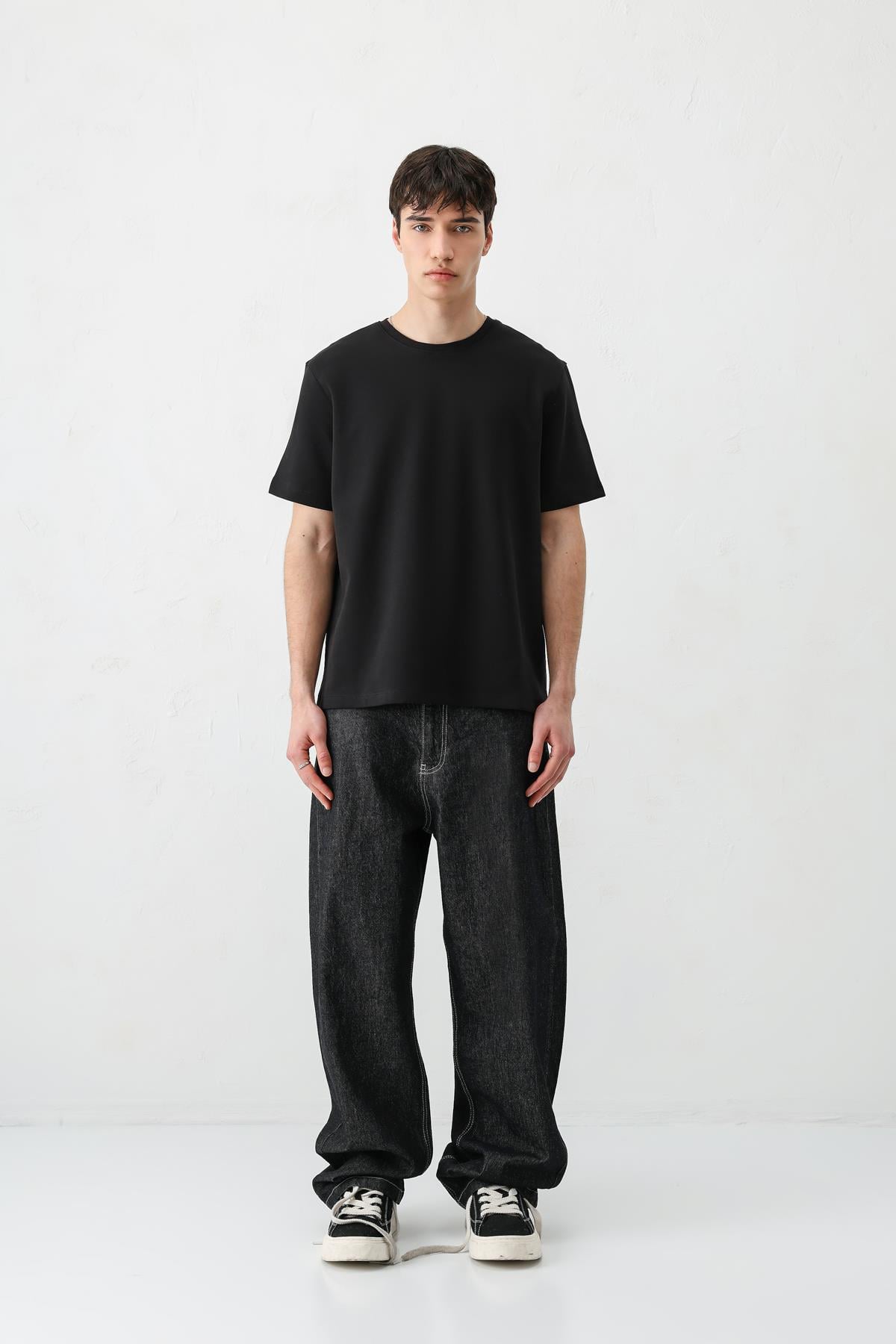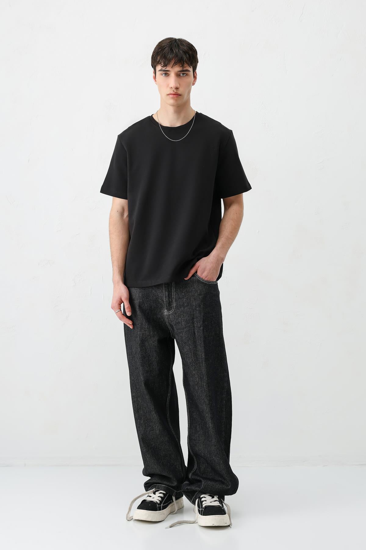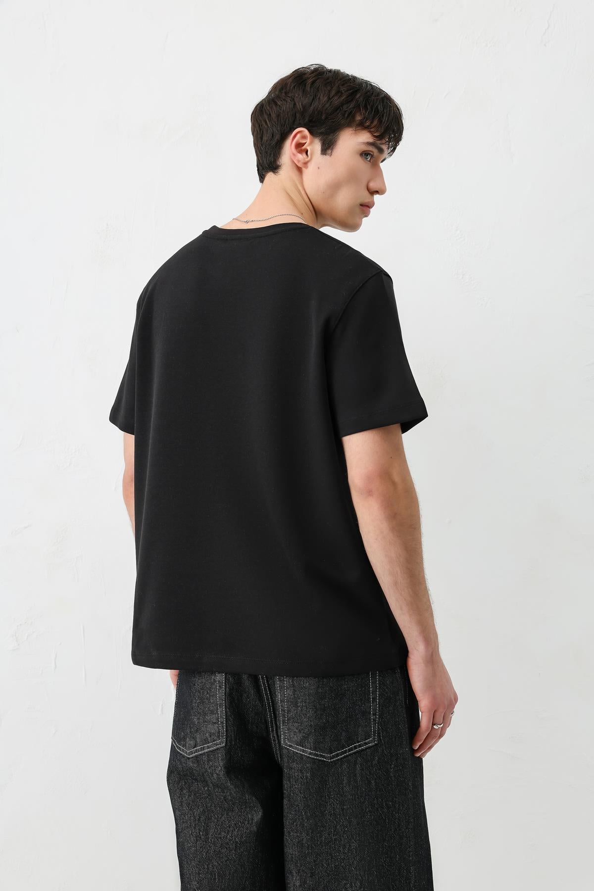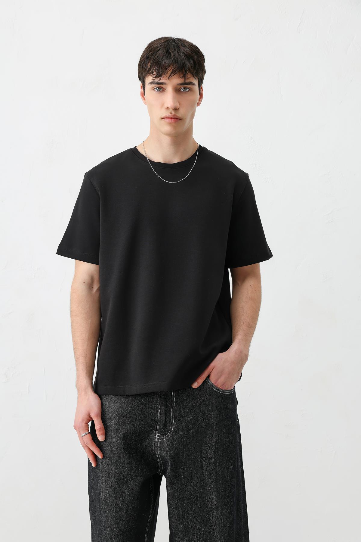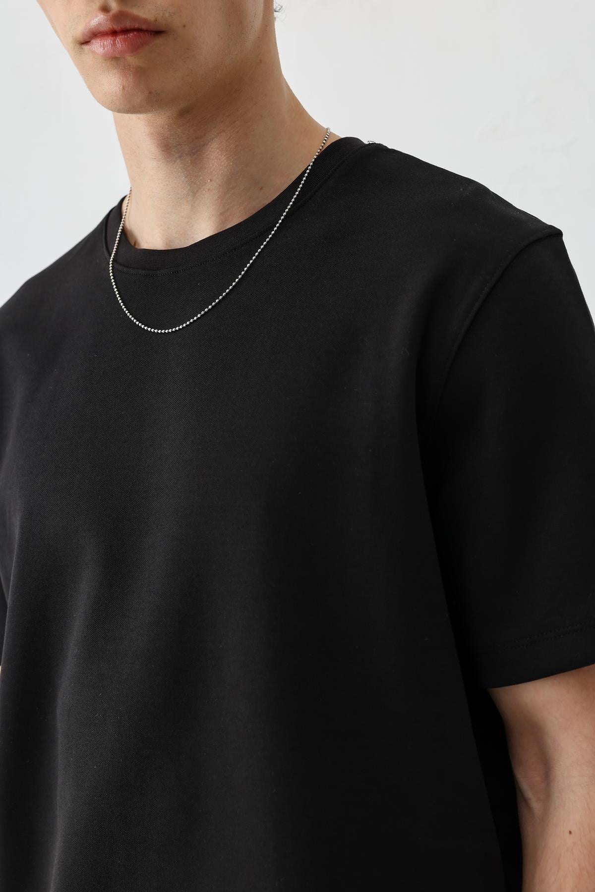 Kısa Kollu Boxy Fit Tişört Siyah (V70-161)