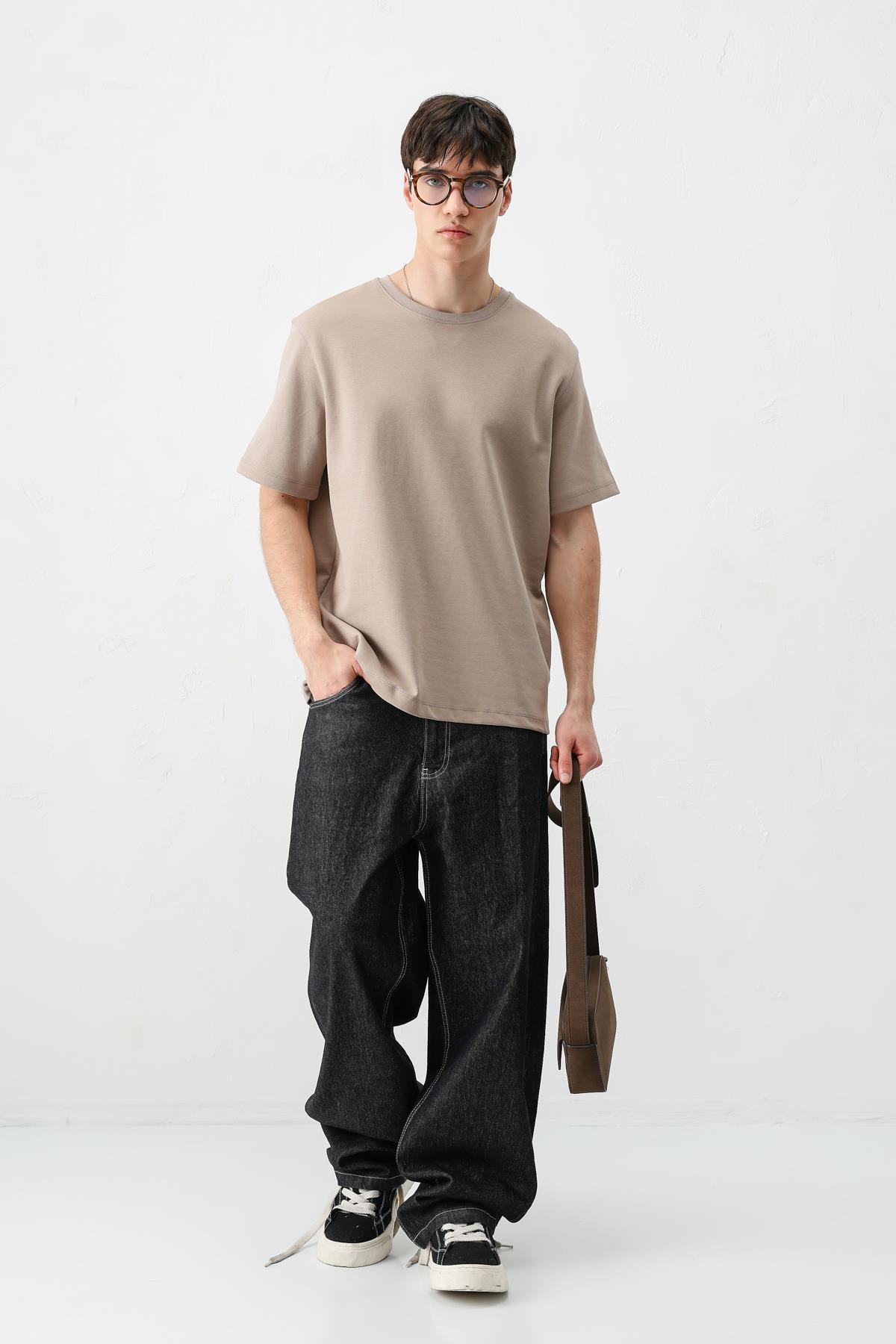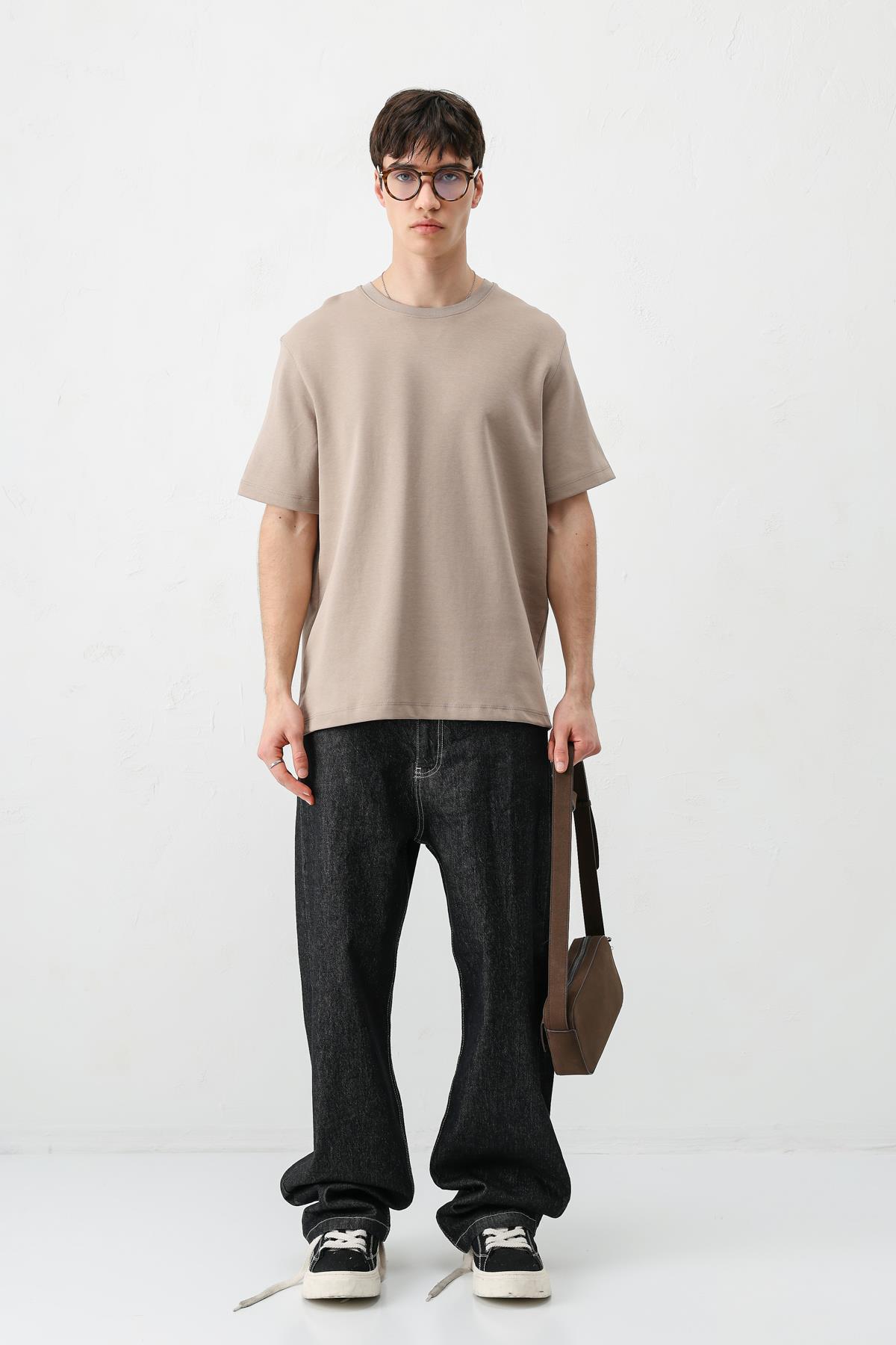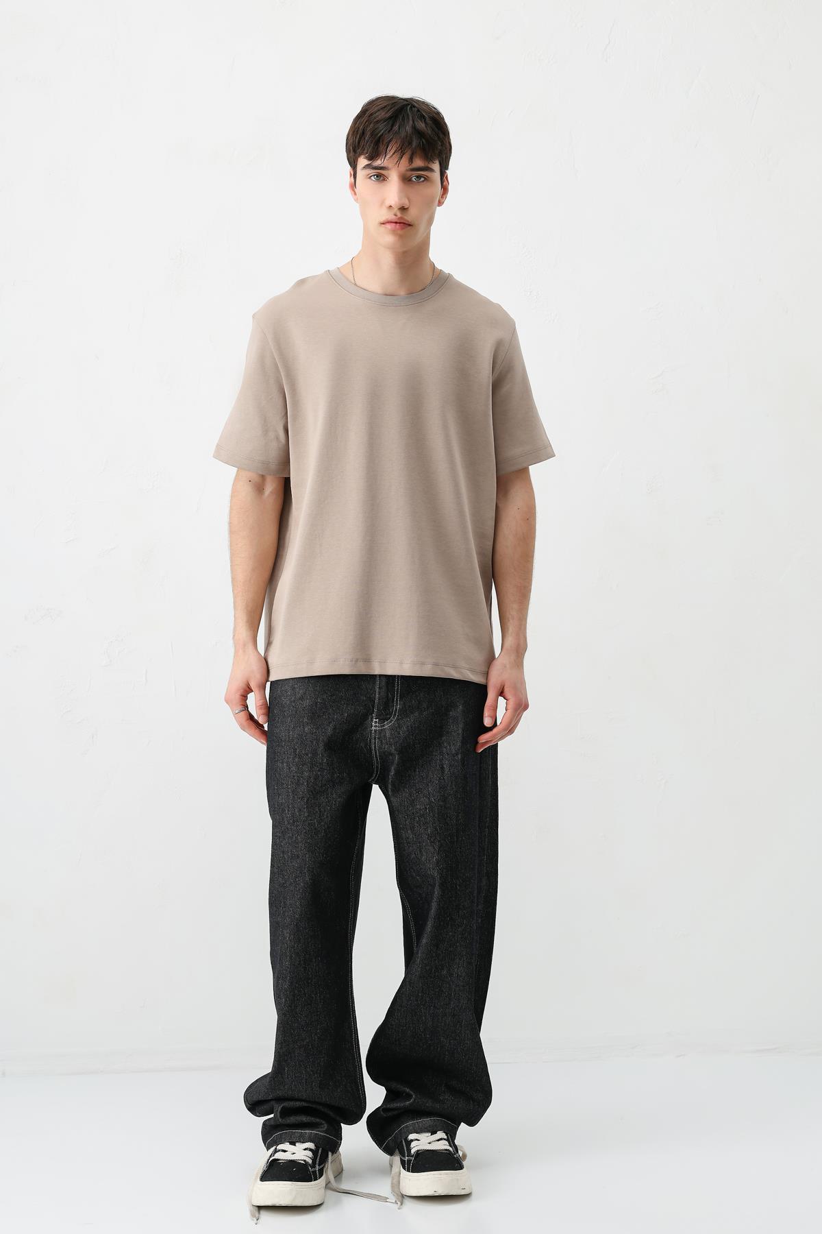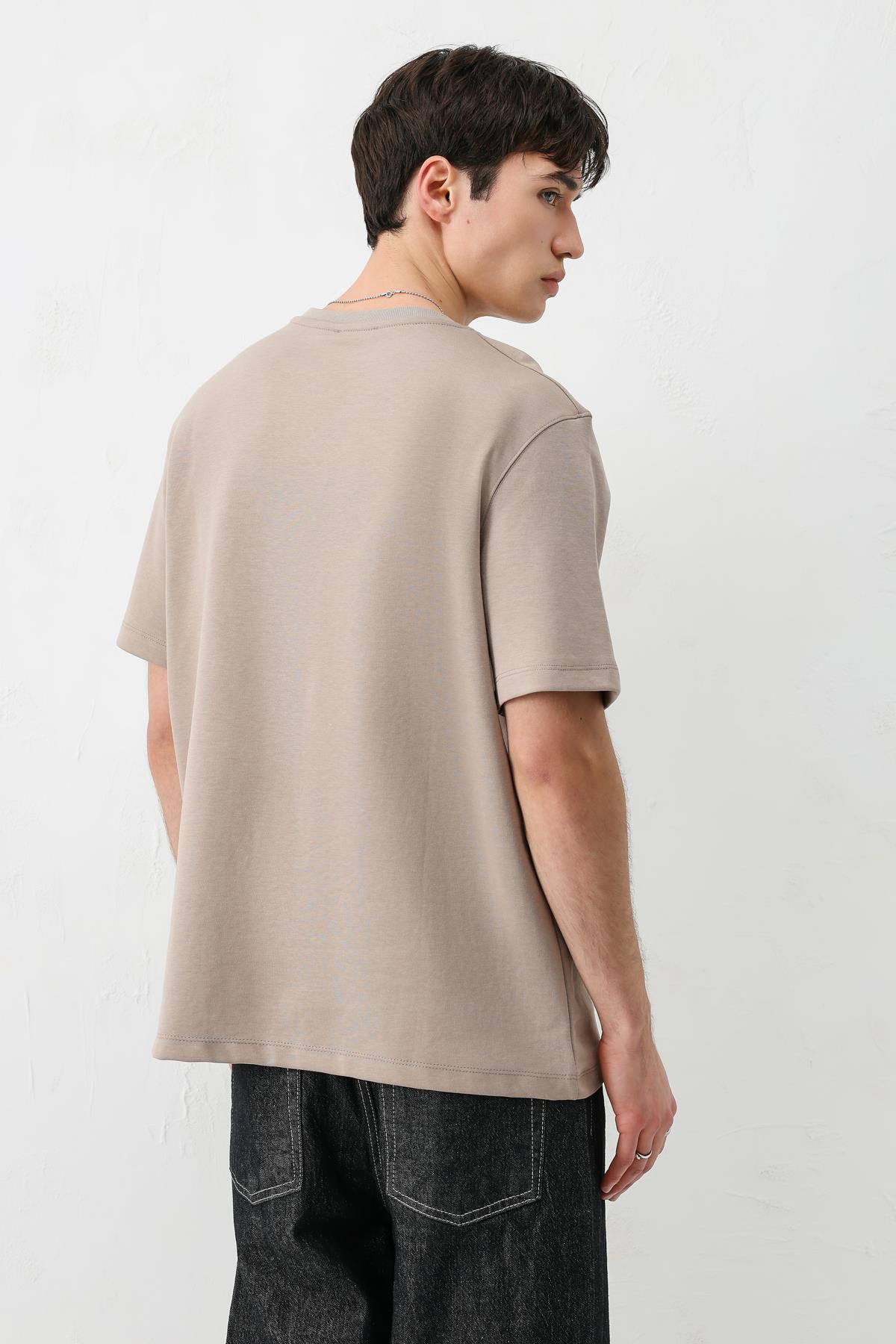 Kısa Kollu Boxy Fit Tişört Vizon (V70-161)