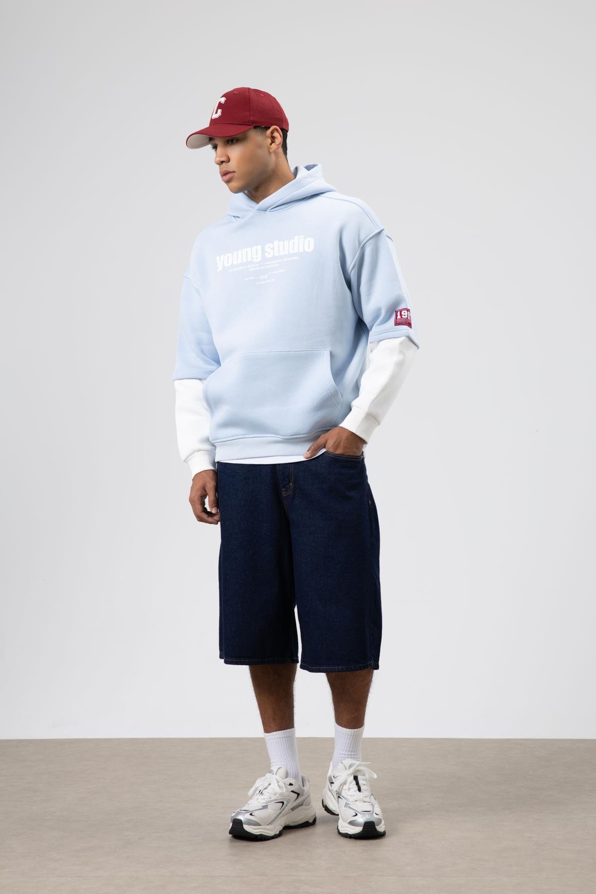 Oversize Baskılı Kapüşonlu Sweatshirt Bebe Mavi (V70-116)