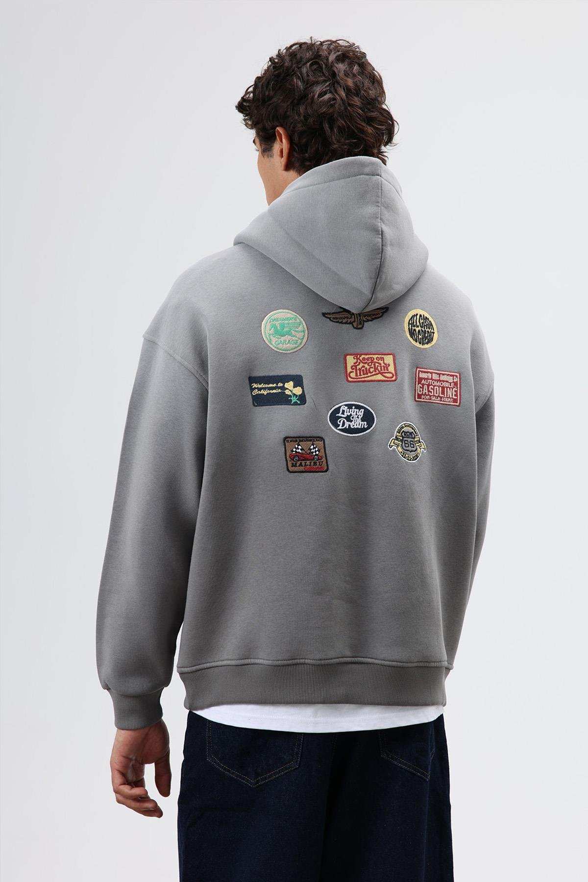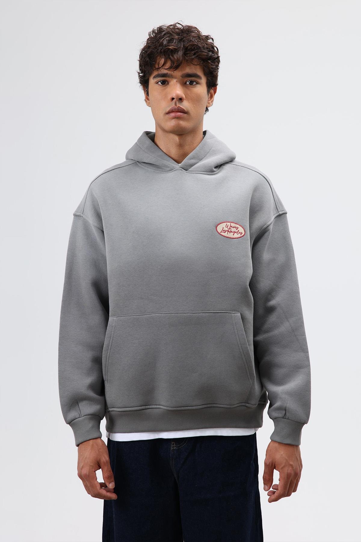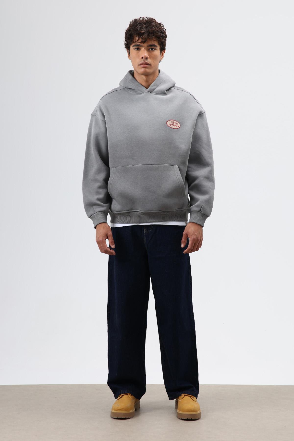 Oversize Baskılı Kapüşonlu Sweatshirt Füme (V70-98)